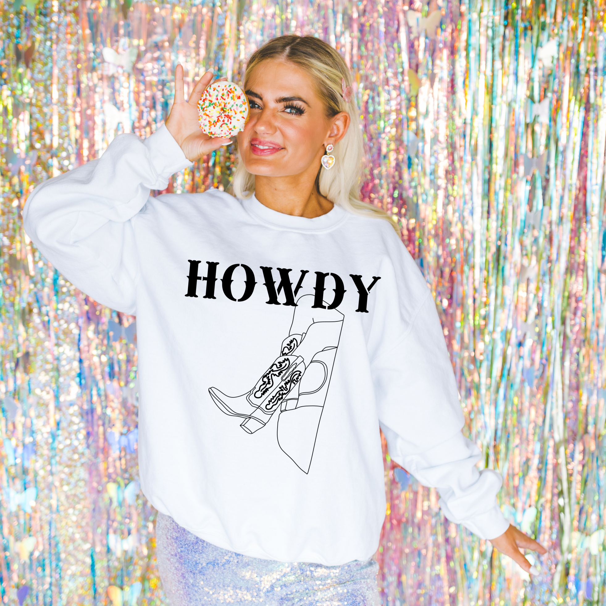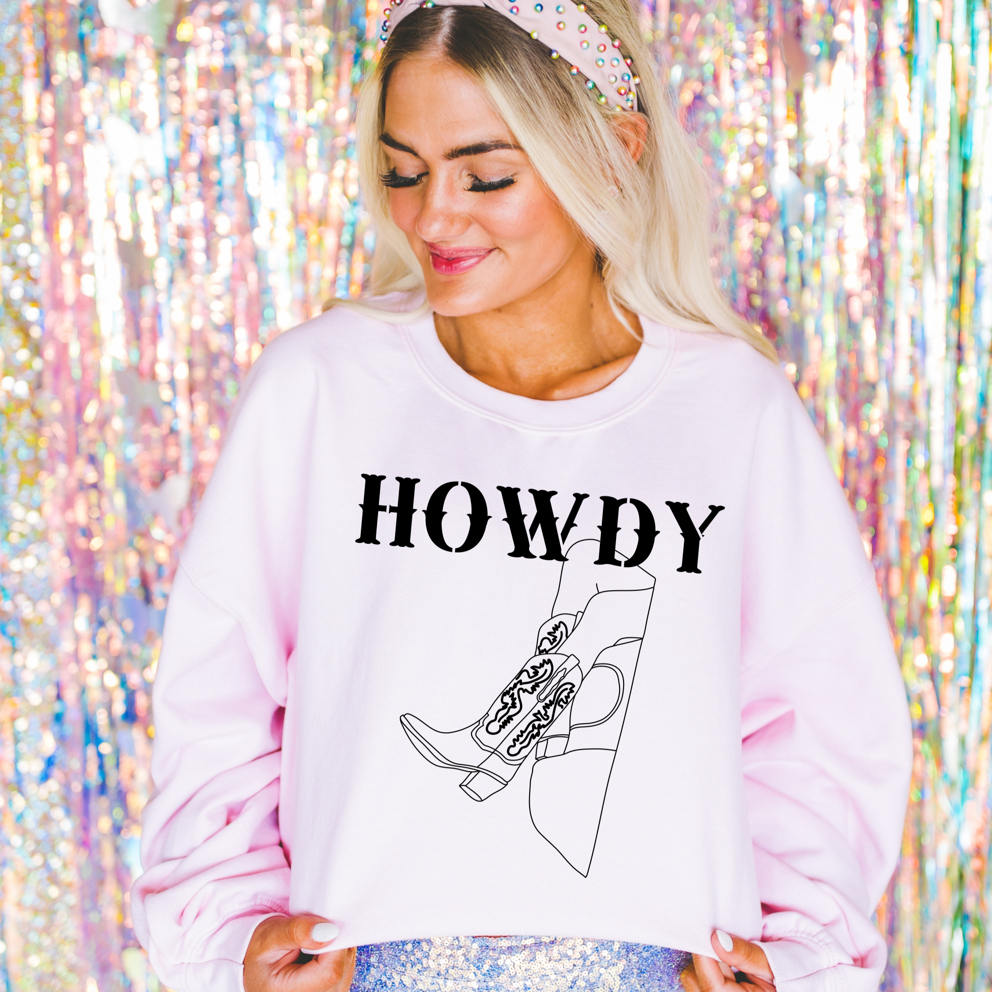Super cute HOWDY western boots sweatshirt. Custom handmade to order. For an oversized graphic tee please size up!