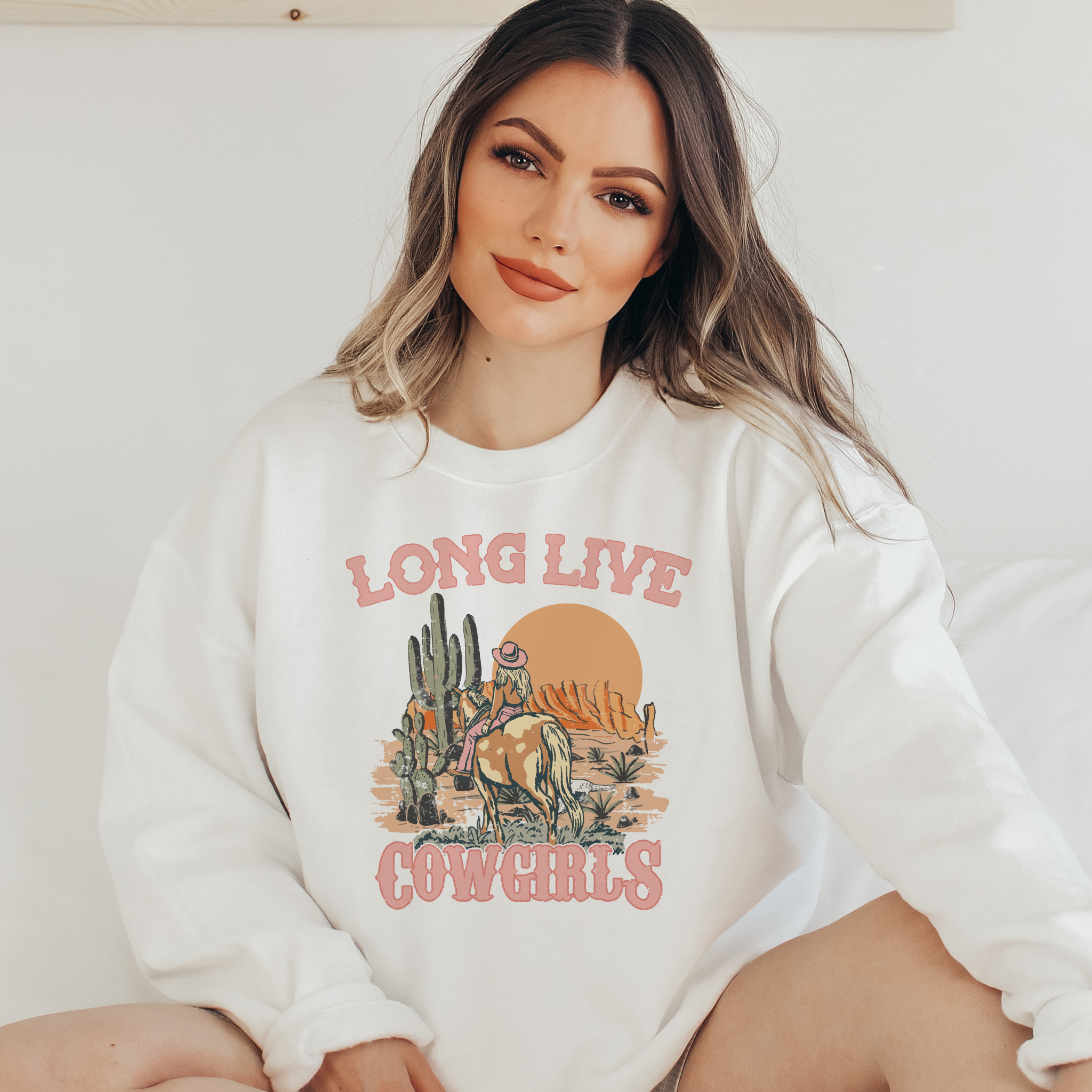 Introducing our cowgirl-inspired sweatshirt, featuring a striking image of a cowgirl and her horse, alongside the words "Long Live Cowgirls" in bold typography. This unique piece is perfect for those who love western-inspired fashion and want to show their support for the fearless and independent spirit of cowgirls.