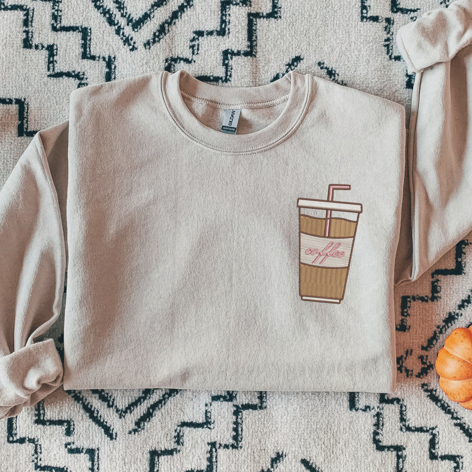 Grab your next iced coffee wearing our Embroidered Iced Coffee Script Crewneck Sweatshirt!