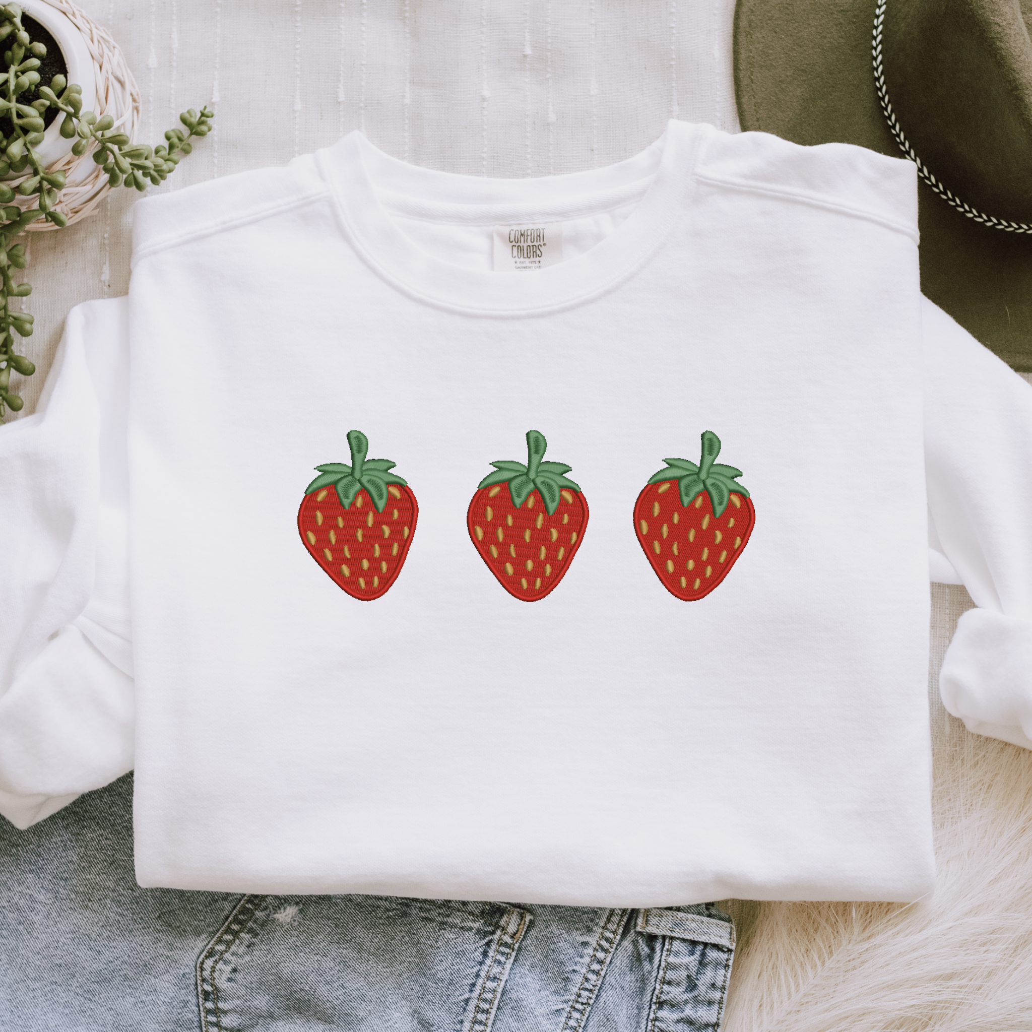 How cute are these embroidered strawberry sweatshirts?! Choose between red and pink strawberries and let us know in the text box below.