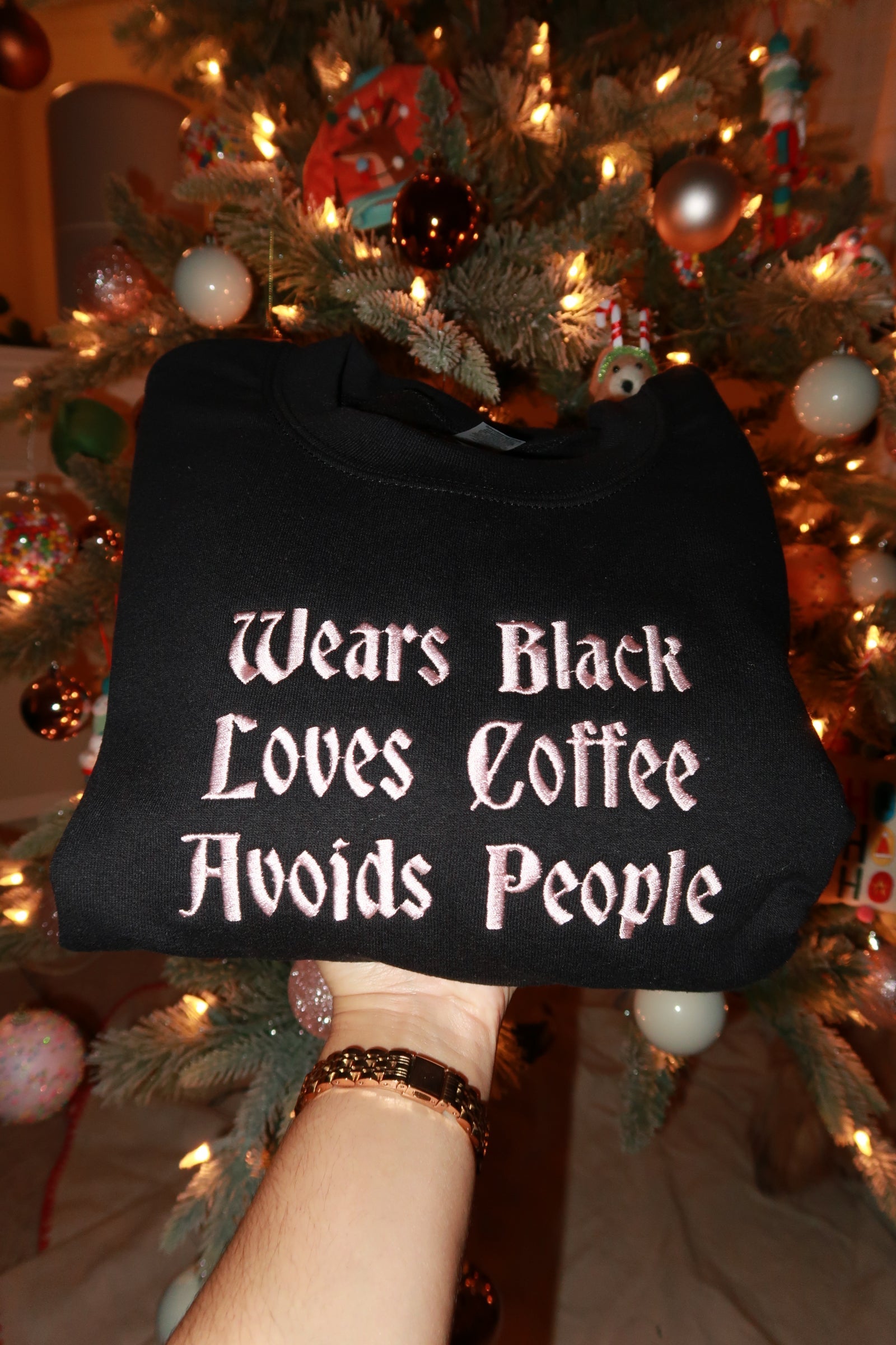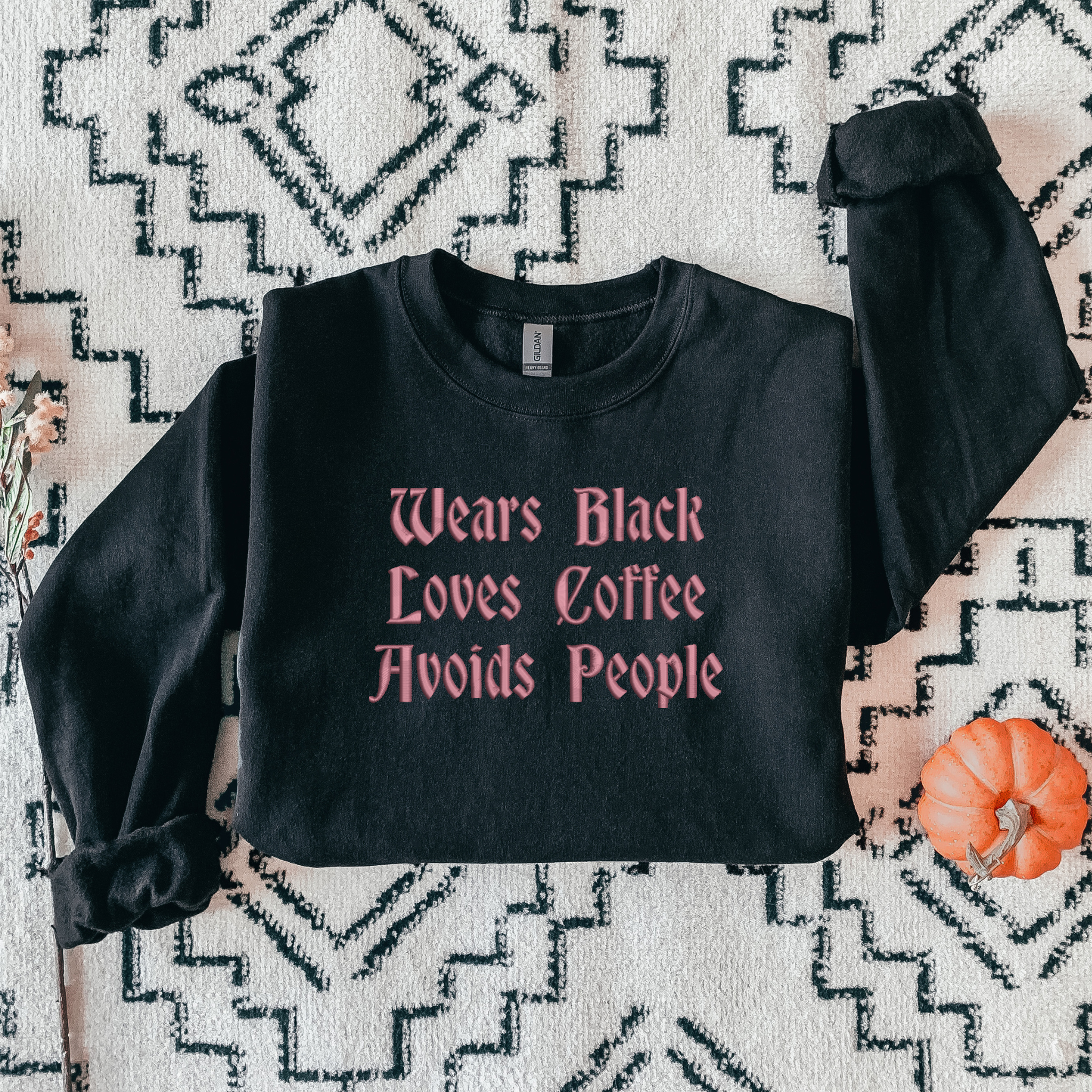 Embroidered Wears Black Loves Coffee Avoids People Crewneck Pullover
