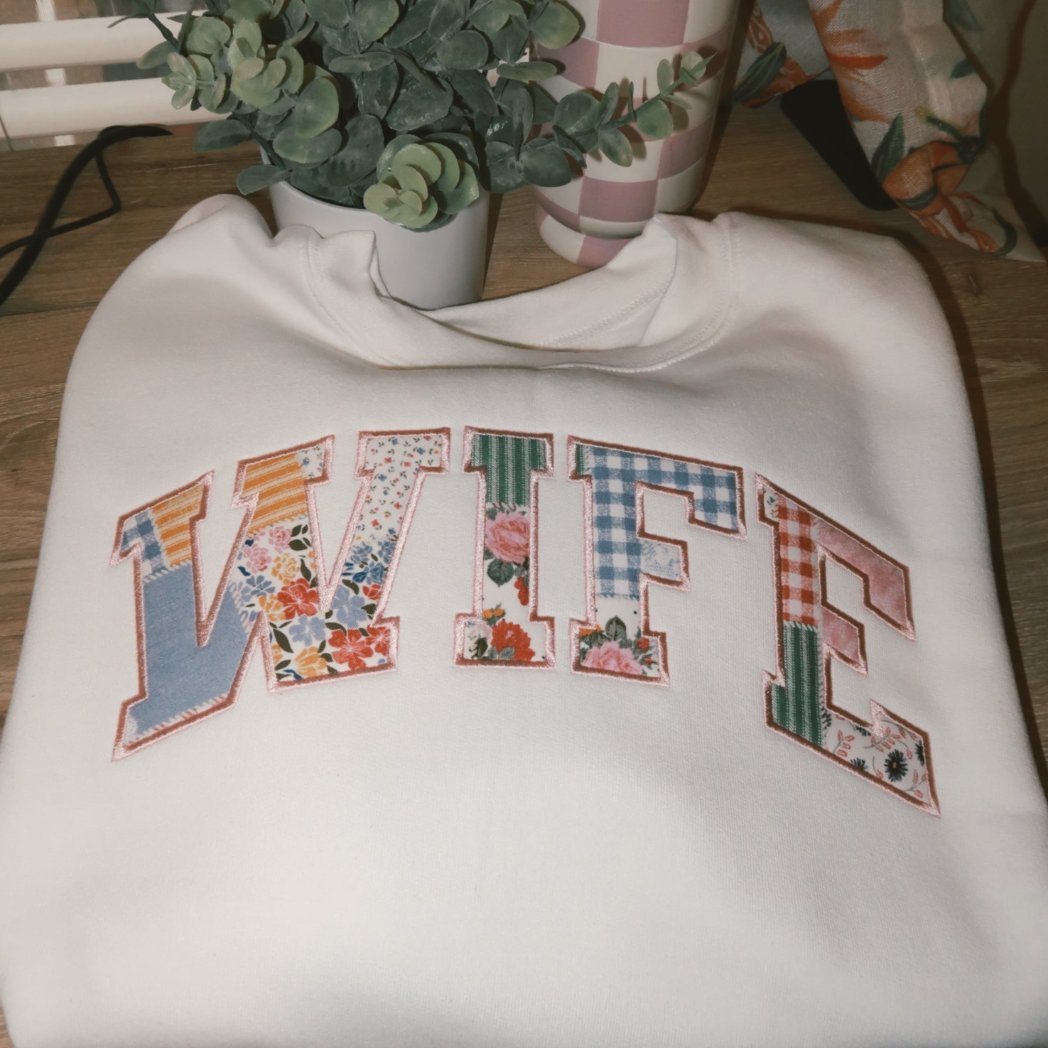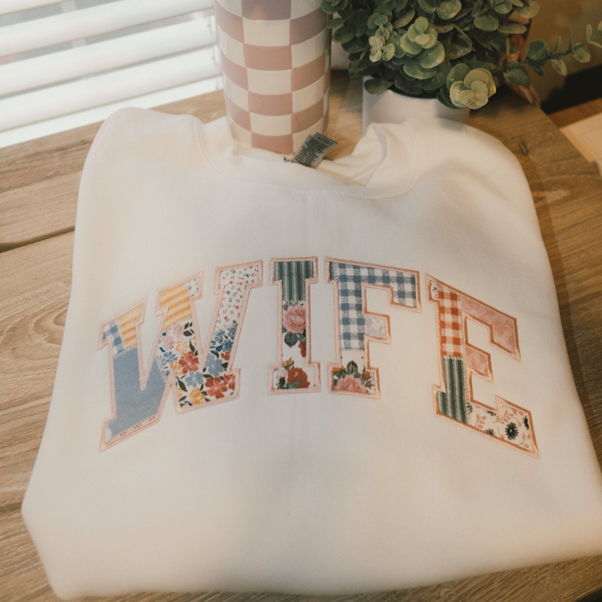Wife or Wifey Patchwork Embroidered Sweatshirt or T Shirt