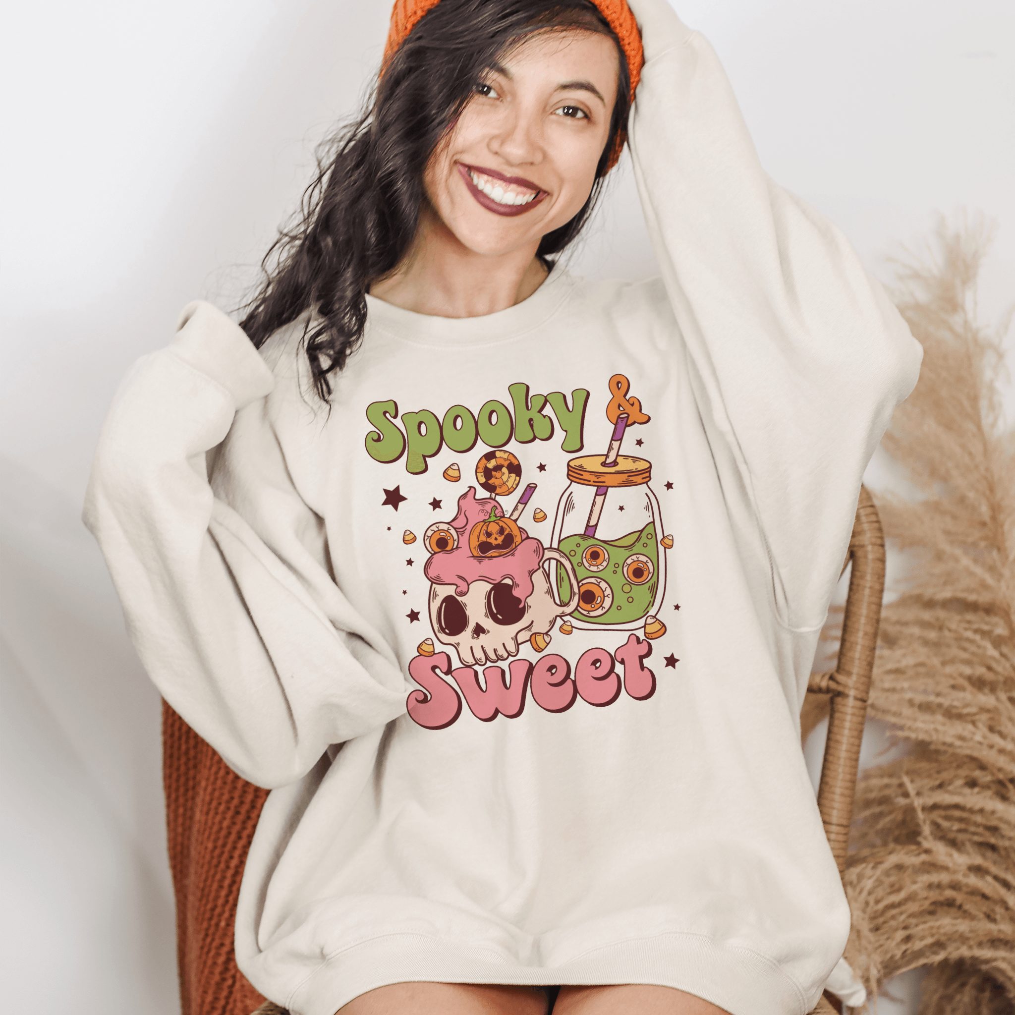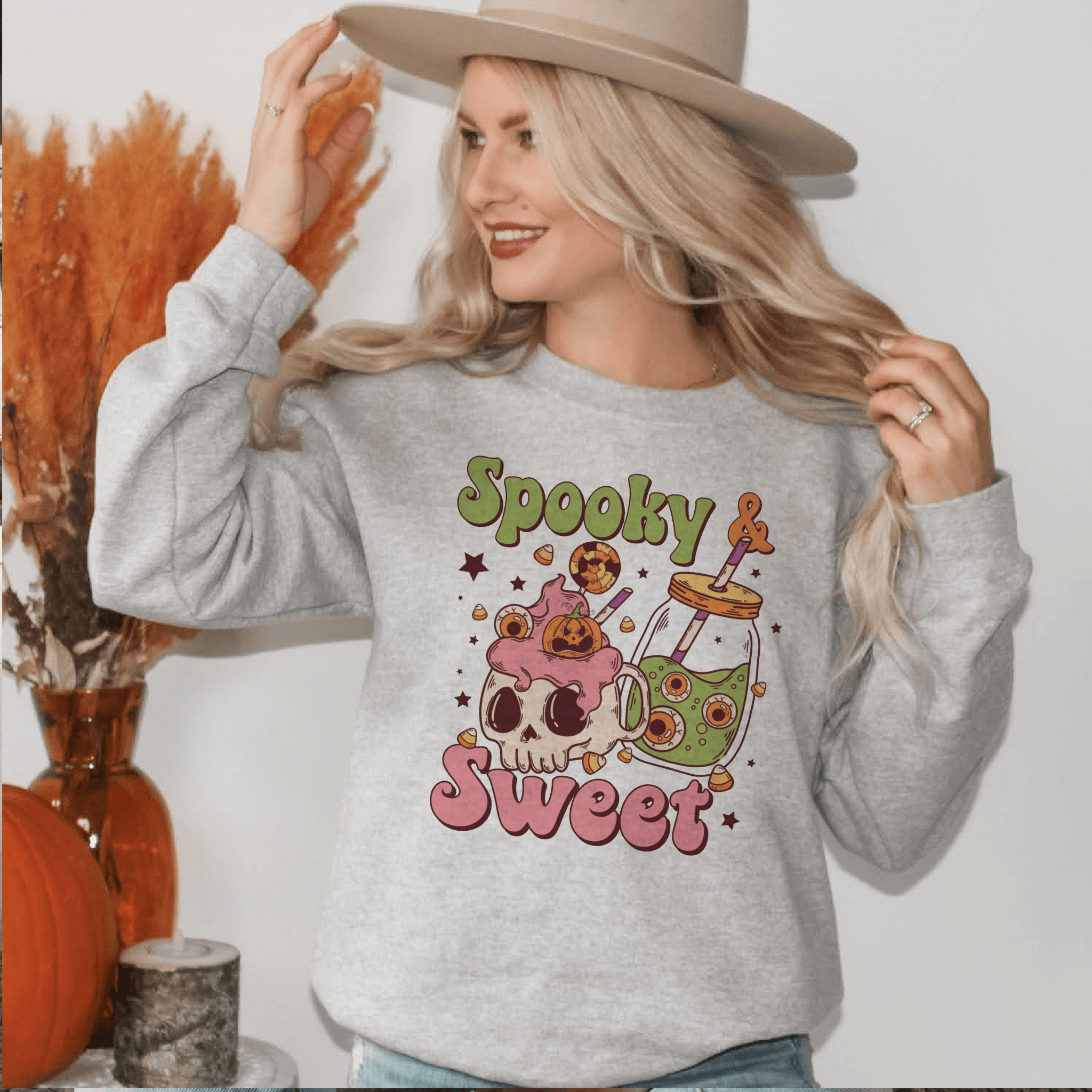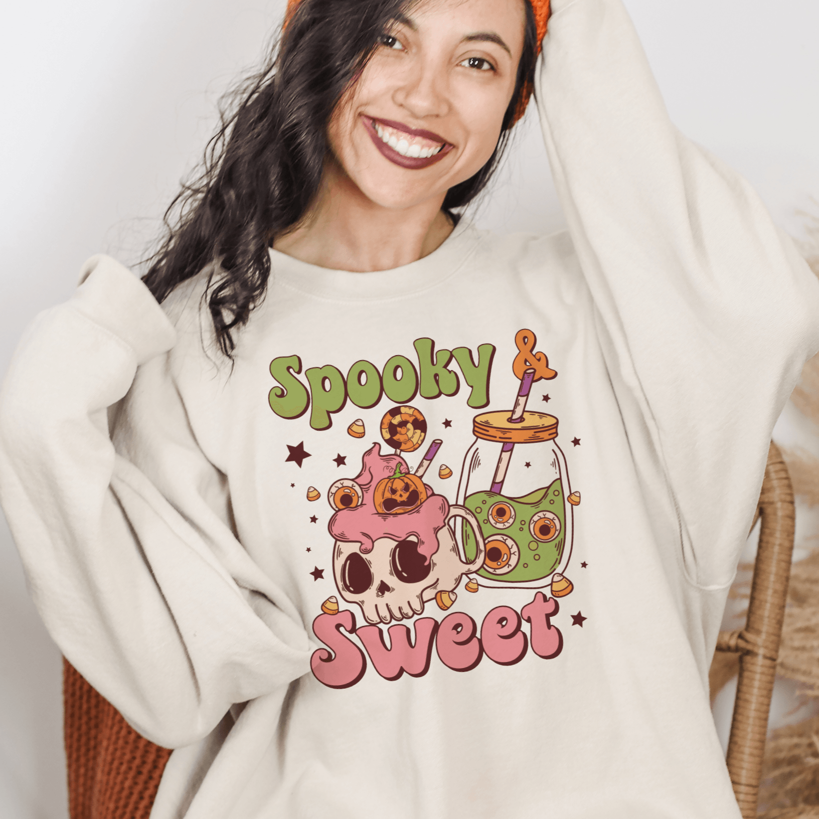 Indulge in the perfect balance of 'Spooky & Sweet' with our uniquely designed sweatshirt. Boasting a cute skeleton mug alongside delightful spooky treats, it's every Halloween lover's dream. Dive into our range of colors and sizes exclusively on our website. Lovingly crafted by our small business, wrap up in style and comfort this fall.