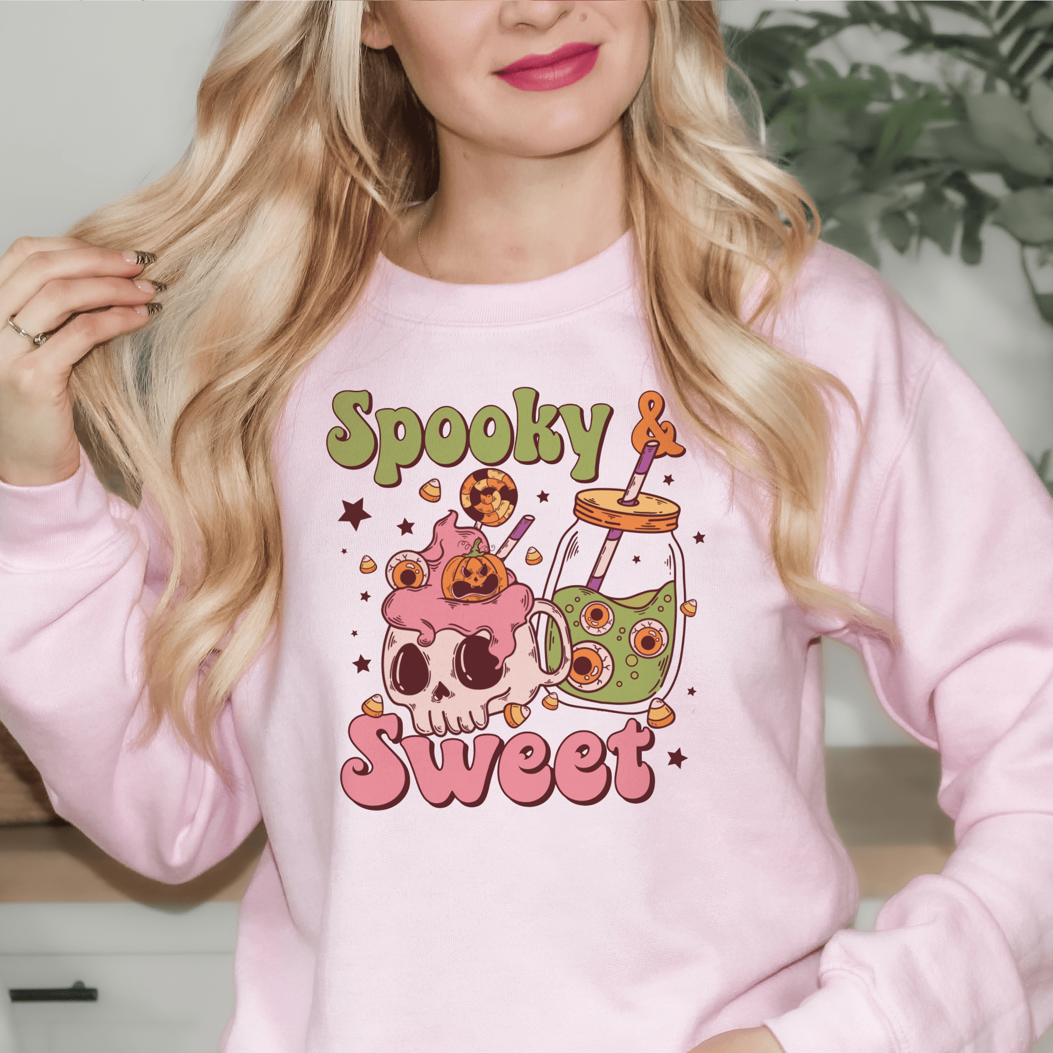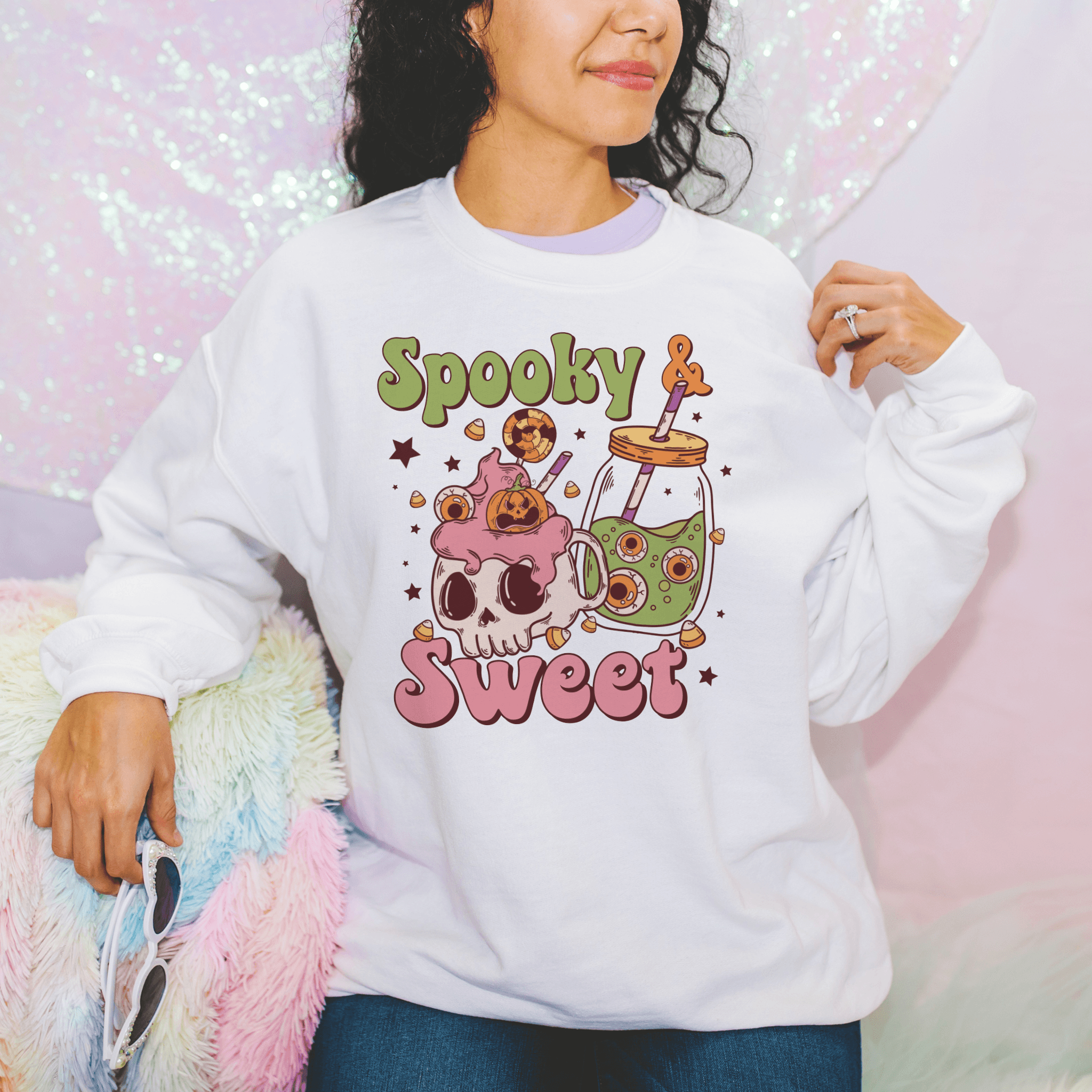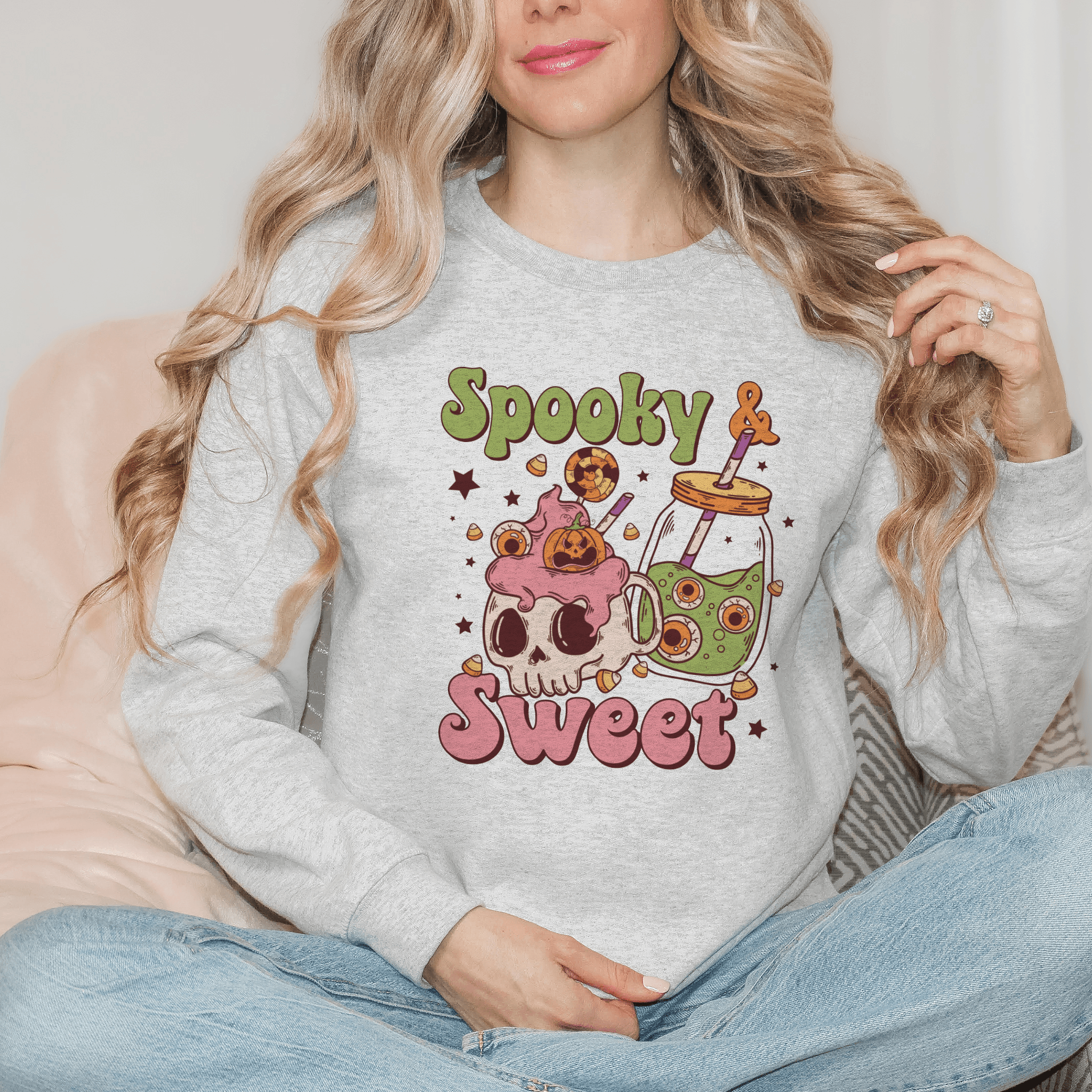 Indulge in the perfect balance of 'Spooky & Sweet' with our uniquely designed sweatshirt. Boasting a cute skeleton mug alongside delightful spooky treats, it's every Halloween lover's dream. Dive into our range of colors and sizes exclusively on our website. Lovingly crafted by our small business, wrap up in style and comfort this fall.