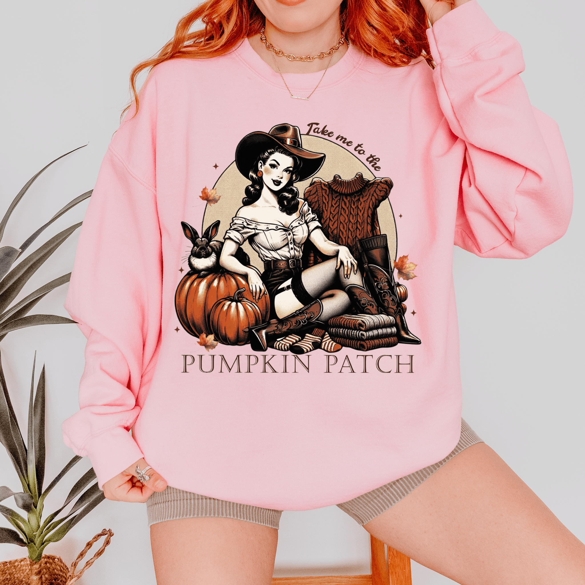 Get ready for fall with our adorable "Take Me to the Pumpkin Patch" sweatshirt! This cozy sweatshirt features a charming retro cowgirl design, complete with pumpkins and autumn leaves. Perfect for pumpkin patch visits, fall festivals, or just staying warm in style.