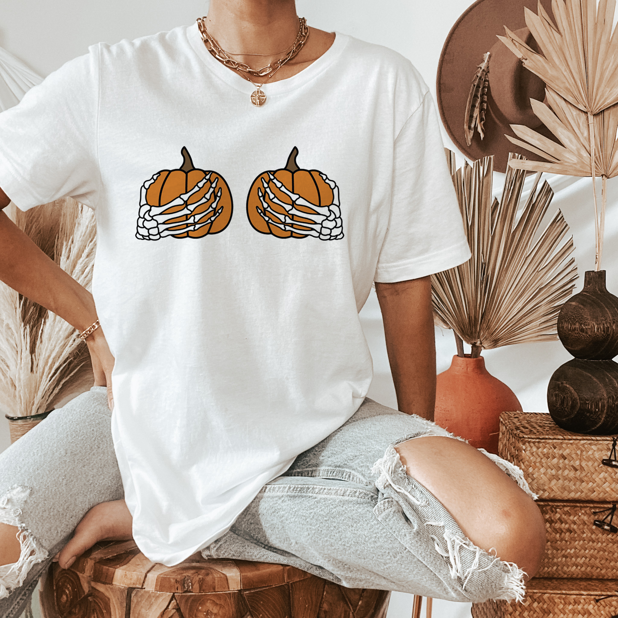 Funny pumpkin skeleton hands white t shirt