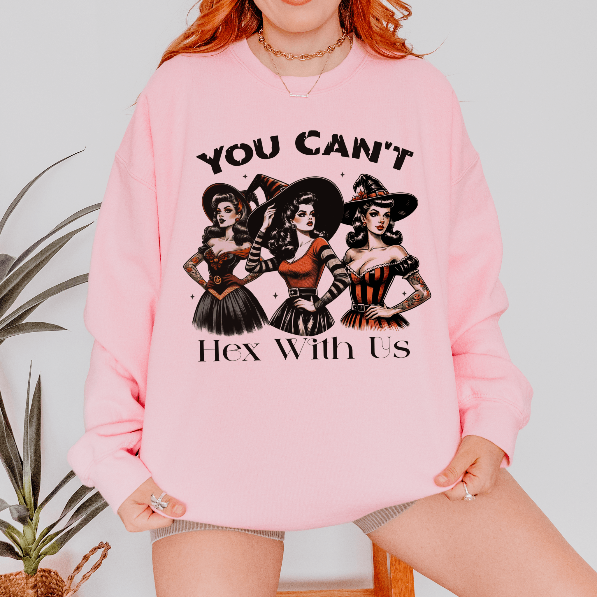 Step up your spooky season style with our "You Can't Hex With Us" sweatshirt! This playful sweatshirt features a trio of fashionable retro witches, perfect for adding a bit of witchy flair to your fall wardrobe. Whether you're attending a Halloween party or enjoying a cozy night in, this sweatshirt is sure to cast a spell.