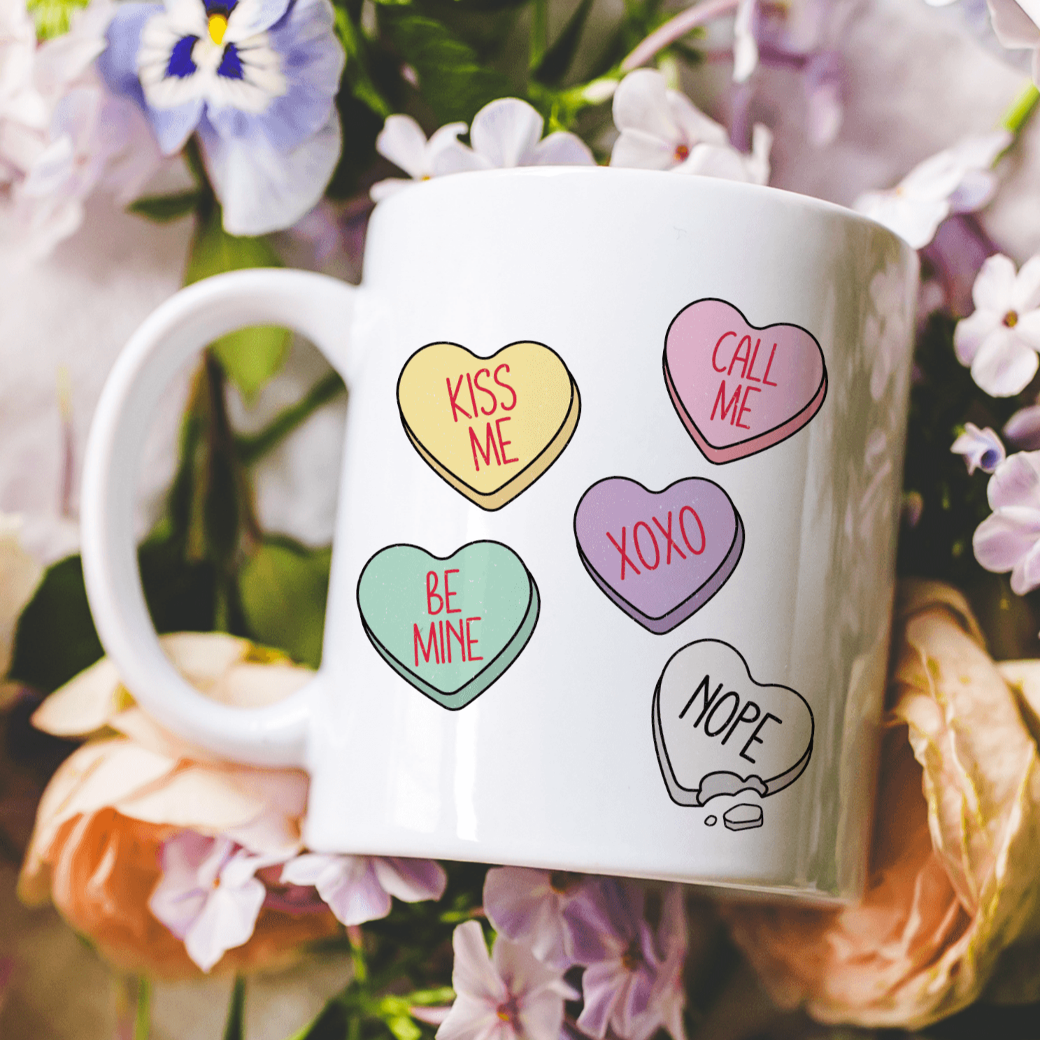Pour your heart out with our Candy Heart Message Mug. This charming coffee cup is adorned with a playful array of candy hearts featuring sweet sayings like 'Kiss Me' and 'XOXO', along with a touch of humor with 'Nope'. It's the perfect gift for Valentine's Day or to show your affection any day of the year. Each mug is a unique creation from our small business, crafted with care and ready to fill your mornings with love and laughter. Pick up this delightful cup and more endearing designs on our website.