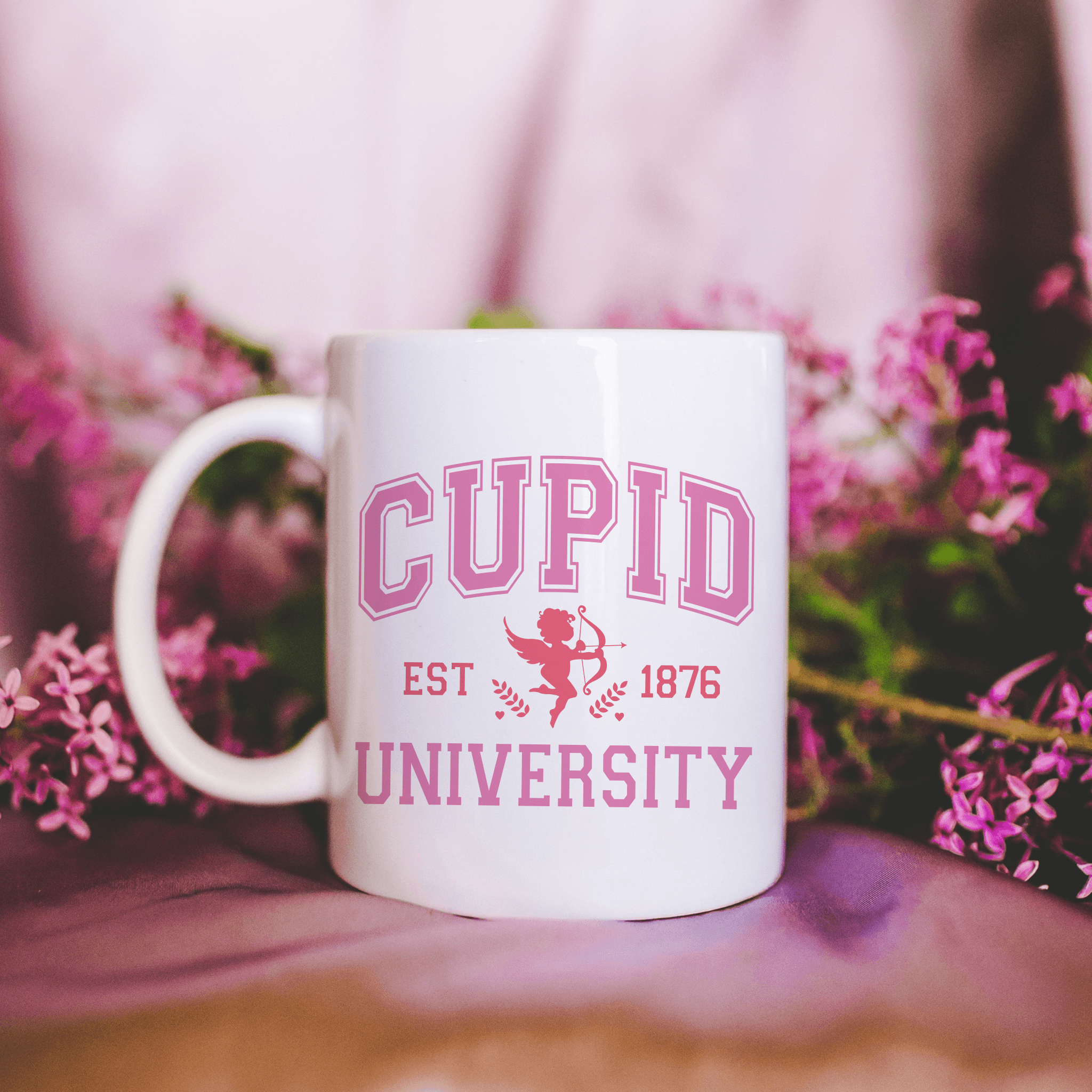 Fuel your day with love and laughter with our Cupid University Novelty Coffee Mug. This classic white ceramic cup features the esteemed Cupid University crest, complete with a vintage Cupid and establishment year of 1876. It's the perfect choice for sipping your morning coffee or evening tea with a touch of romantic whimsy. Each mug is a proud creation from our small business, bringing a blend of charm and nostalgia to your daily routine.