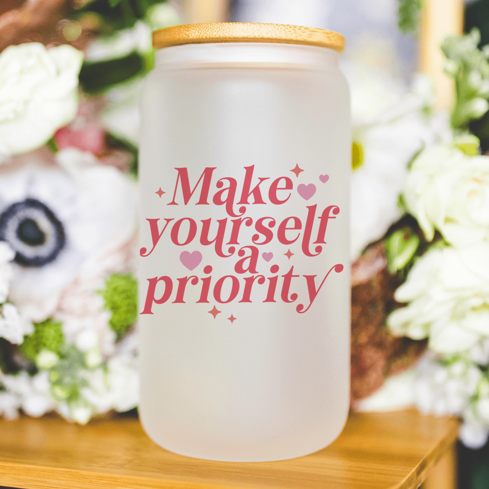 Reinforce your daily self-care practice with our 'Make Yourself a Priority' Inspiration frosted libbey cup. This cup is more than just a drinkware item; it's a gentle nudge to give yourself the love and attention you deserve. With its uplifting message and delicate heart design, it's sure to become your go-to for morning coffee or evening tea. Lovingly crafted by our small business, this tumbler is part of a collection that celebrates self-worth and personal empowerment. Discover this and other motivational pieces on our website, where your well-being is always the top priority.