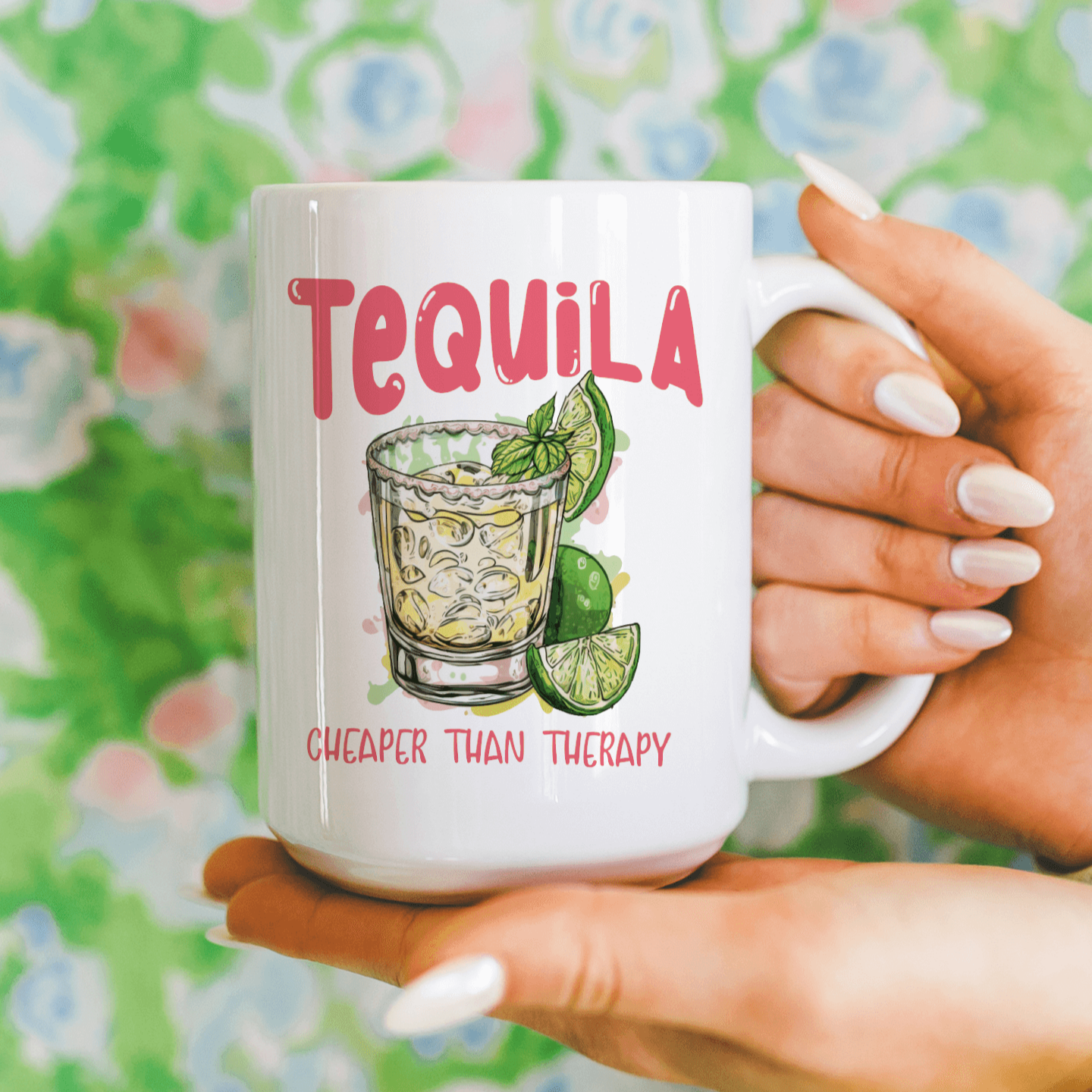 Start your day with a smile and a splash of humor with our 'Tequila: Cheaper Than Therapy' Mug. This fun white ceramic cup is just what you need to brighten up your morning routine or evening unwind. Adorned with a lively tequila and lime illustration, it's the perfect mug for those with a love for laughs and good spirits. Each mug is carefully crafted by our small business, offering you a unique blend of quality and comedy. Check out our website for this and other amusing mugs that make every sip a celebration.