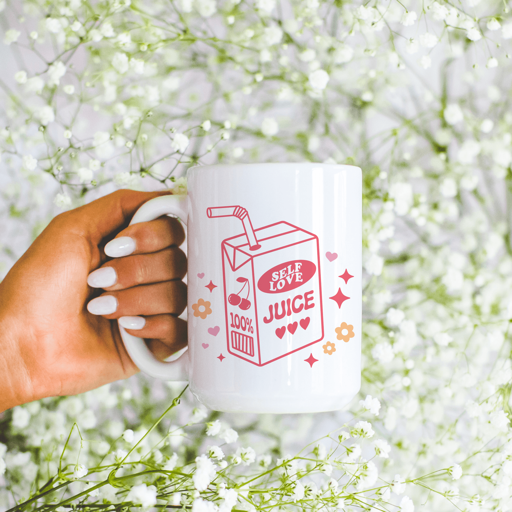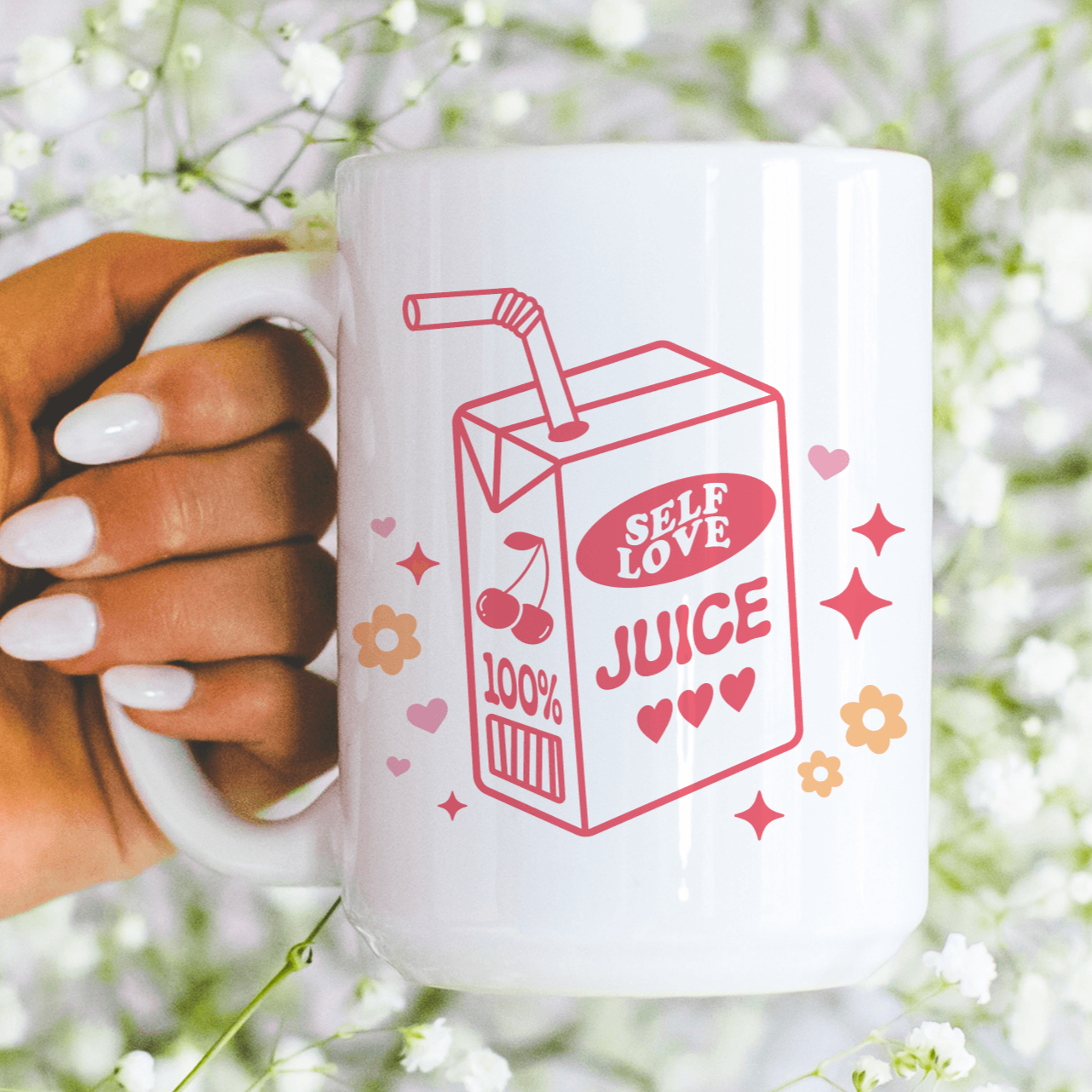 Embrace your self-care ritual with our 'Self Love Juice' Mug. This inspirational white ceramic cup is designed to fill your mornings with positivity and self-appreciation. Adorned with a unique juice box graphic, it serves as a daily reminder to nurture your well-being. Ideal for your favorite hot beverage or as a gift to a loved one in need of a self-esteem boost. Proudly crafted by our small business, this mug joins a collection of inspiring designs available on our website.
