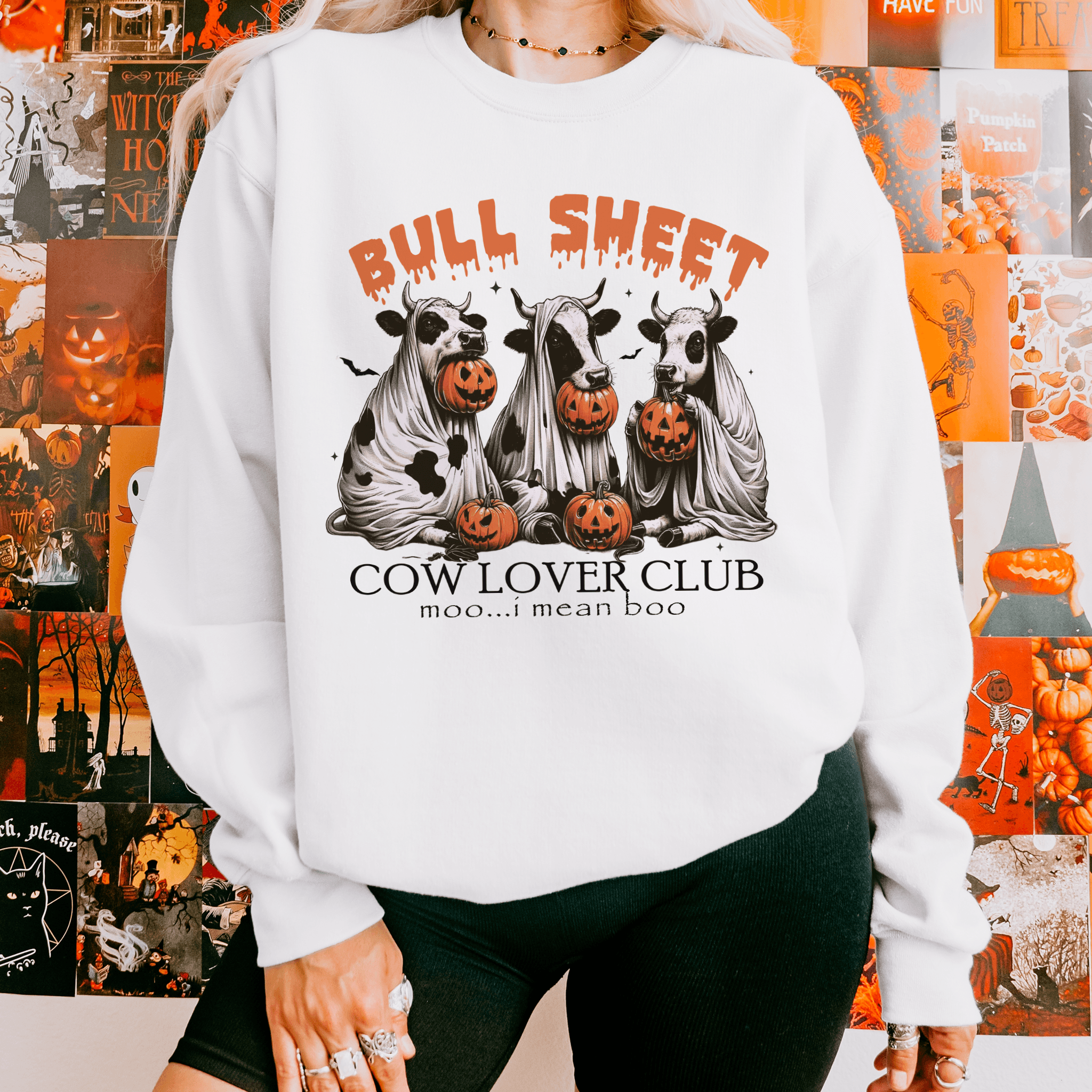 Get into the Halloween spirit with a dash of humor and a love for cows! Our "Bull Sheet Cow Lover Club" sweatshirt is perfect for cow enthusiasts who enjoy a good laugh. Featuring three adorable cows dressed as spooky ghosts with jack-o'-lanterns, this cozy sweatshirt is a fun and festive addition to your fall wardrobe.
