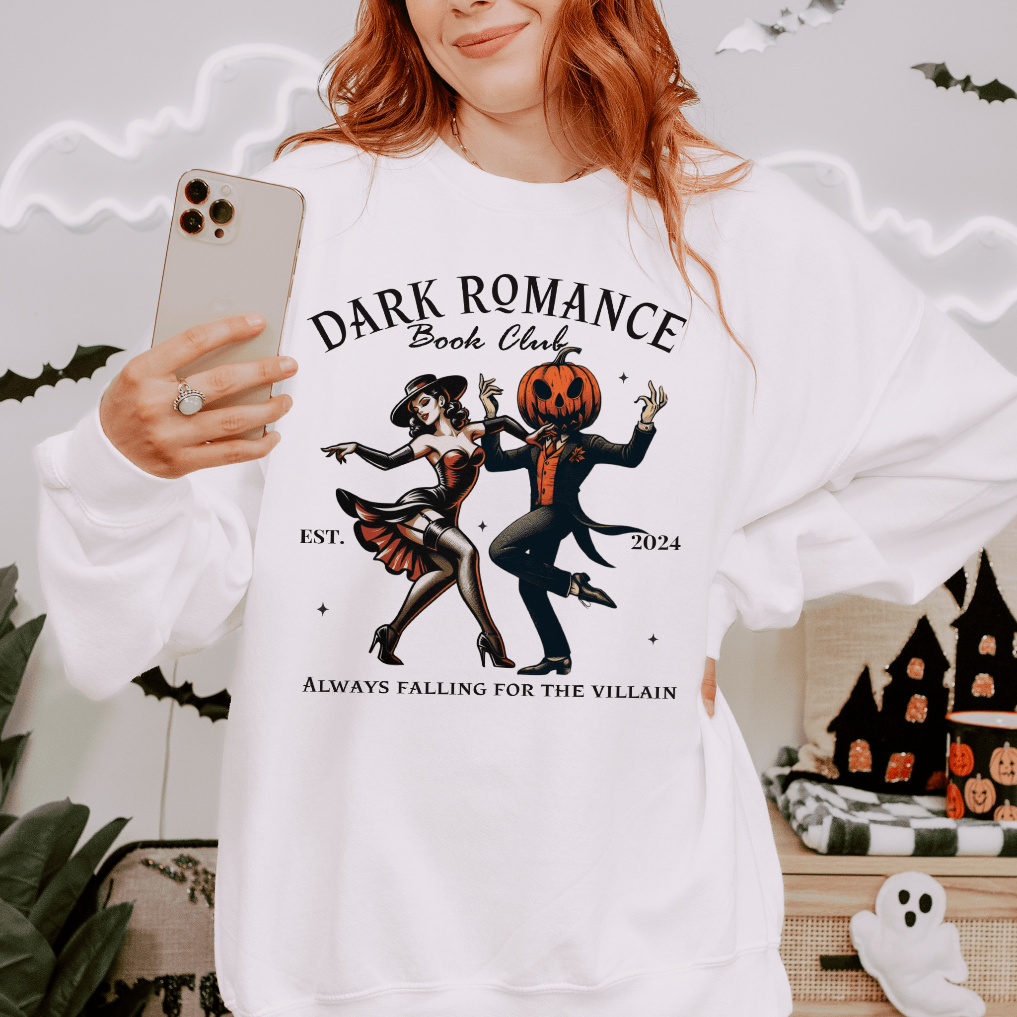 Join the "Dark Romance Book Club" and embrace your love for villains with this stylish sweatshirt! Featuring a retro-inspired design of a witch dancing with a pumpkin-headed gentleman, this cozy sweatshirt is perfect for fans of dark romance and all things spooky. Whether you're reading your favorite book or attending a Halloween party, this sweatshirt will keep you warm and on-trend.