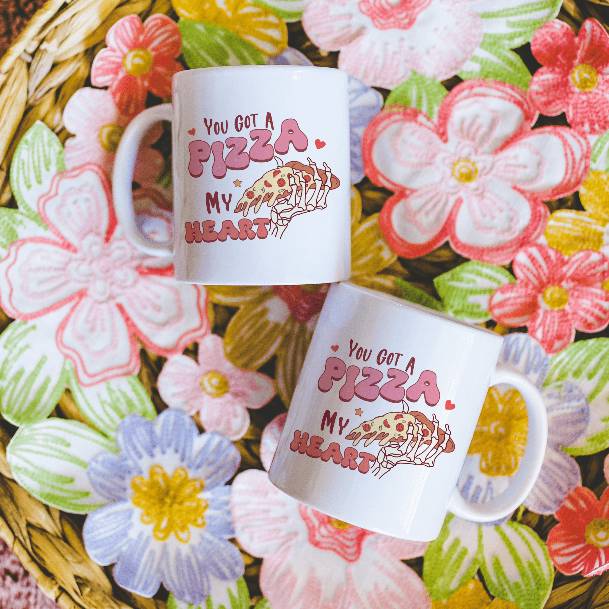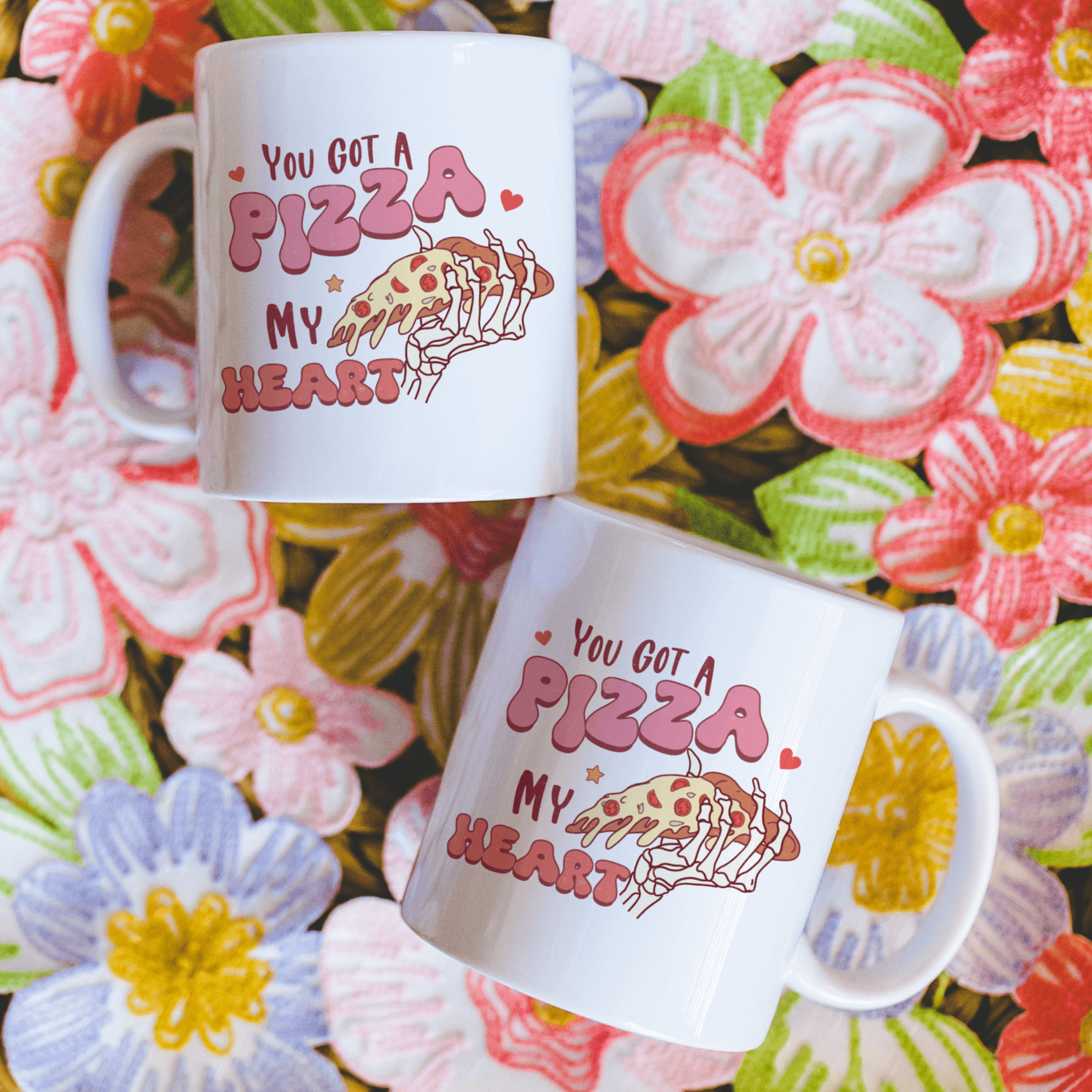 Pour on the charm with our Punny 'You Got a Pizza My Heart' Mug. This whimsical white ceramic cup is perfect for the pizza-loving romantics, featuring a delightful pizza slice graphic and a cheesy love pun. Whether for coffee, tea, or your favorite soup, it's sure to bring a smile with every use. Each mug is lovingly created by our small business, ensuring quality and a sprinkle of joy in your kitchen. Find this and other affectionate designs on our website, where good taste and great puns meet.