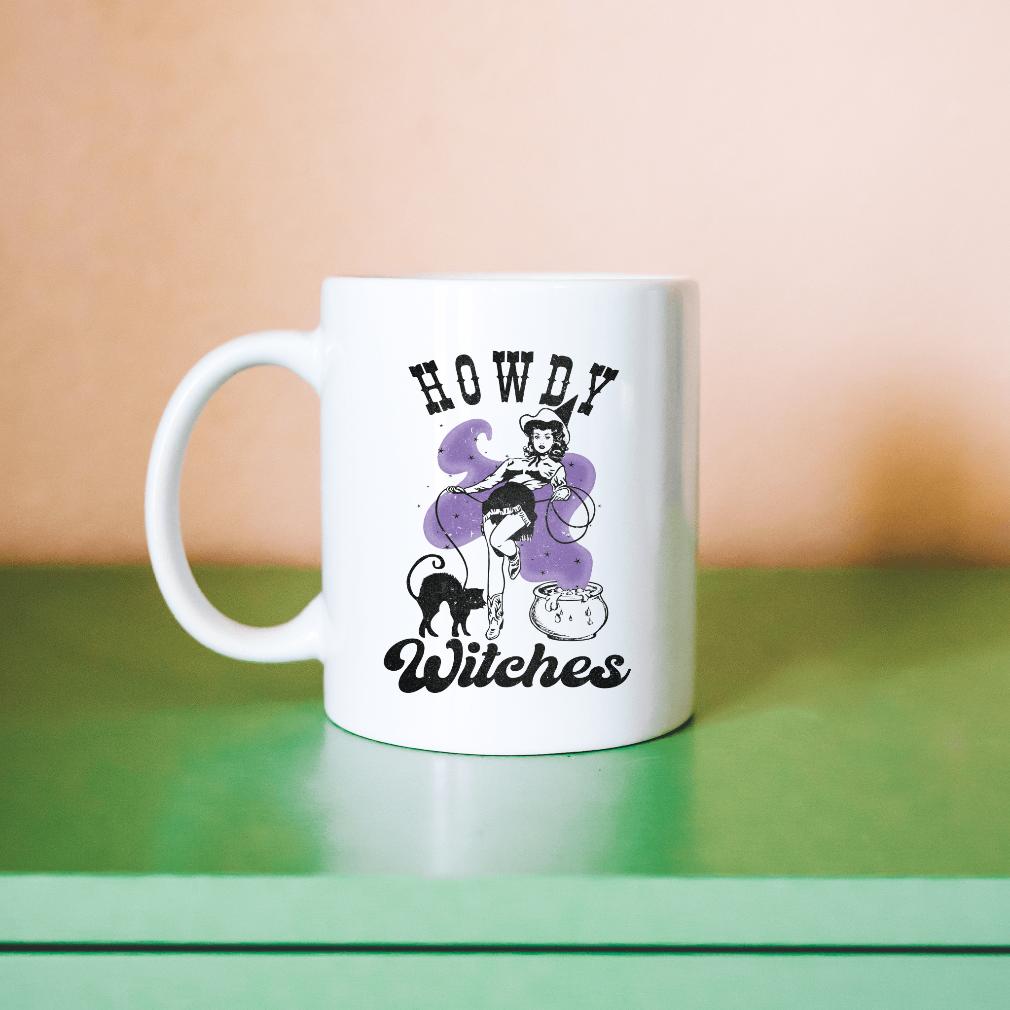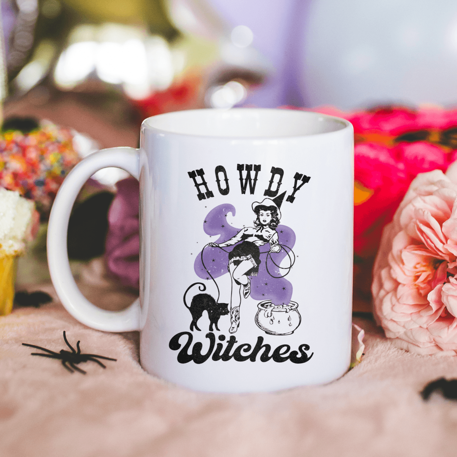 Ride into the Halloween season with our 'Howdy Witches' mug. Featuring a sassy Western cowgirl, her trusty cauldron, and a mystical black cat, it's where the wild west meets witchcraft. Browse various colors and sizes exclusively on our website. Crafted with care by our dedicated small business.