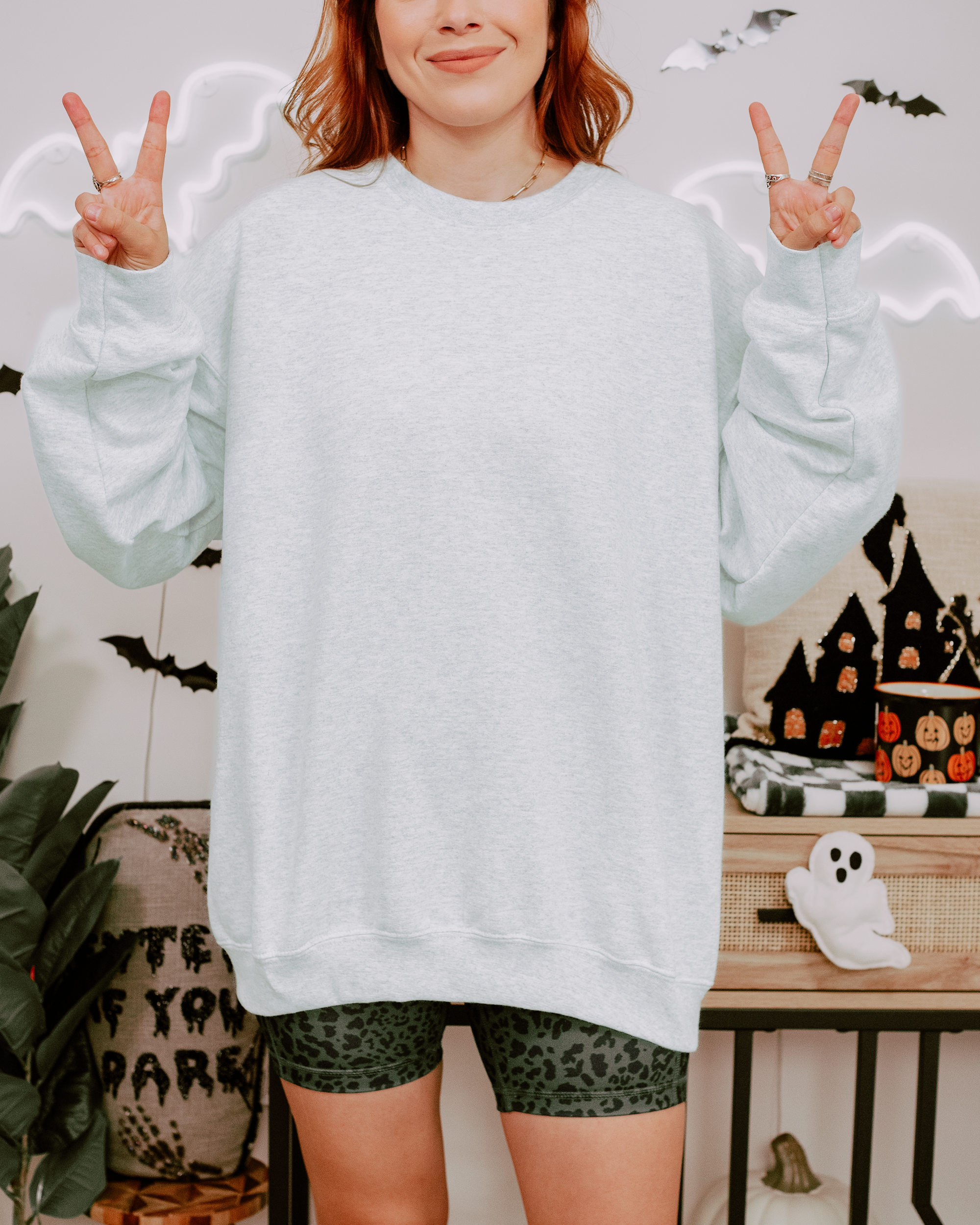 Our sweatshirts and tees are true to size. For a more oversized fit, we recommend sizing up.