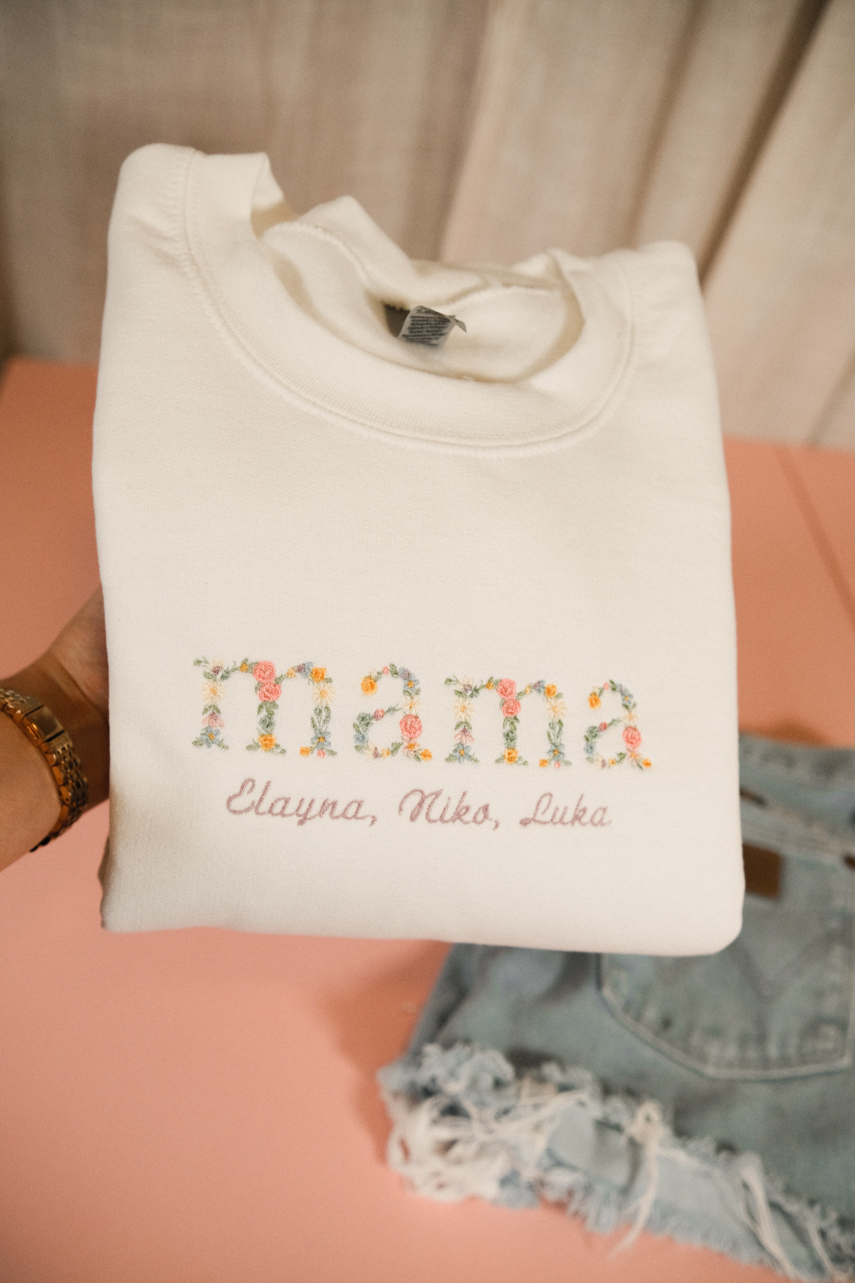 THE perfect gift for a mother! Our embroidered floral mama shirt can be personalized with names underneath or just kept as “mama”.