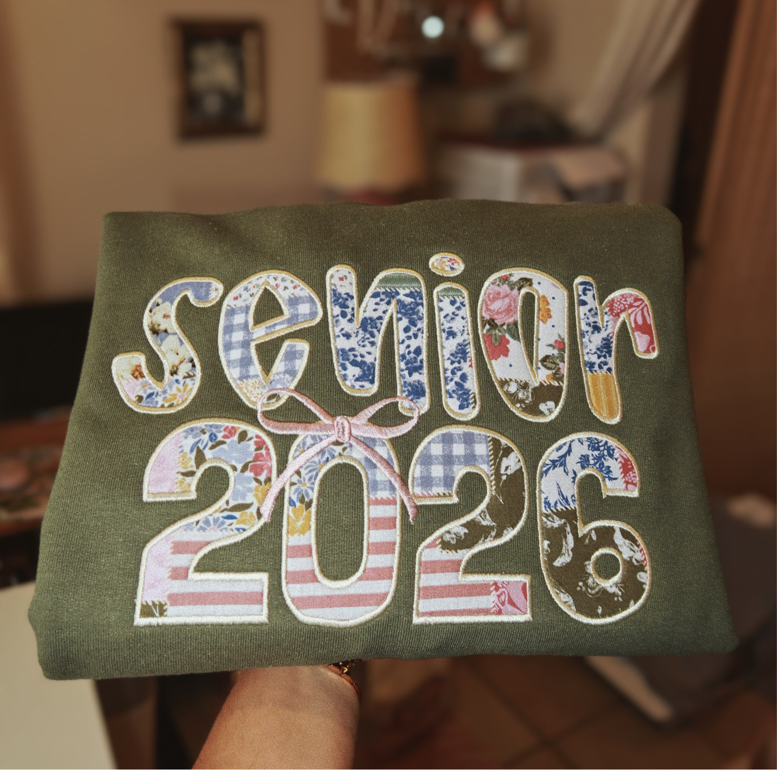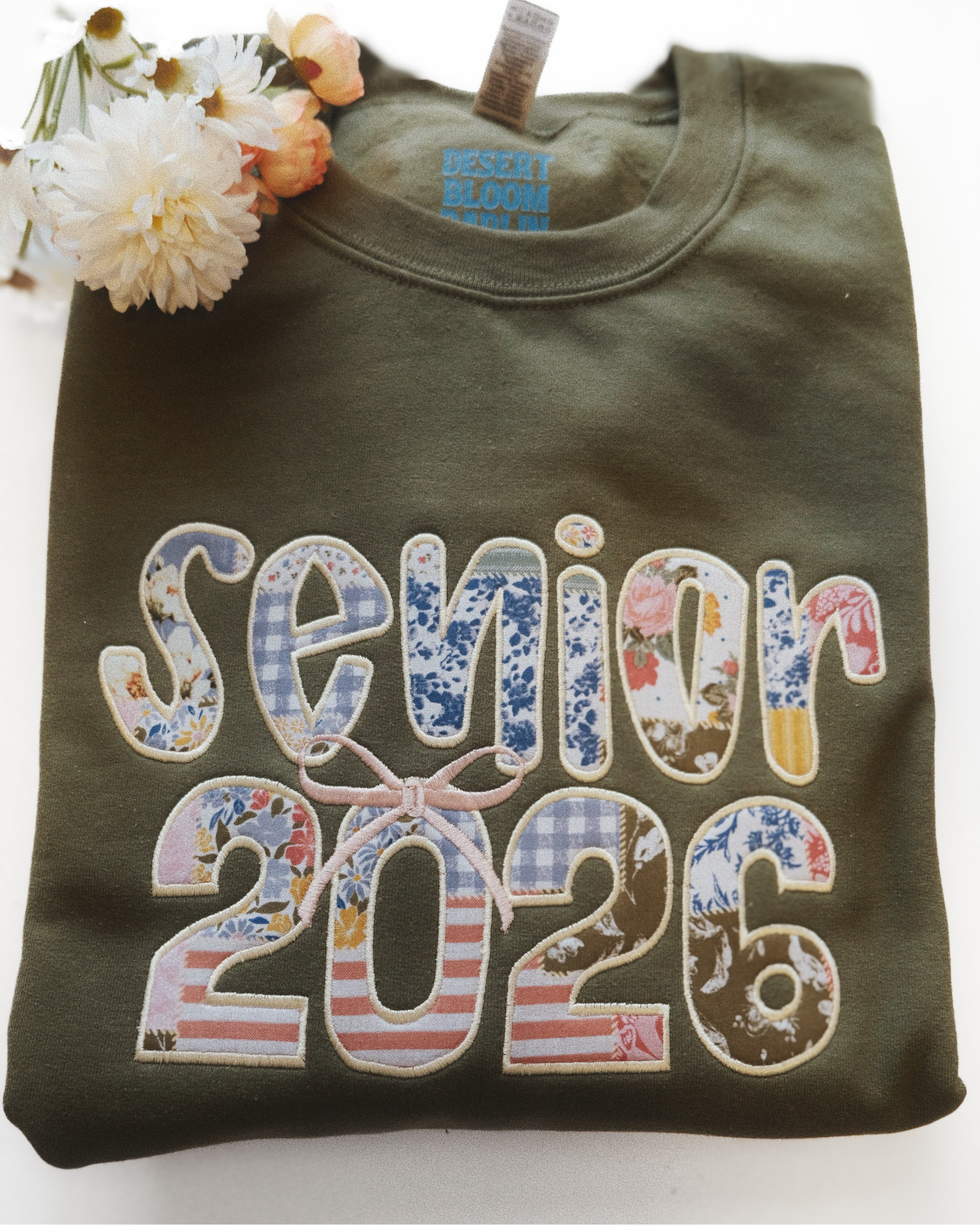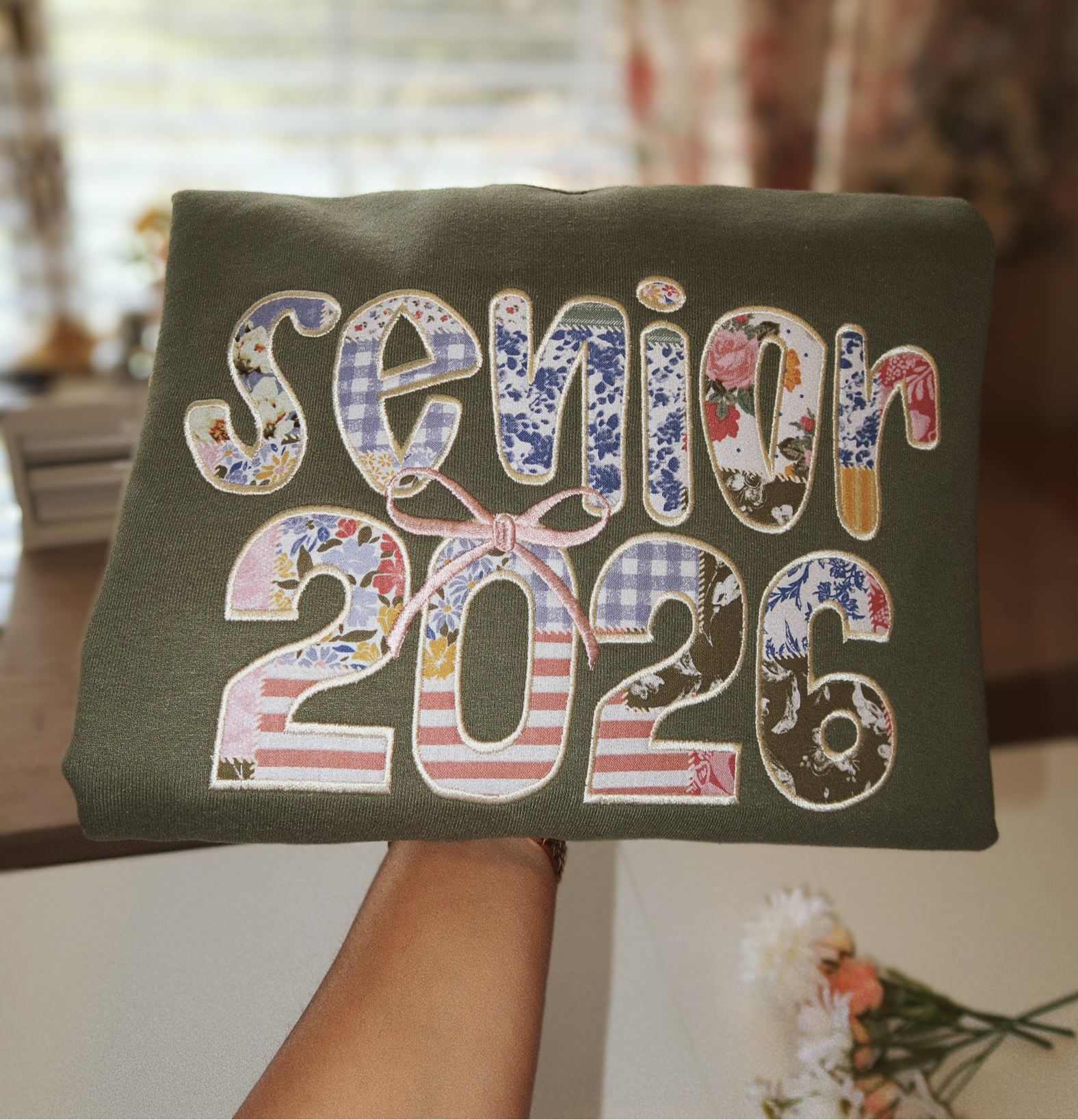 Celebrate senior year with this Senior 2026 sweatshirt with a pink bow detail. Fabric choice and thread color are customizable. The sweatshirt in the photo uses Fabric #5 with ivory thread on a military green sweatshirt.