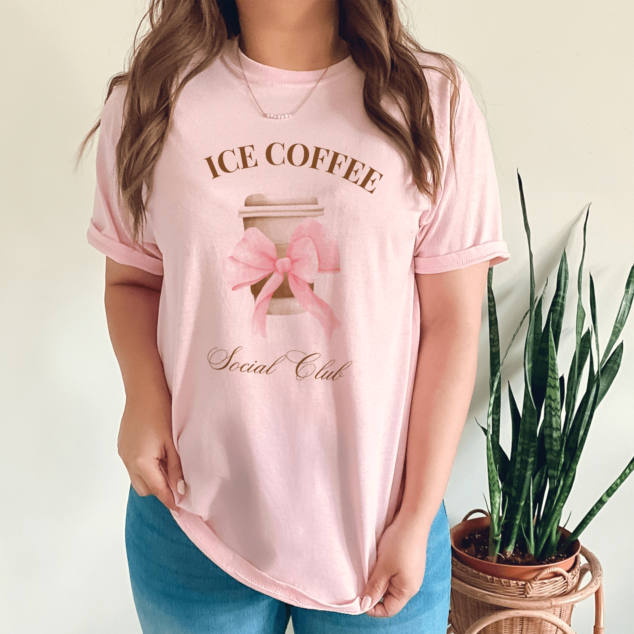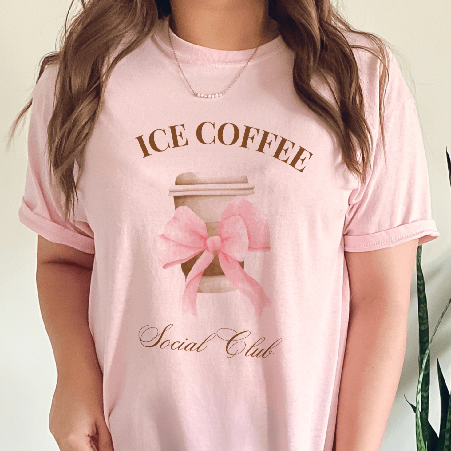 Coffee runs never looked cuter than in our girly bow ice coffee social club t shirt!