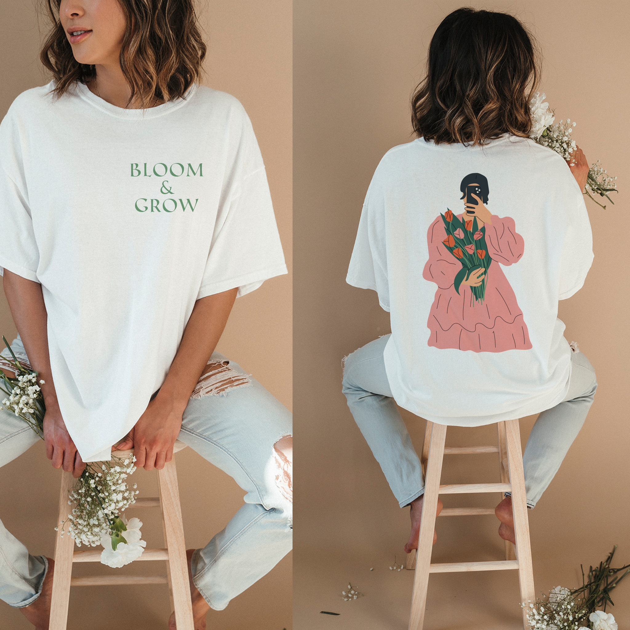 Design: Front displays green "Bloom & Grow," while the back showcases a woman holding flowers taking a selfie.