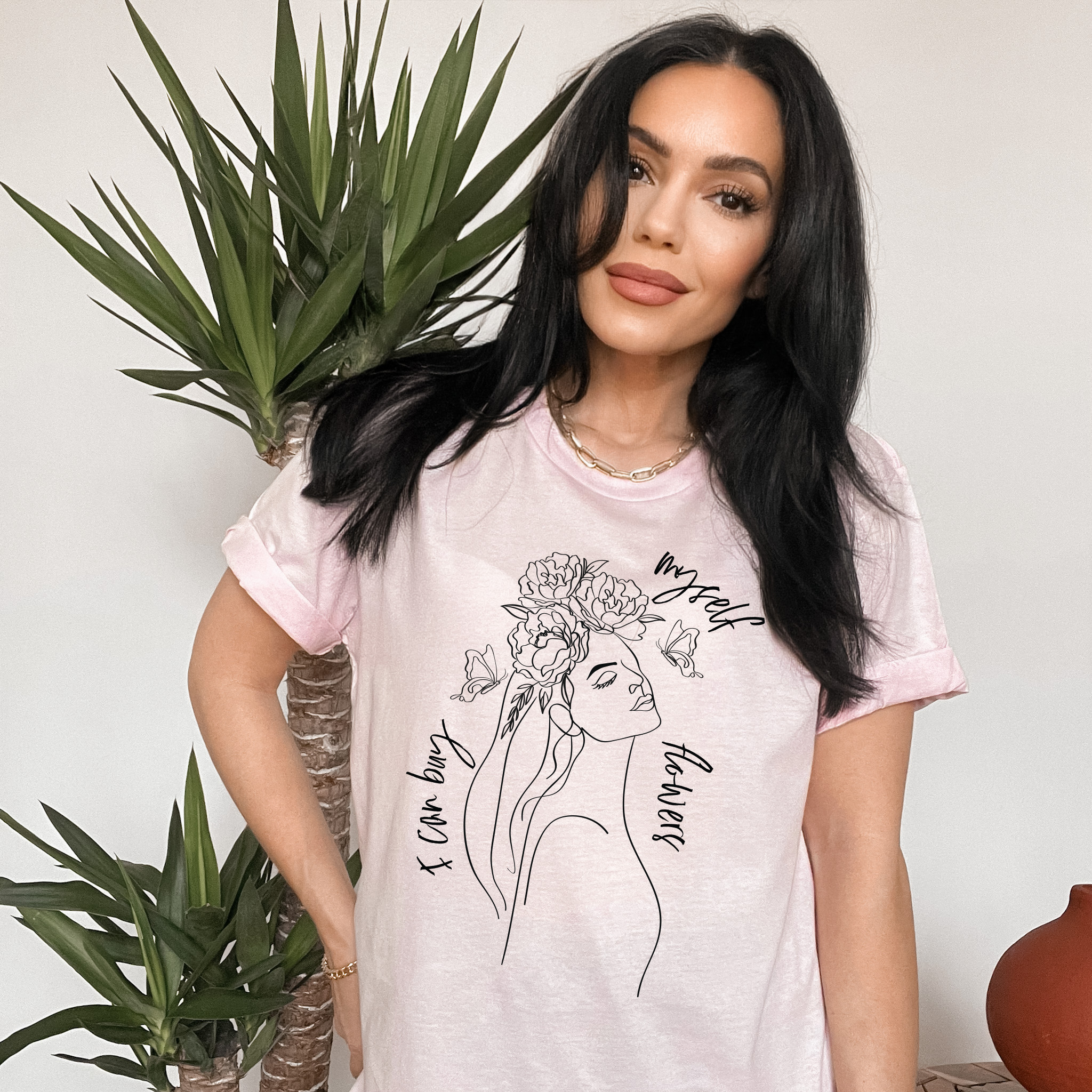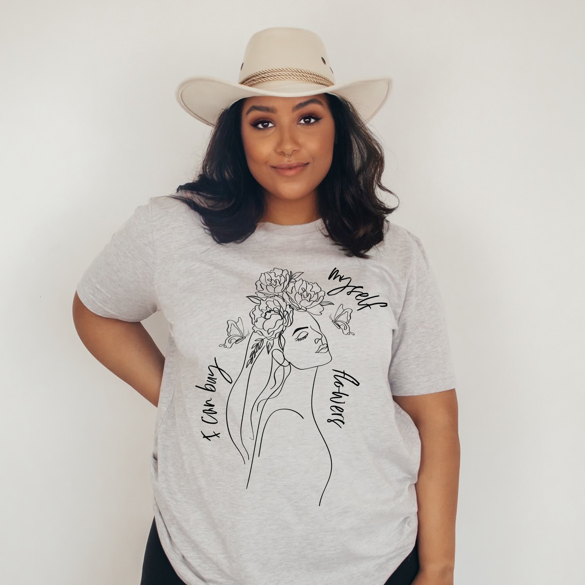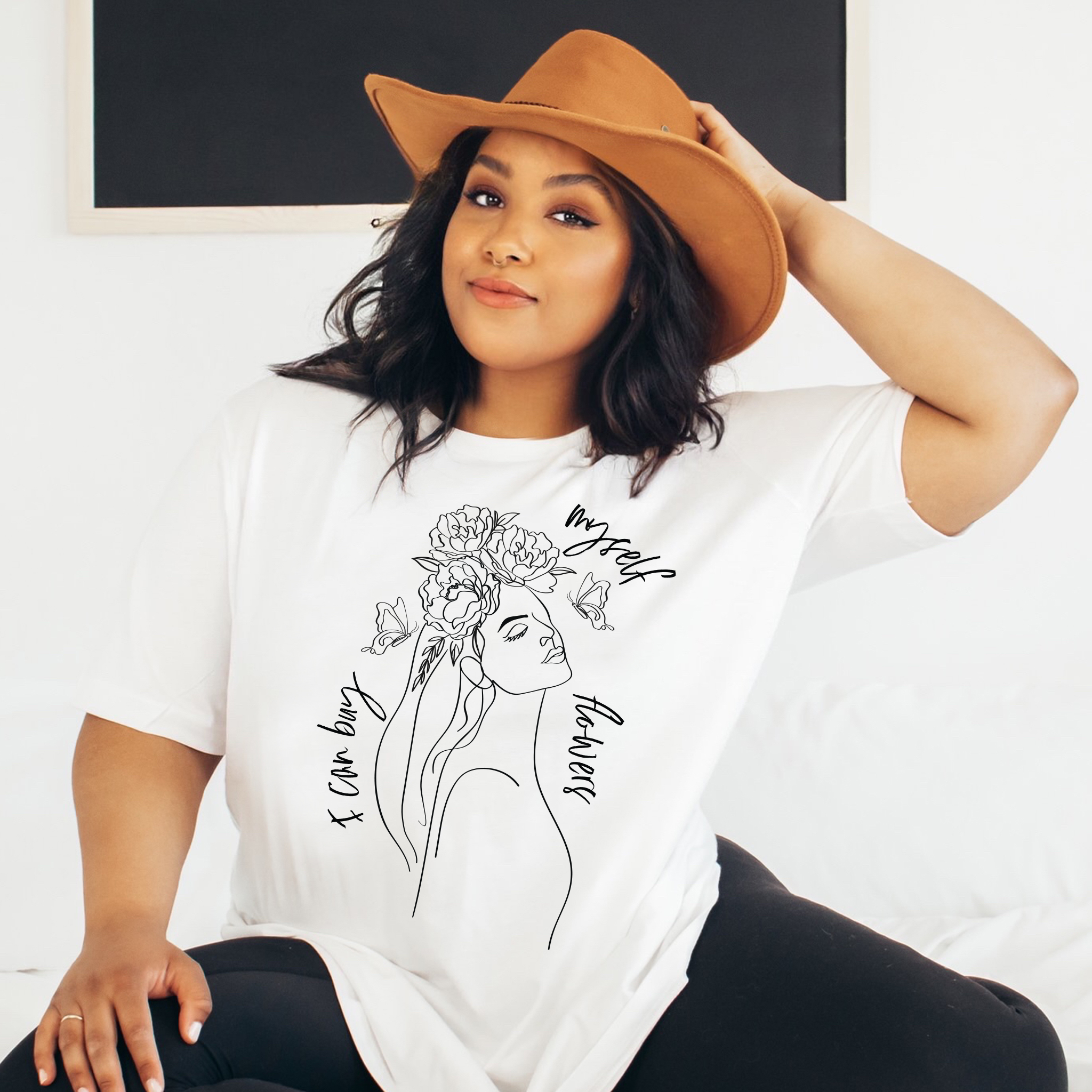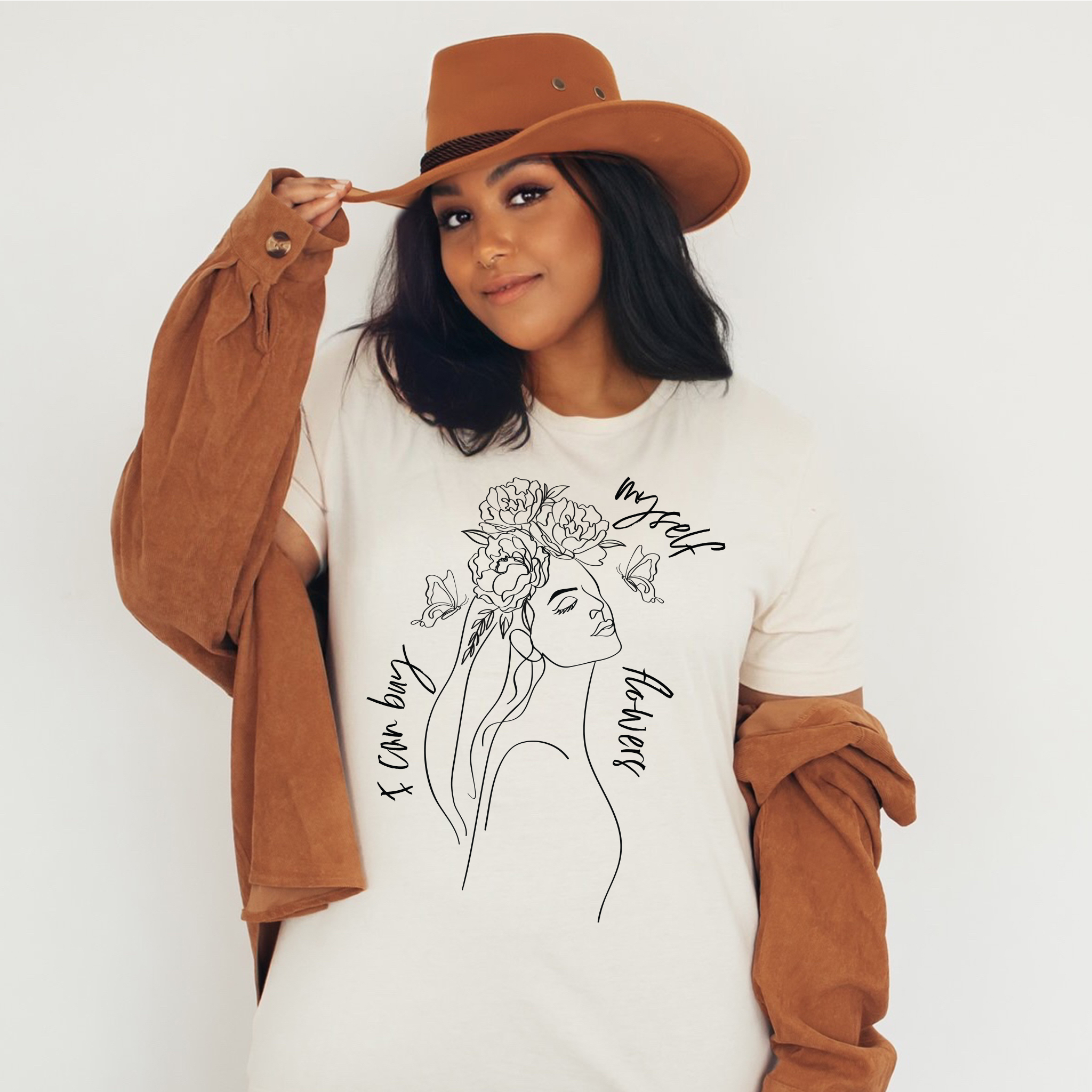 This one-of-a-kind t shirt features an intricate outline of a beautiful woman surrounded by an array of flowers and graceful butterflies. The empowering message, "I can buy myself flowers," is a reminder of the importance of self-love and independence. Handmade to order with the utmost care, this t shirt is made from premium, ultra-soft materials for maximum comfort. Celebrate femininity and individuality with this unique t shirt , ideal for both casual wear and lounging at home.
