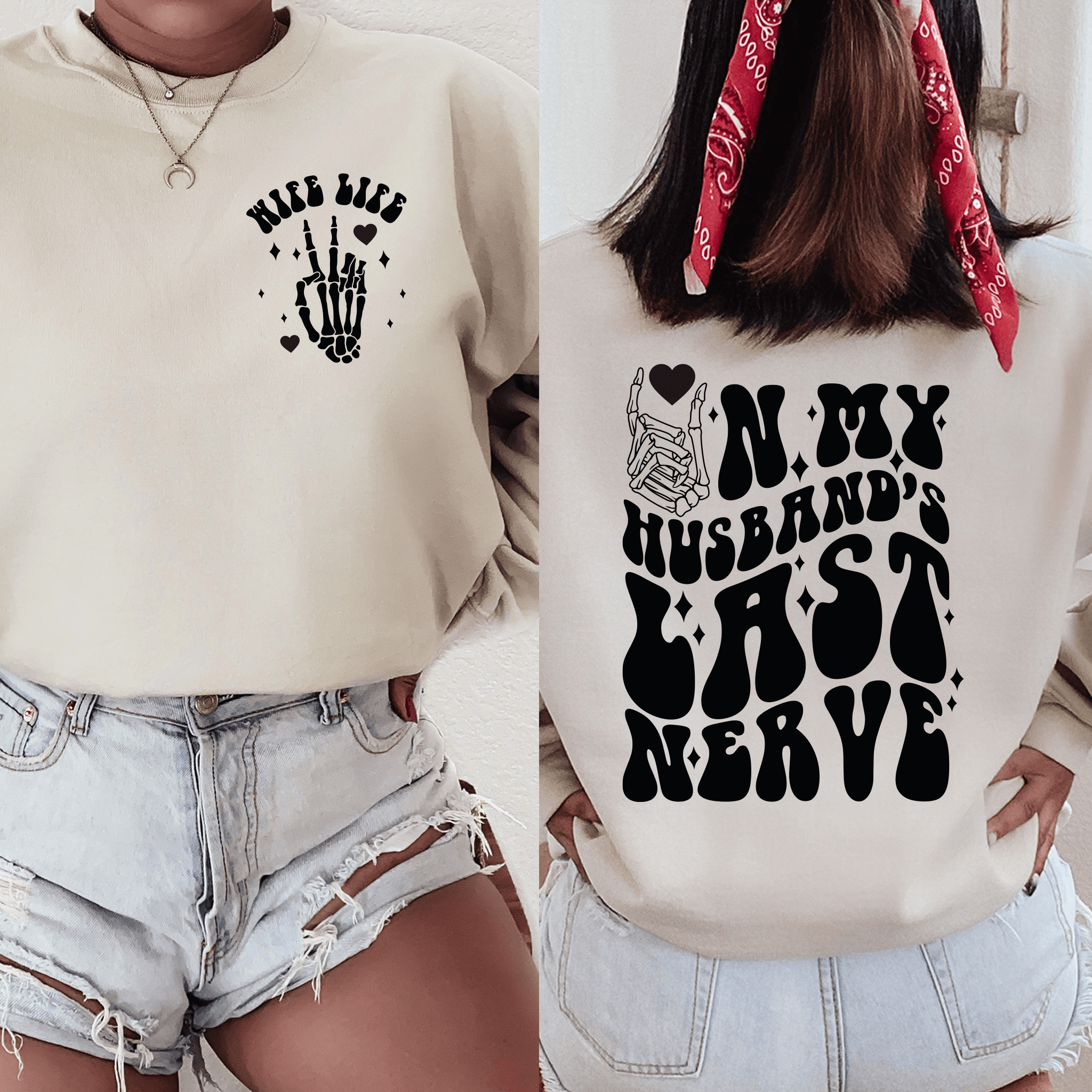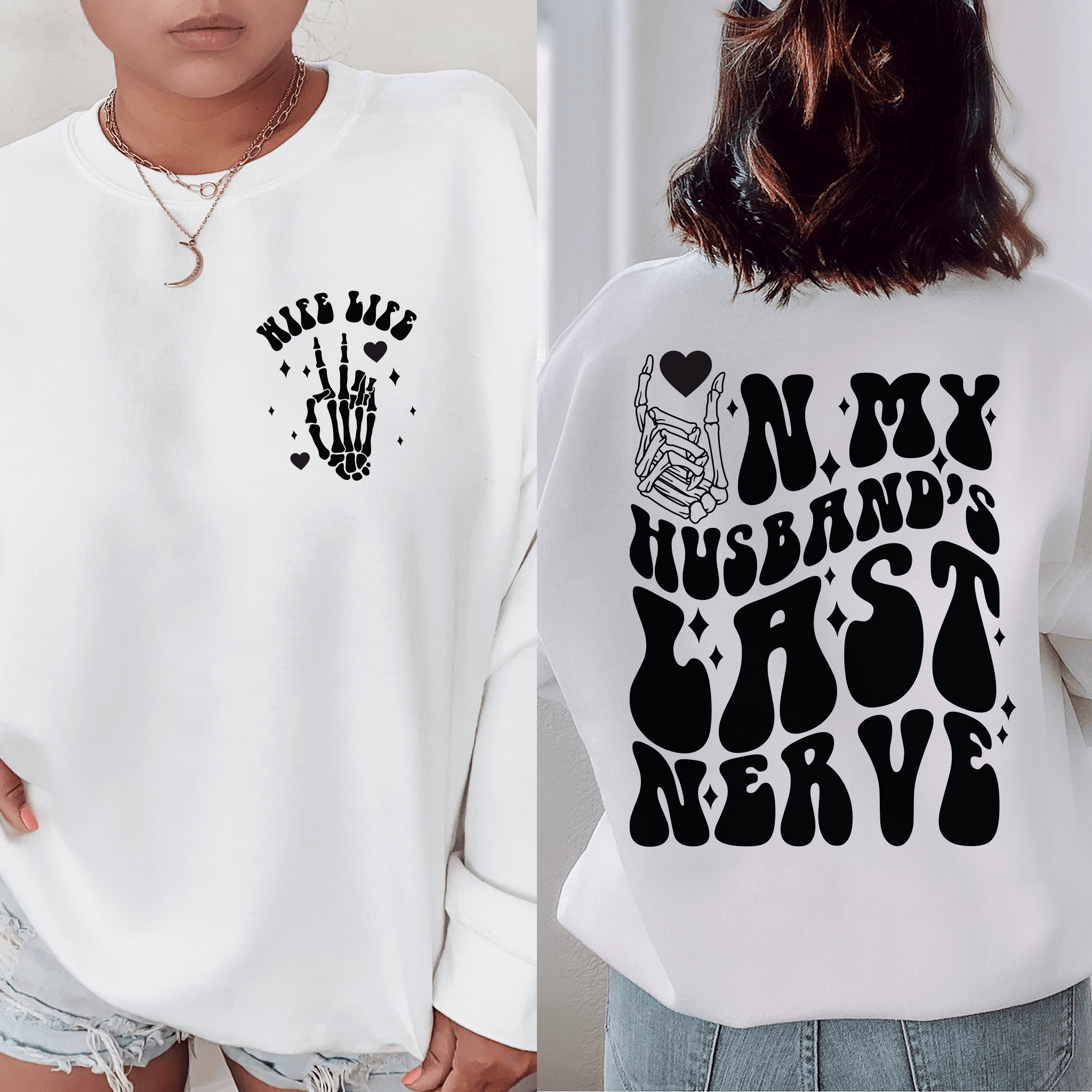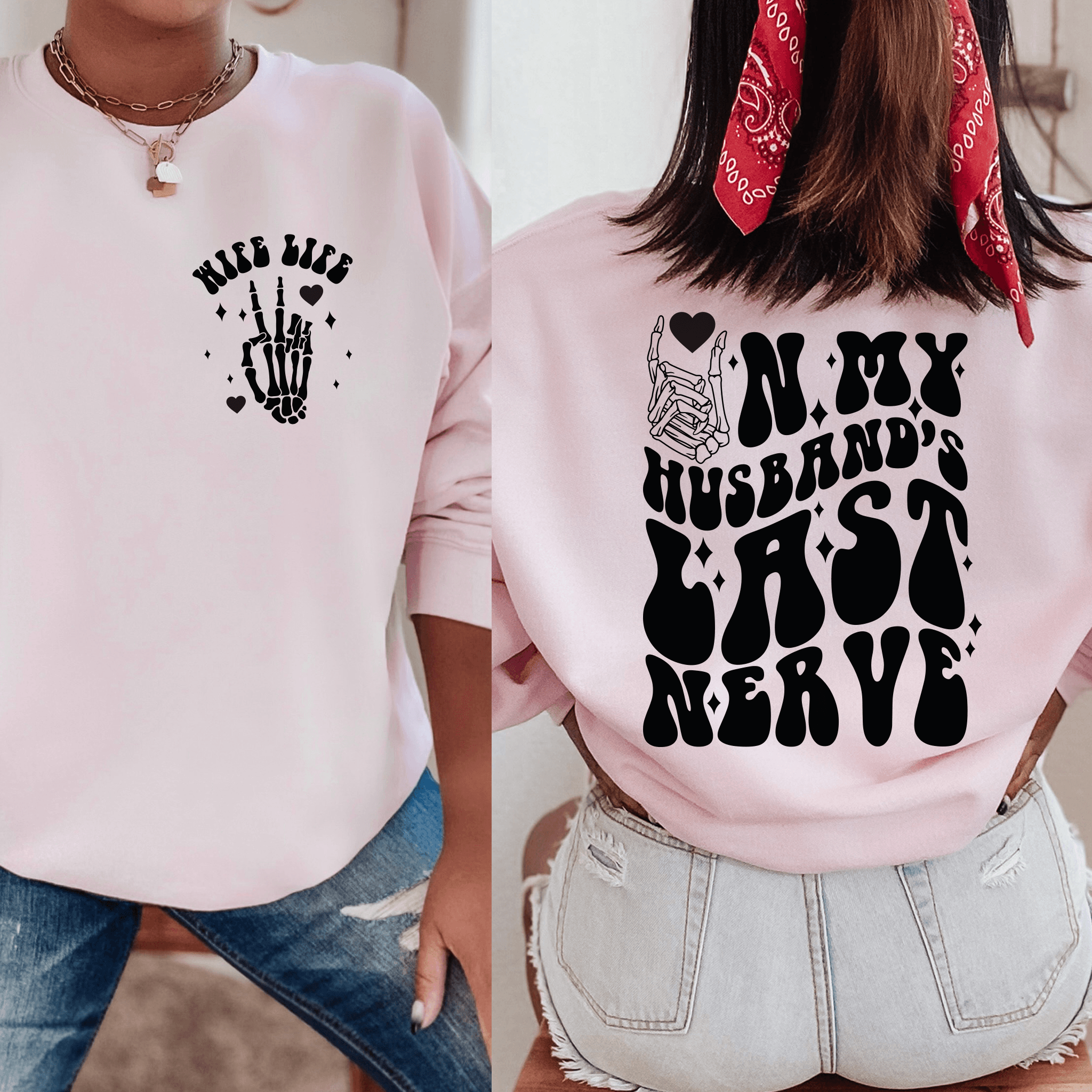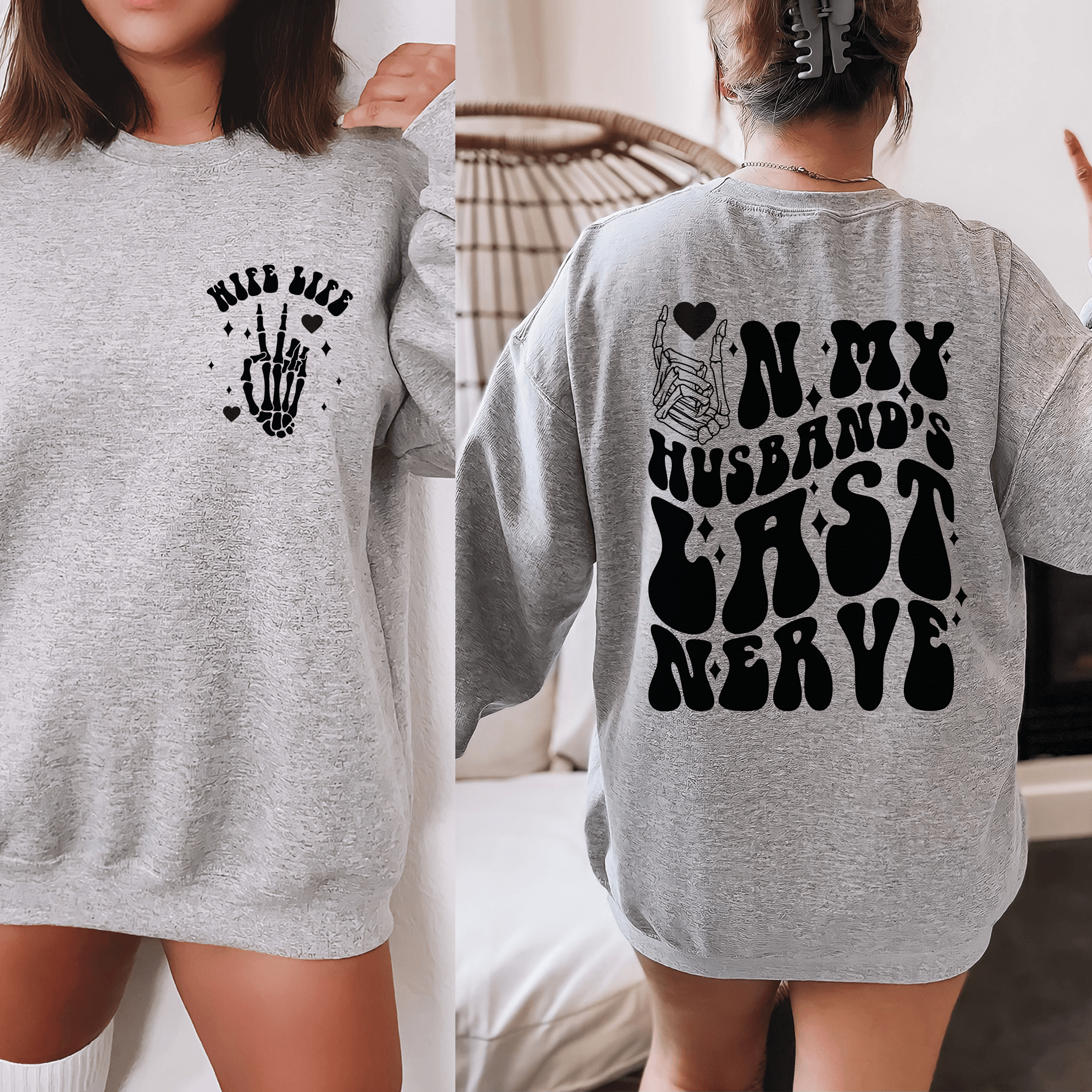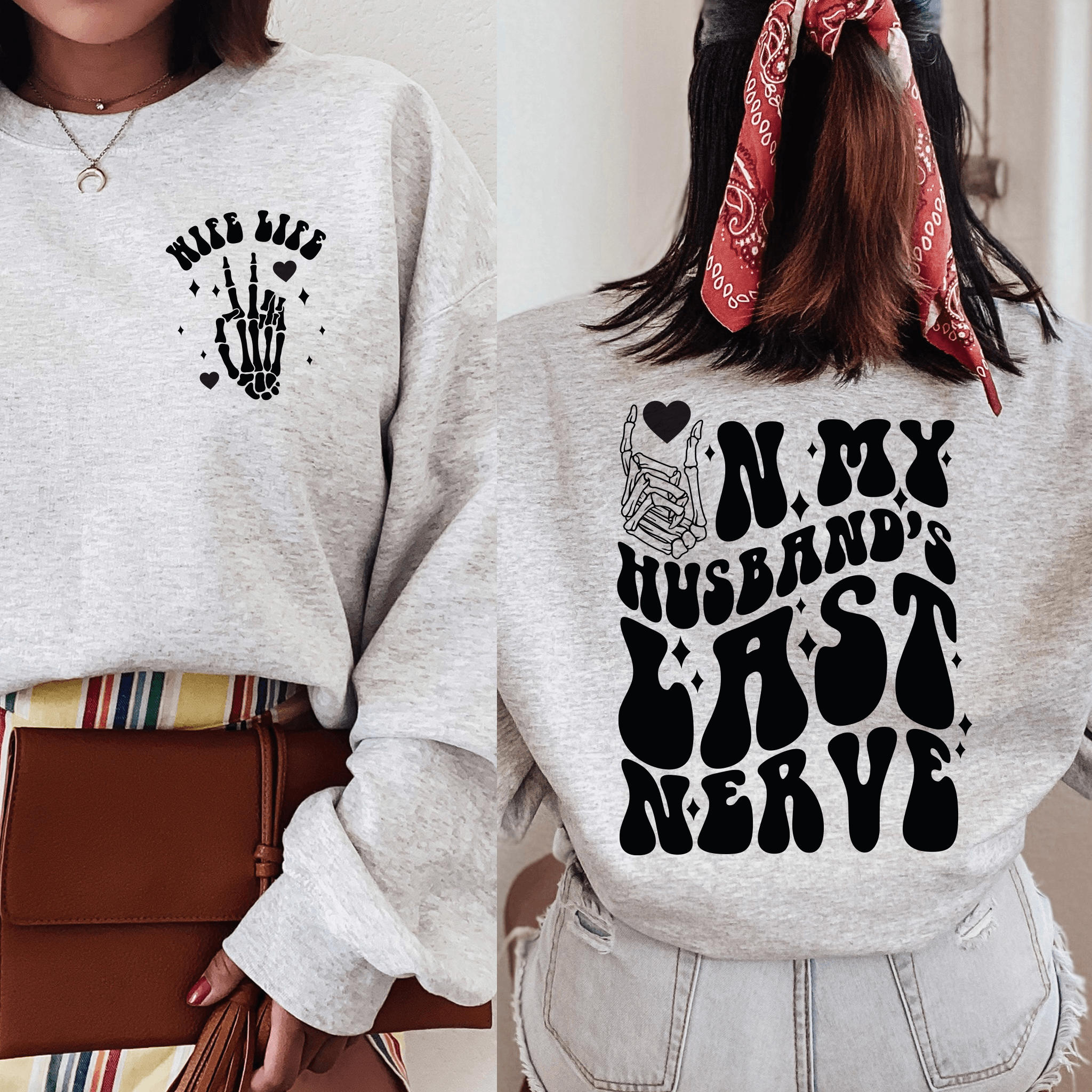 Add a dash of humor to your wardrobe with our 'Playful 'Wife Life' Sweatshirt'! Designed with love by our small business, this sweatshirt features a witty front and back print that's sure to get a chuckle. Celebrate the joys (and jests) of marriage with this light-hearted piece. It's the perfect gift for yourself or the playful wife in your life. Available in multiple colors and sizes, check out our website to pick the one that best fits your fun-loving personality!