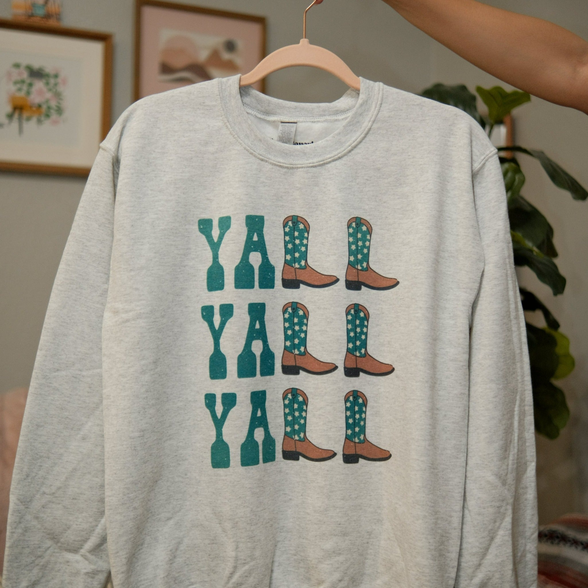 Introducing our trendy "Y'all" sweater, featuring a unique design that combines western boots with Texan slang in a beautiful teal color.