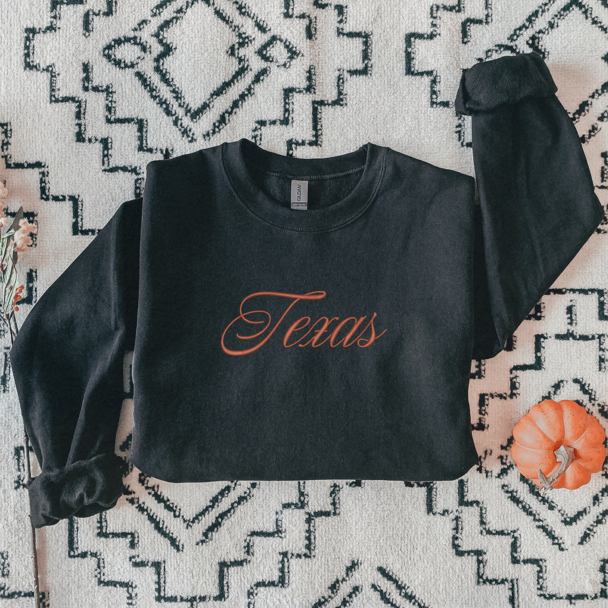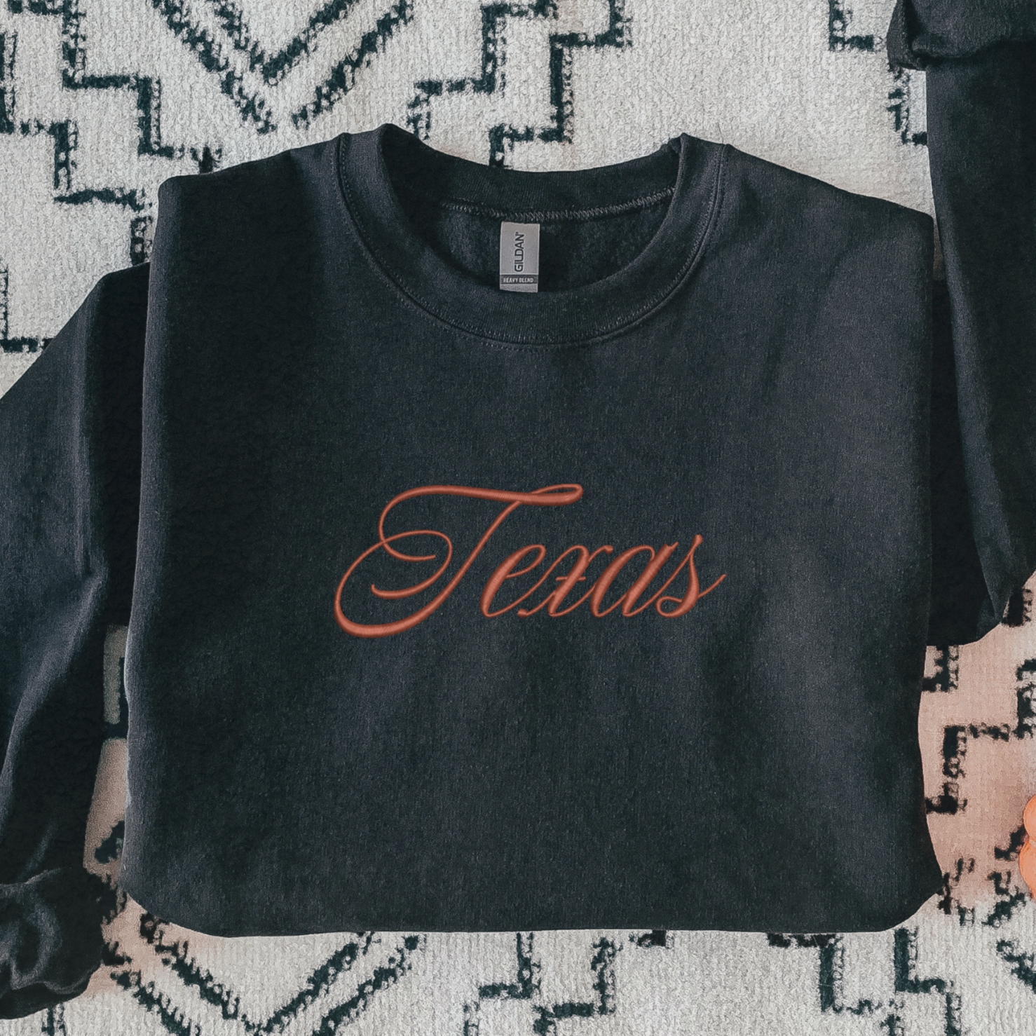 Get comfy in our Embroidered Texas Script Crewneck! We give you the option to choose your thread color.