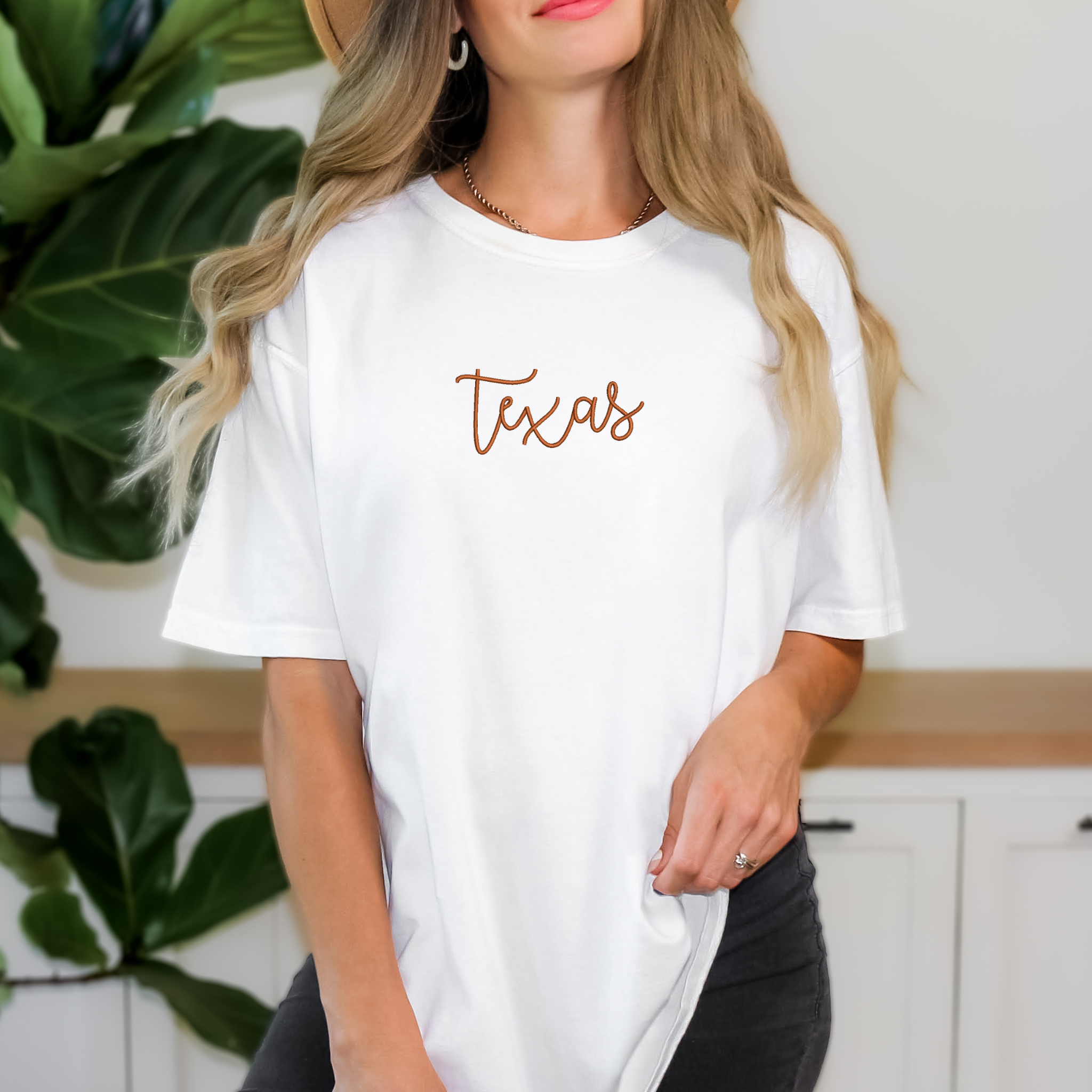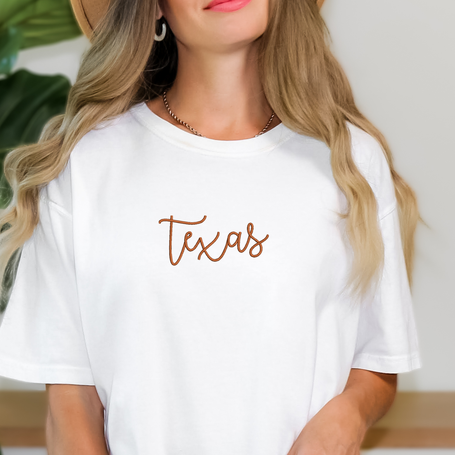 Choose between a Sweatshirt or aT-Shirt with Embroidered Texas Script. Choose your thread color for the Texas letters as well!