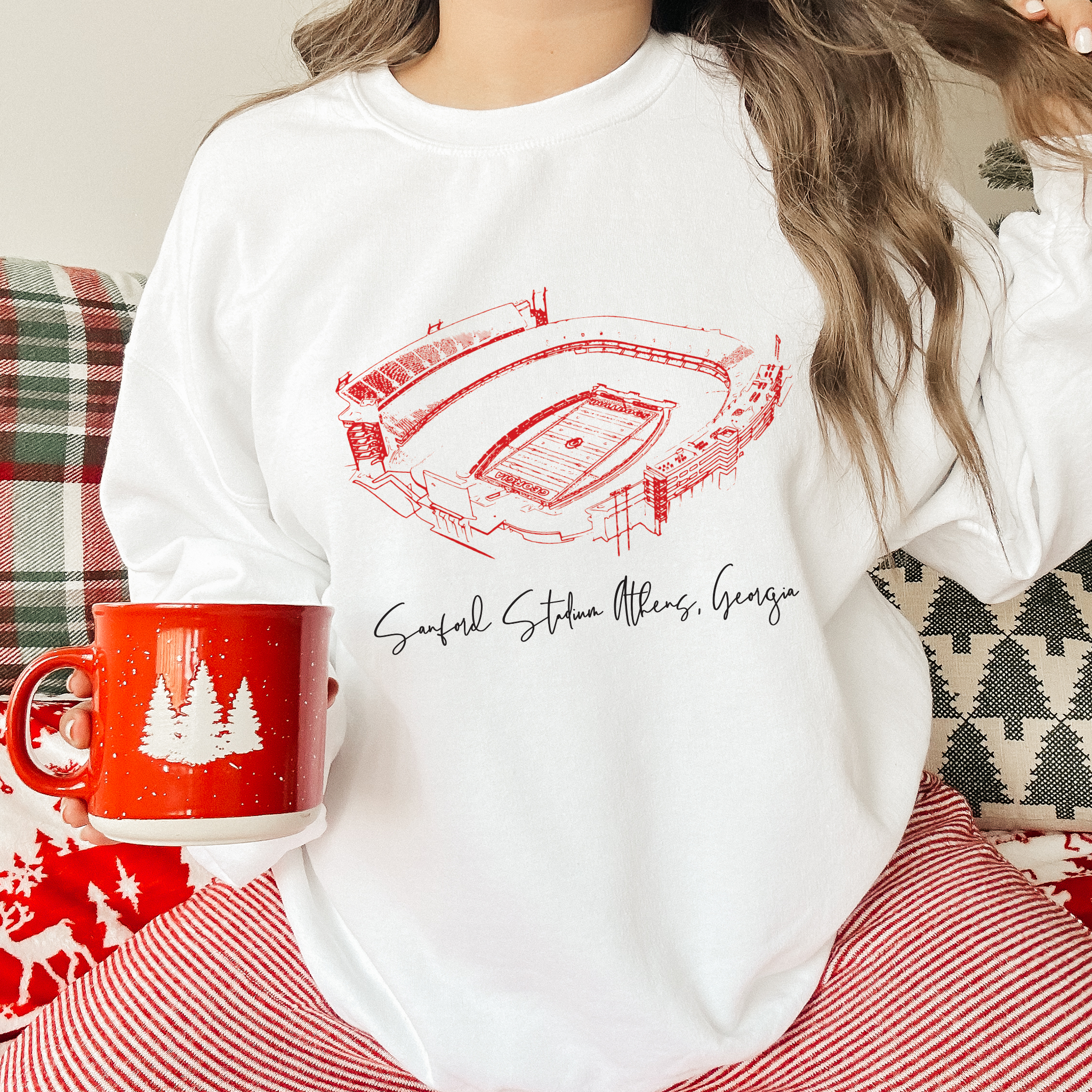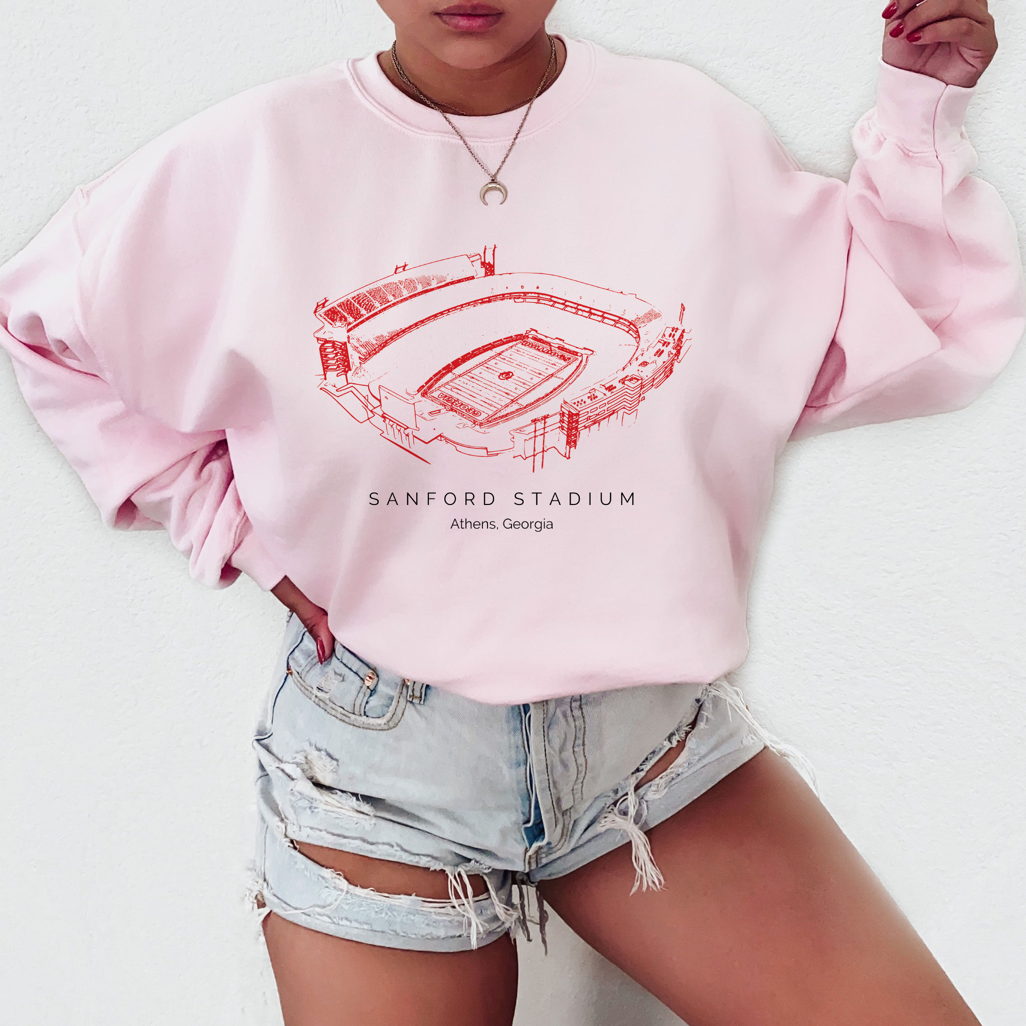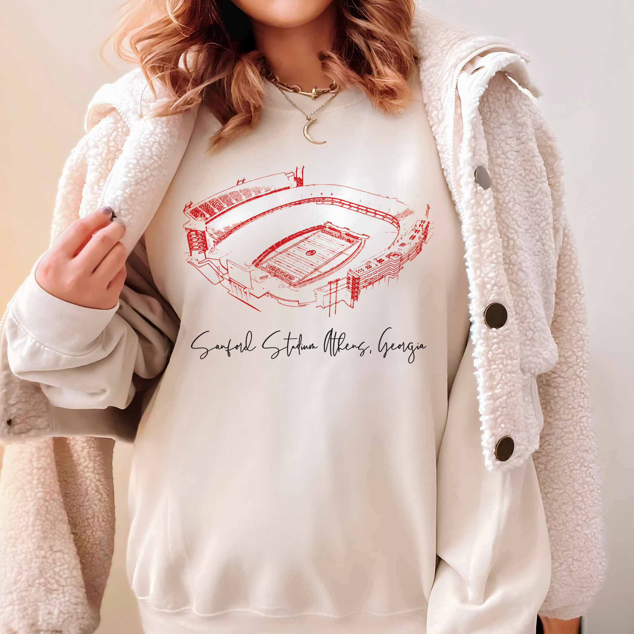 Embrace the spirit of Athens with our 'Sanford Stadium Athens Georgia Sweatshirt' featuring a hand-drawn Sanford Stadium design that celebrates the heart of Georgia. Crafted by a dedicated small business, this sweatshirt comes in an array of colors and sizes to suit your style, all available on our website. It's more than just apparel; it's a personal touch of local pride, perfect for any day you want to carry a piece of home with you. Support small, feel big, and wear your Athens heart on your sleeve.