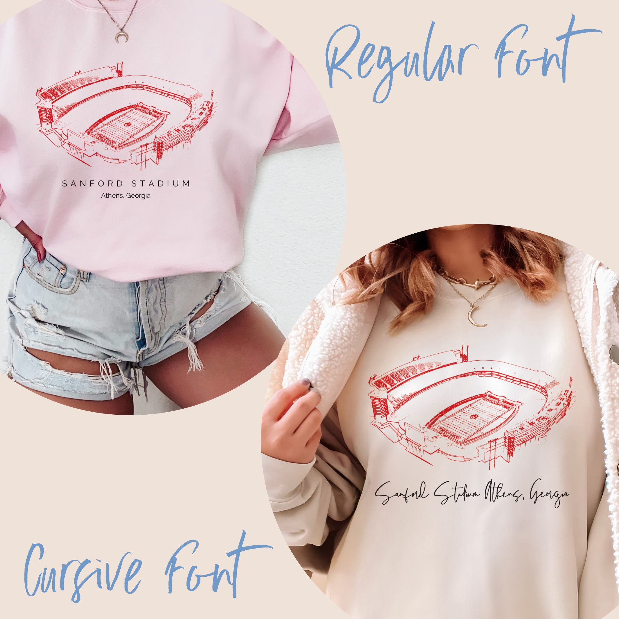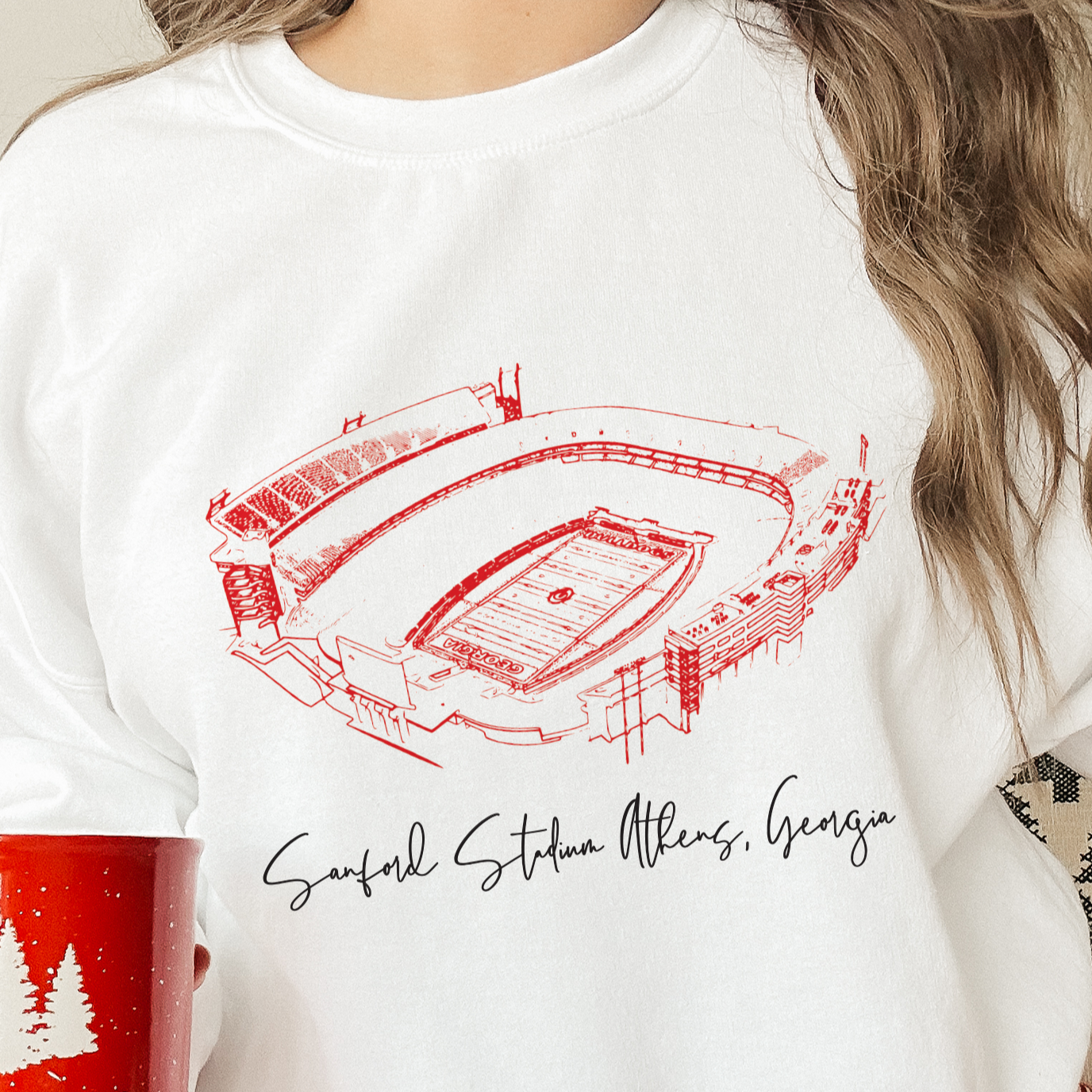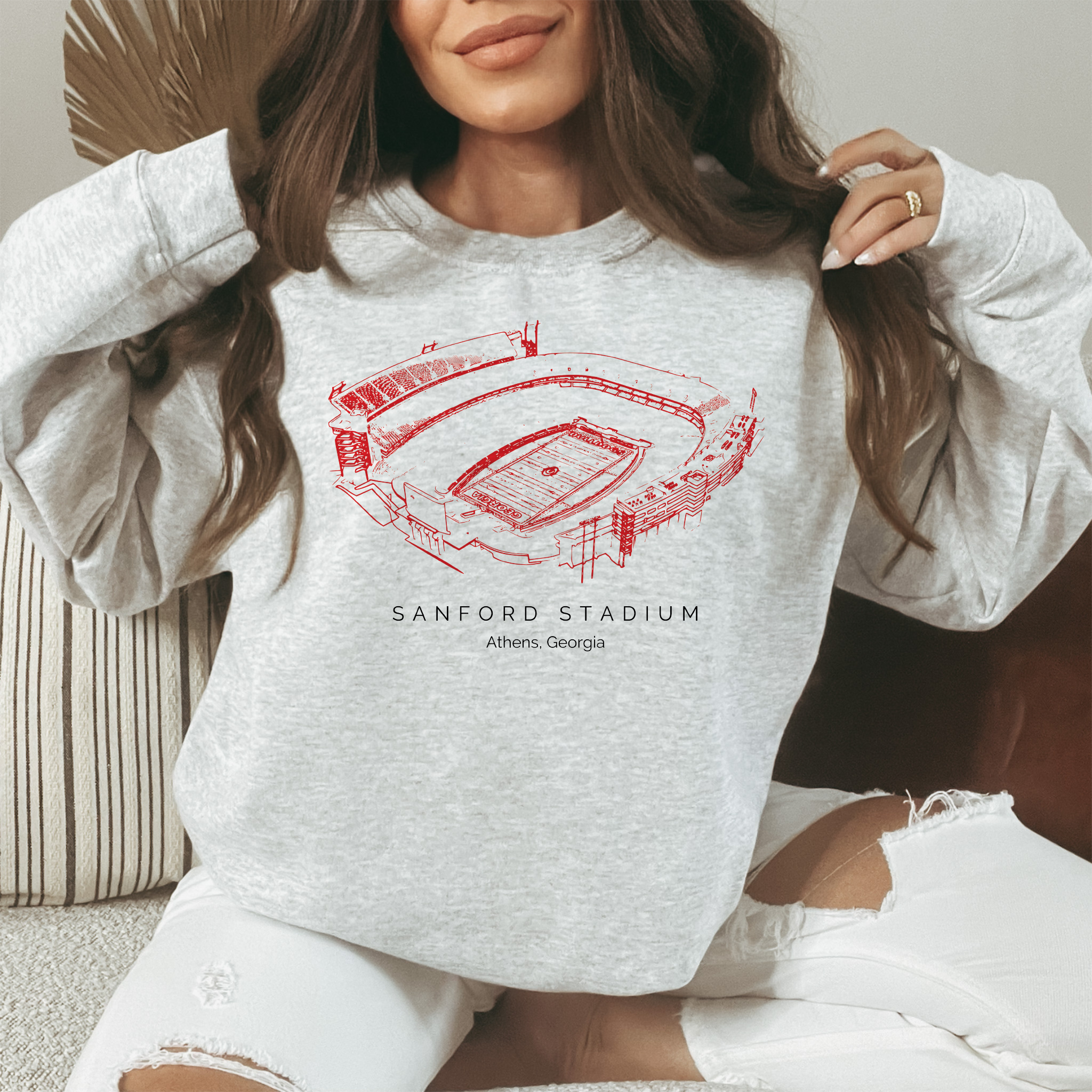 Embrace the spirit of Athens with our 'Sanford Stadium Athens Georgia Sweatshirt' featuring a hand-drawn Sanford Stadium design that celebrates the heart of Georgia. Crafted by a dedicated small business, this sweatshirt comes in an array of colors and sizes to suit your style, all available on our website. It's more than just apparel; it's a personal touch of local pride, perfect for any day you want to carry a piece of home with you. Support small, feel big, and wear your Athens heart on your sleeve.