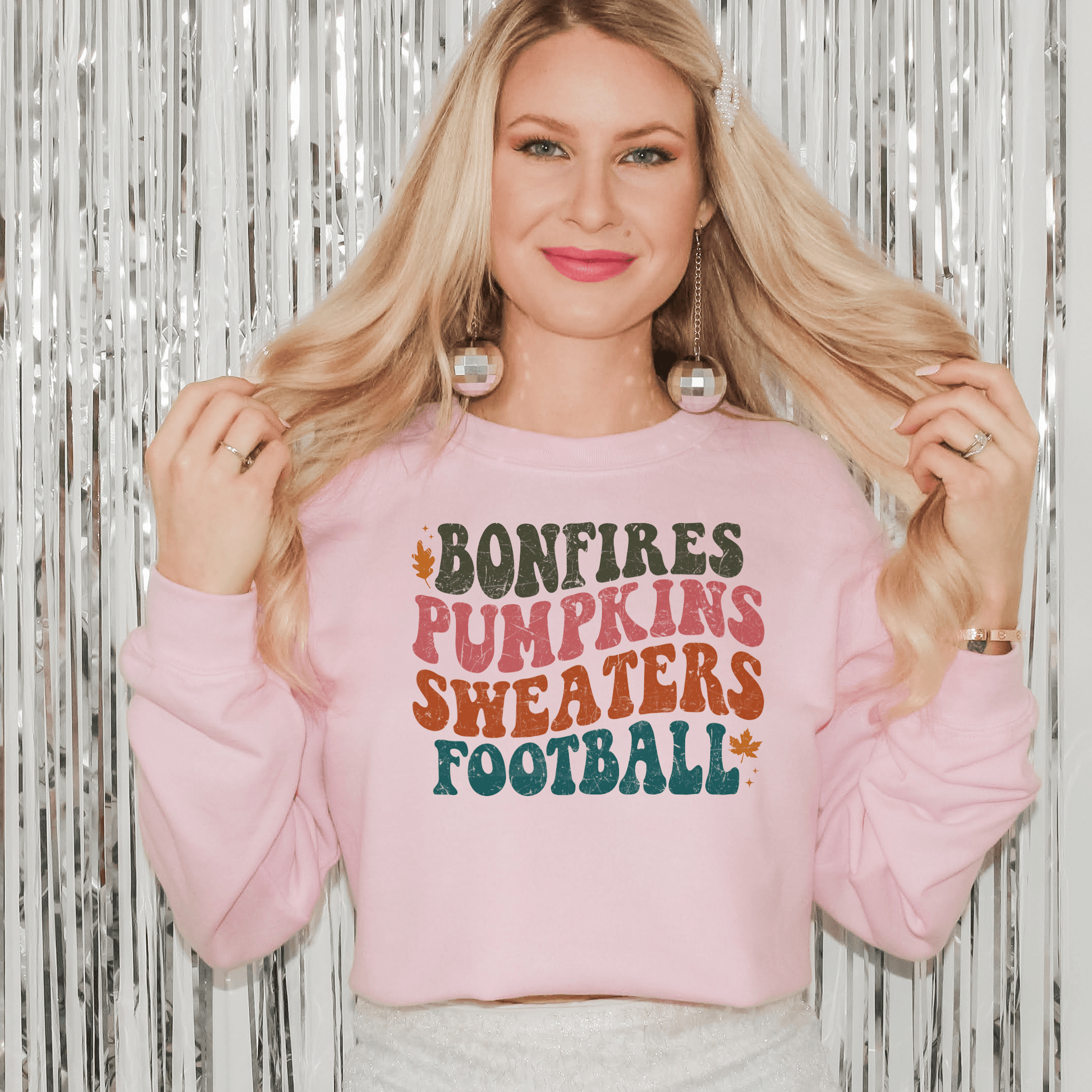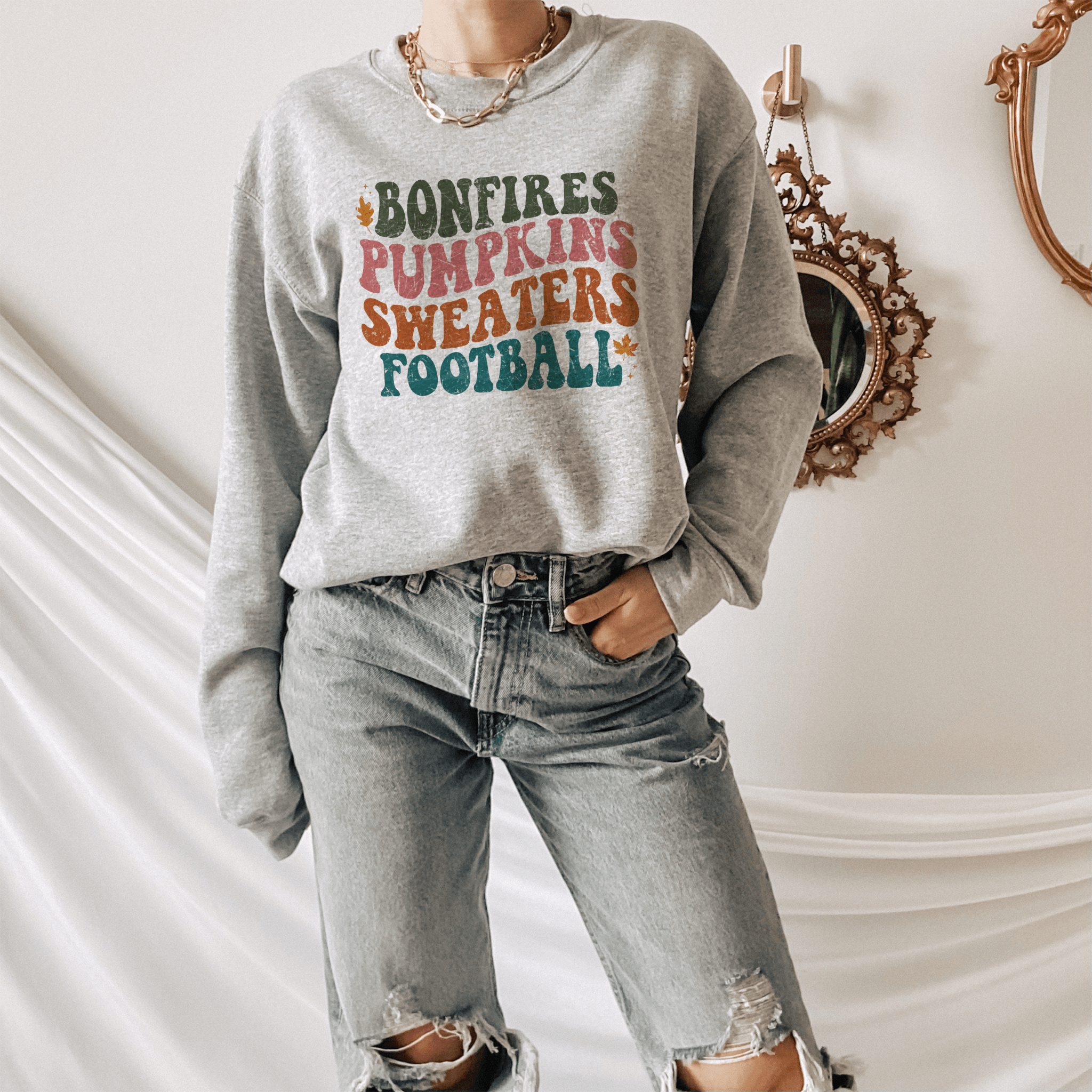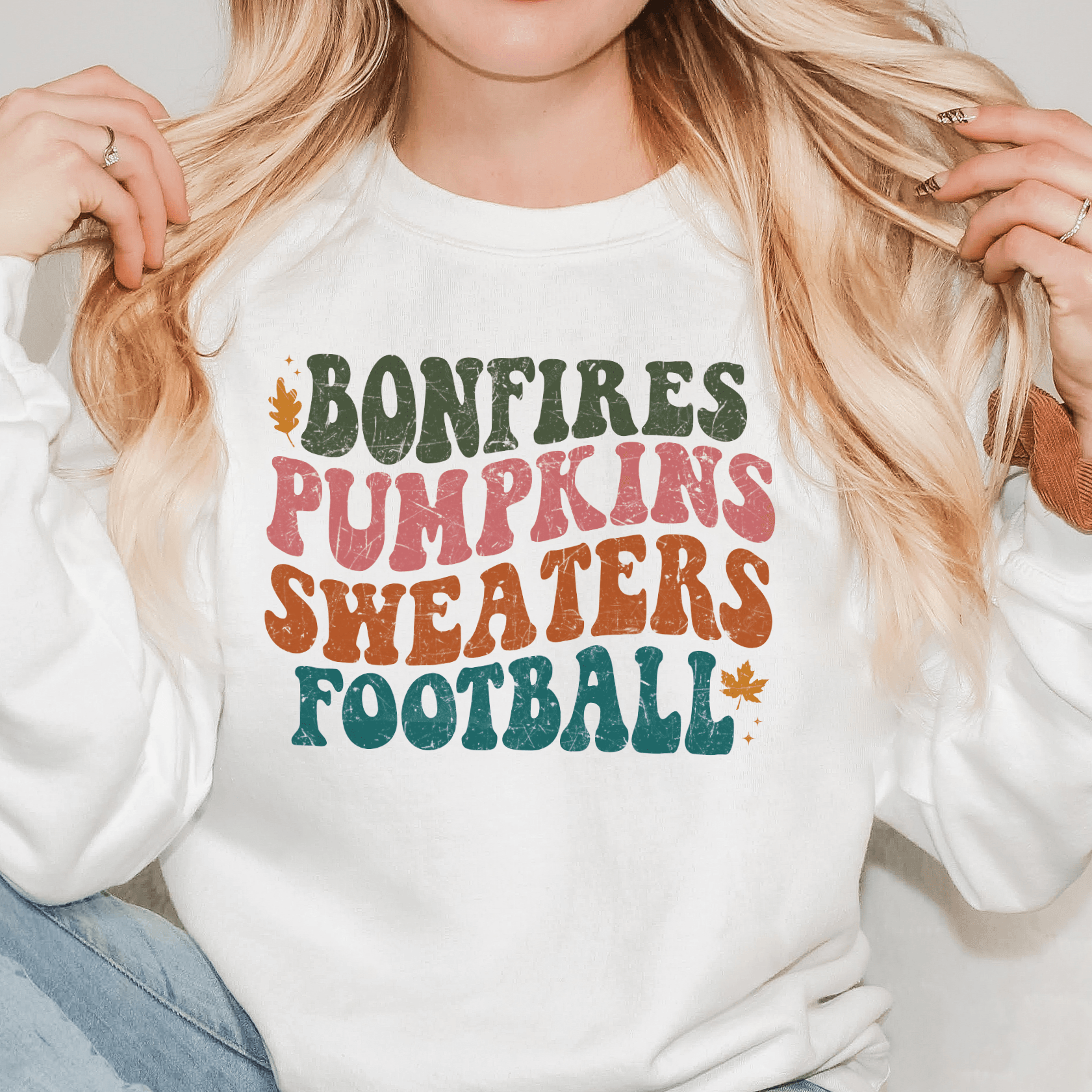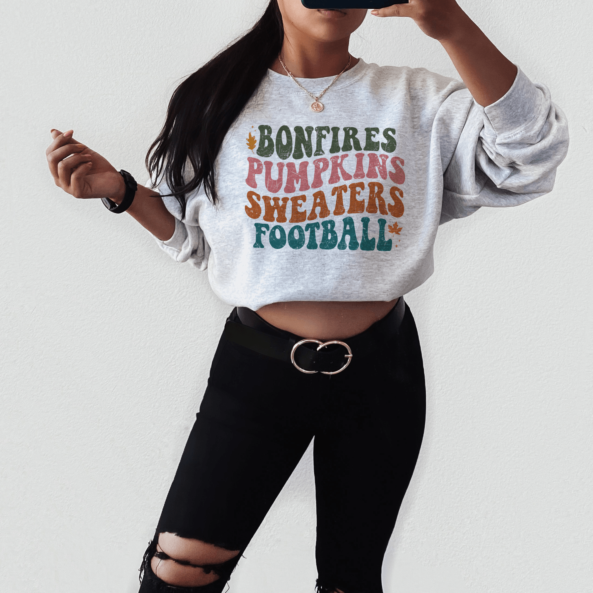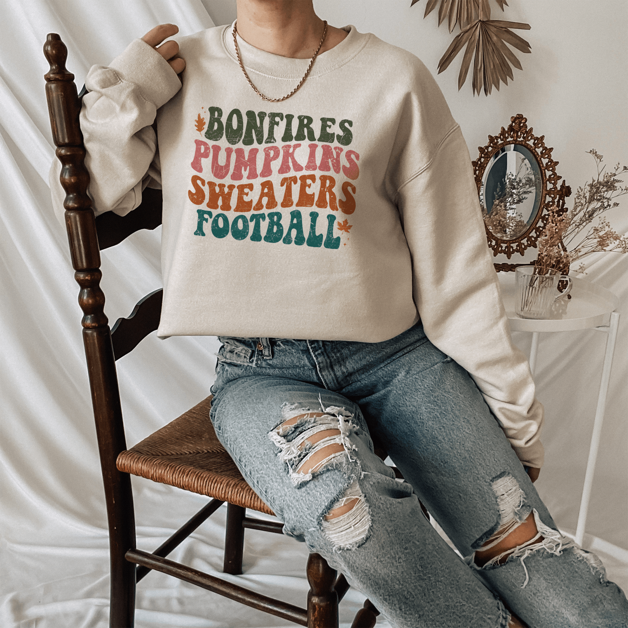 Embrace the essence of fall with our 'Autumn Vibes Bonfires and Football'. Each piece features a vibrant celebration of the season's best: bonfires, pumpkins, sweaters, and football. This cozy sweatshirt is a small business gem, available in various colors and sizes to complement your fall wardrobe. Check out our website to select your autumnal shade and size, and step into the season with style!