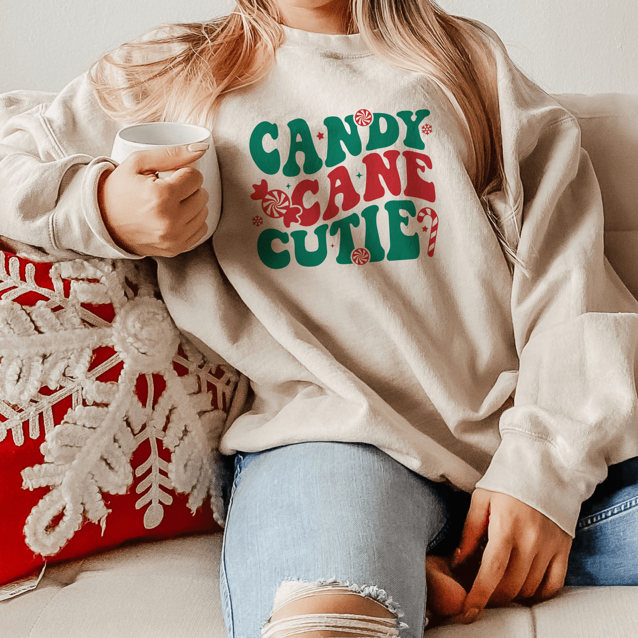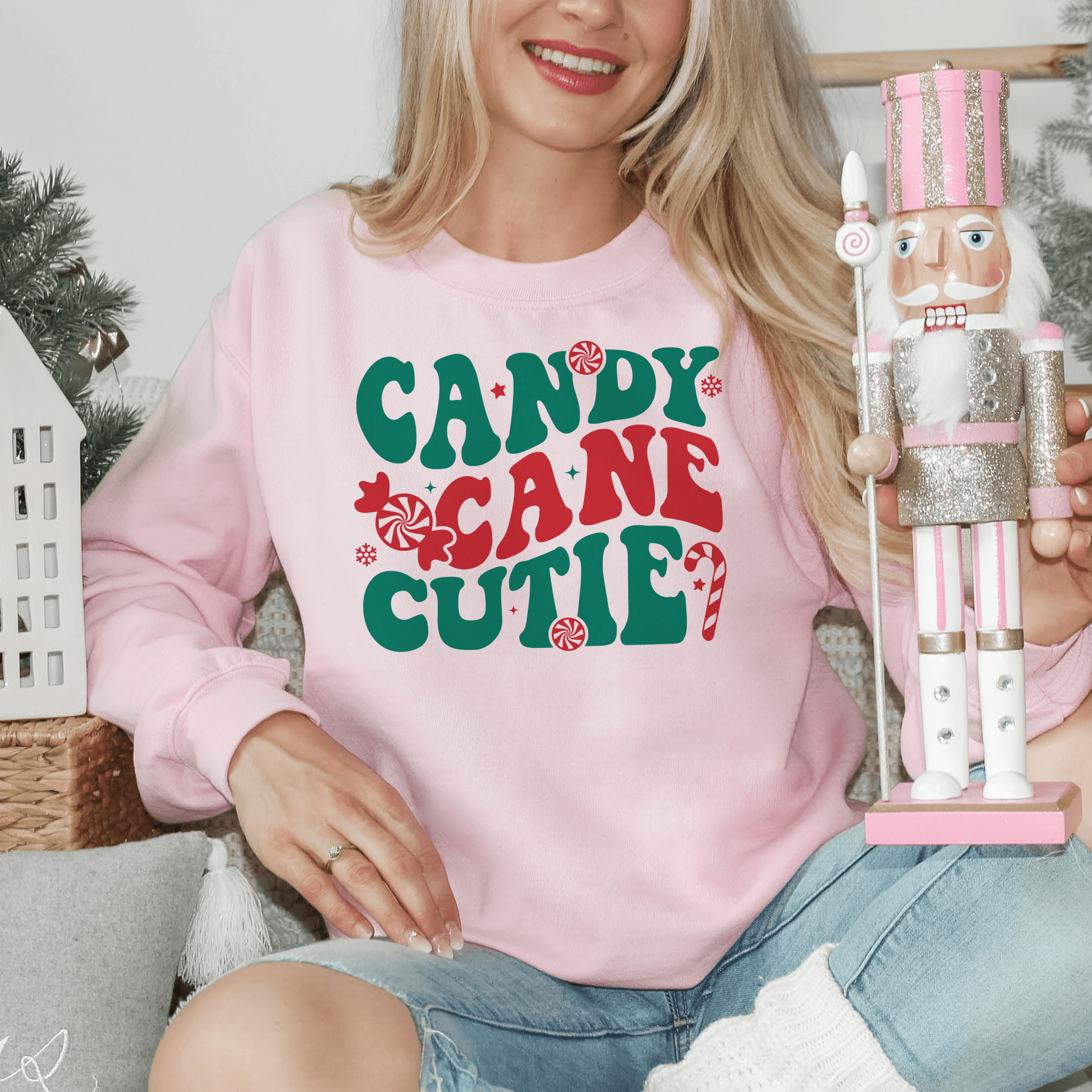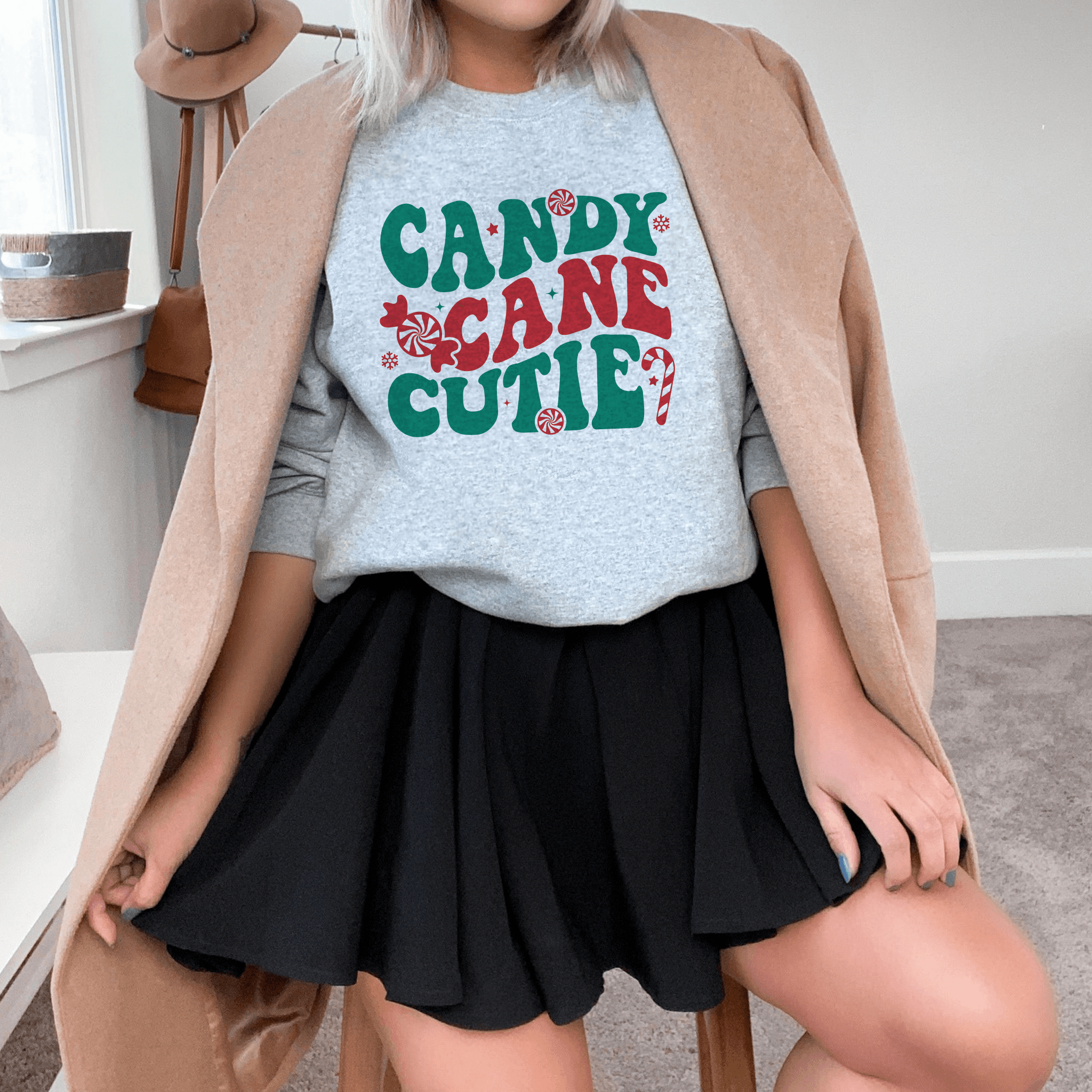 Get ready to be the sweetest part of the holiday season with our 'Christmas Charm 'Candy Cane Cutie' Sweatshirt'. Handcrafted by our small business, this adorable top is your perfect festive pick for Christmas parties or cozy winter days. With a playful candy cane design, it's sure to be a hit. Available in an array of colors and sizes to ensure a flattering fit for everyone. Visit our website to find your favorite and flaunt your 'Candy Cane Cutie' style this holiday!