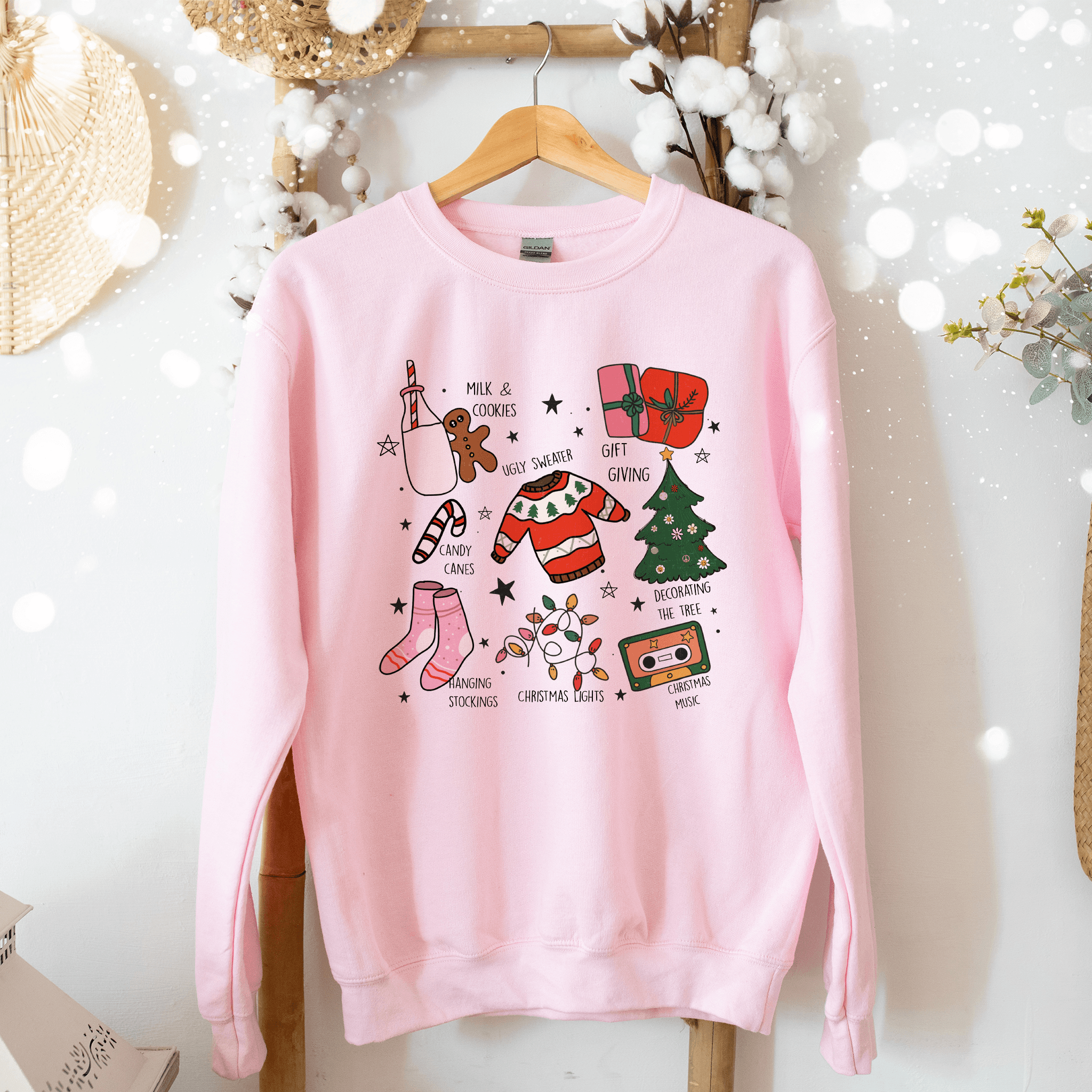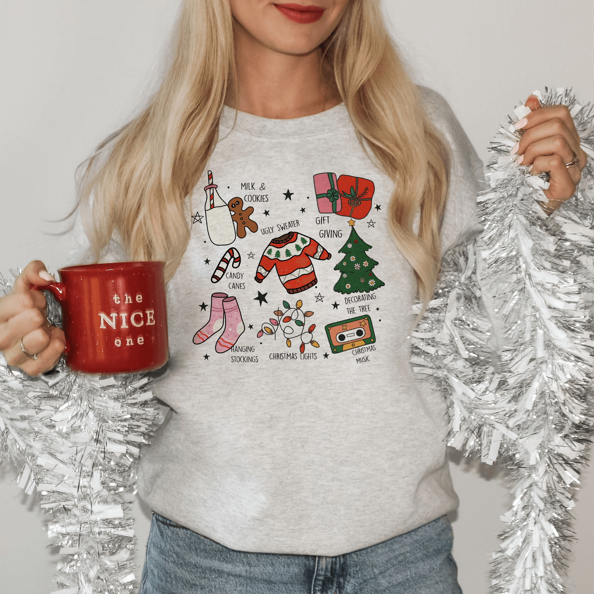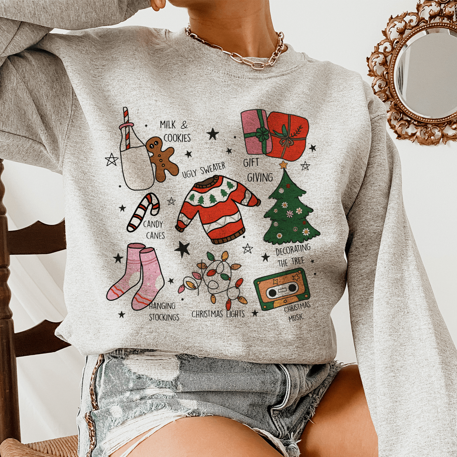 Step into the season of joy with our 'Christmas Traditions Illustrated Sweatshirt'. Boasting vibrant hand-drawn illustrations that capture the essence of the holidays, from the warmth of 'Milk & Cookies' to the fun of 'Ugly Sweaters'. This cozy pullover comes in a variety of colors and sizes, available exclusively on our website. Lovingly crafted by our small business, it's more than a sweatshirt—it's the spirit of Christmas wrapped in comfort.