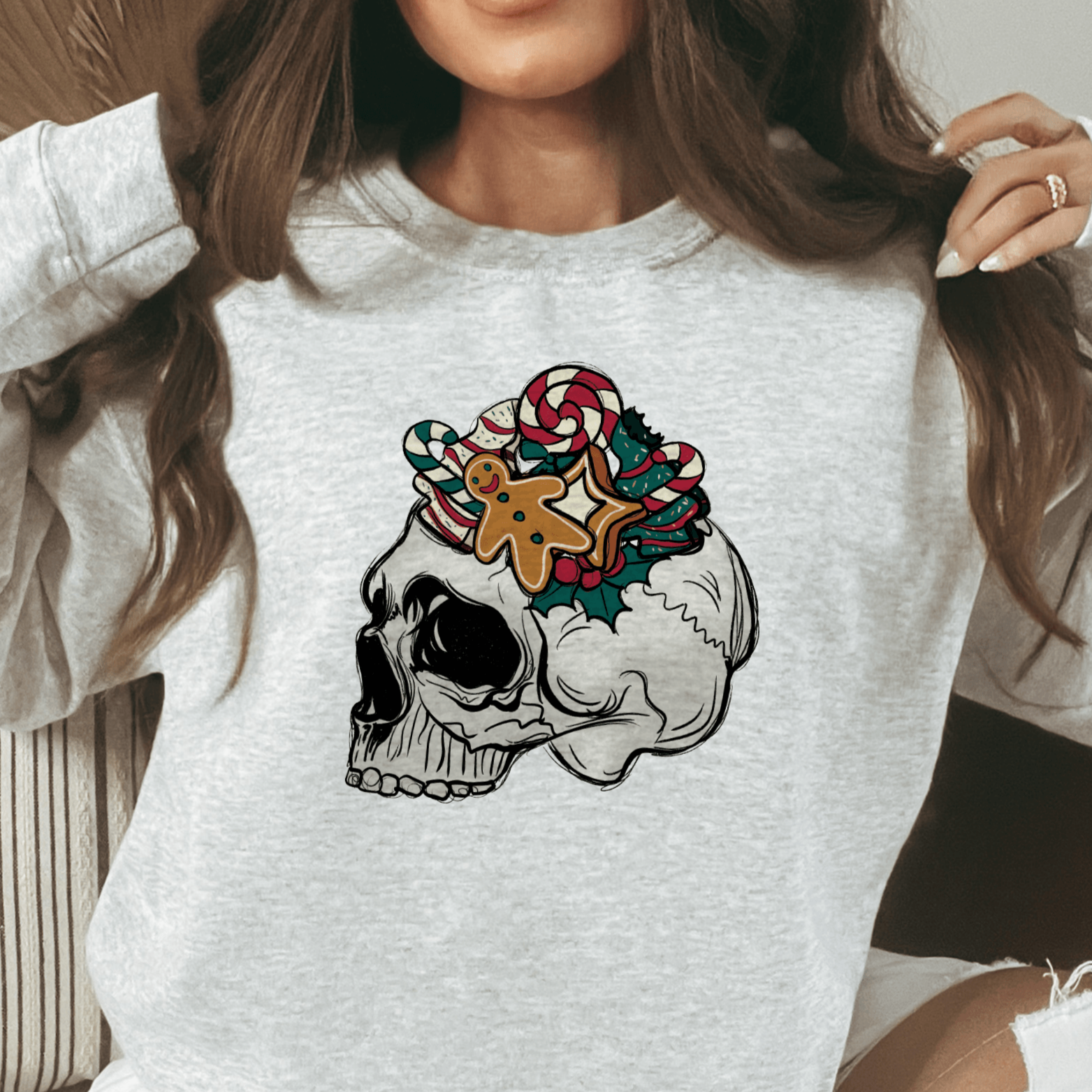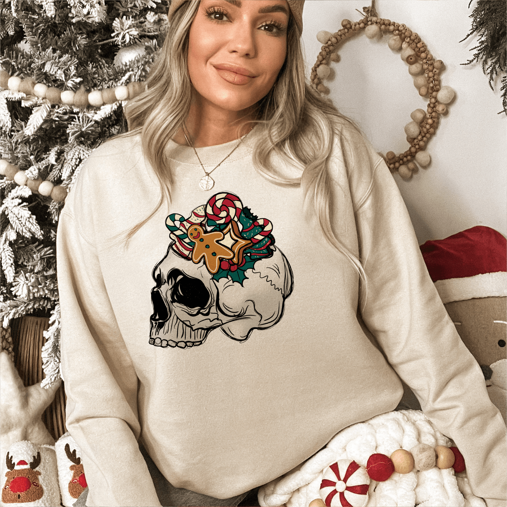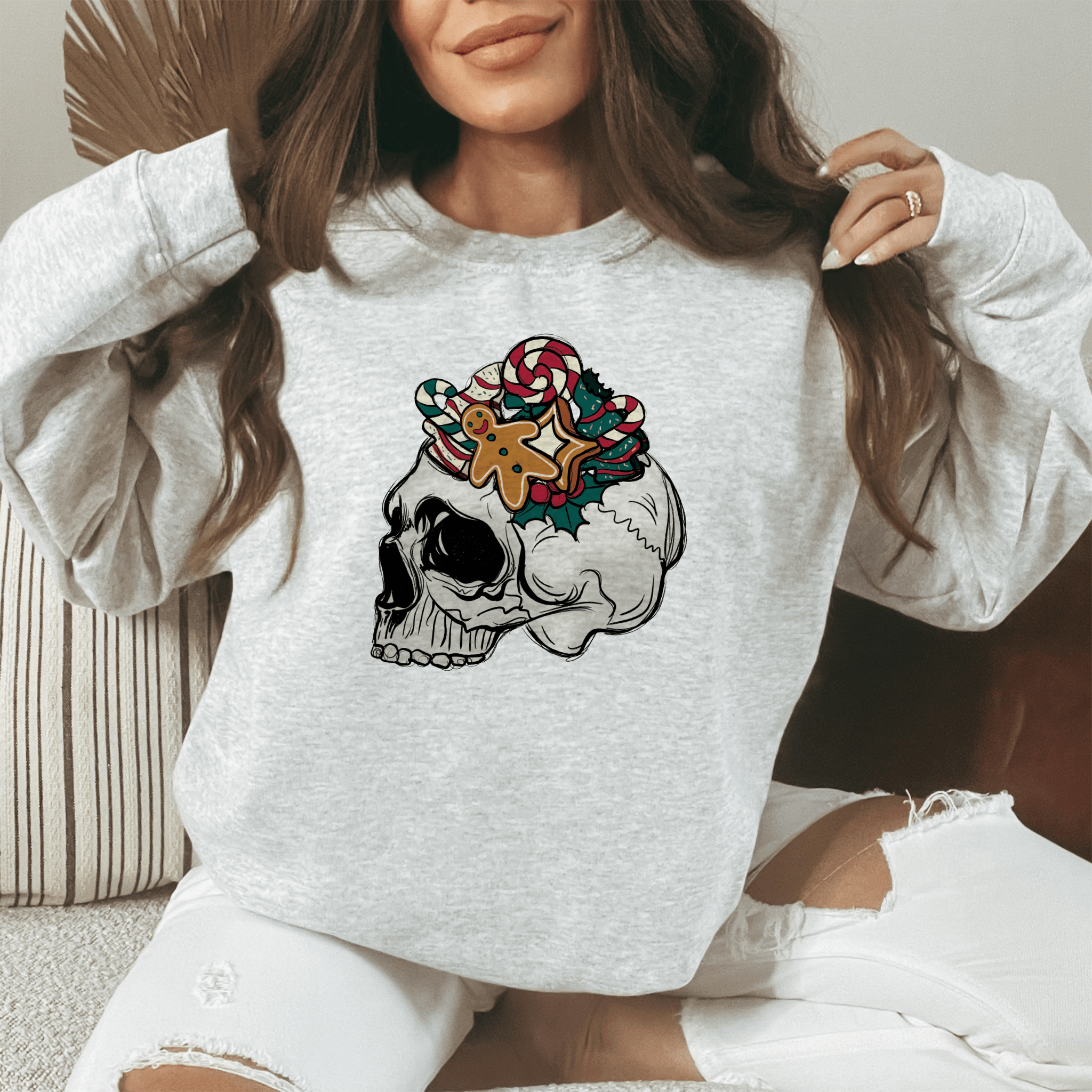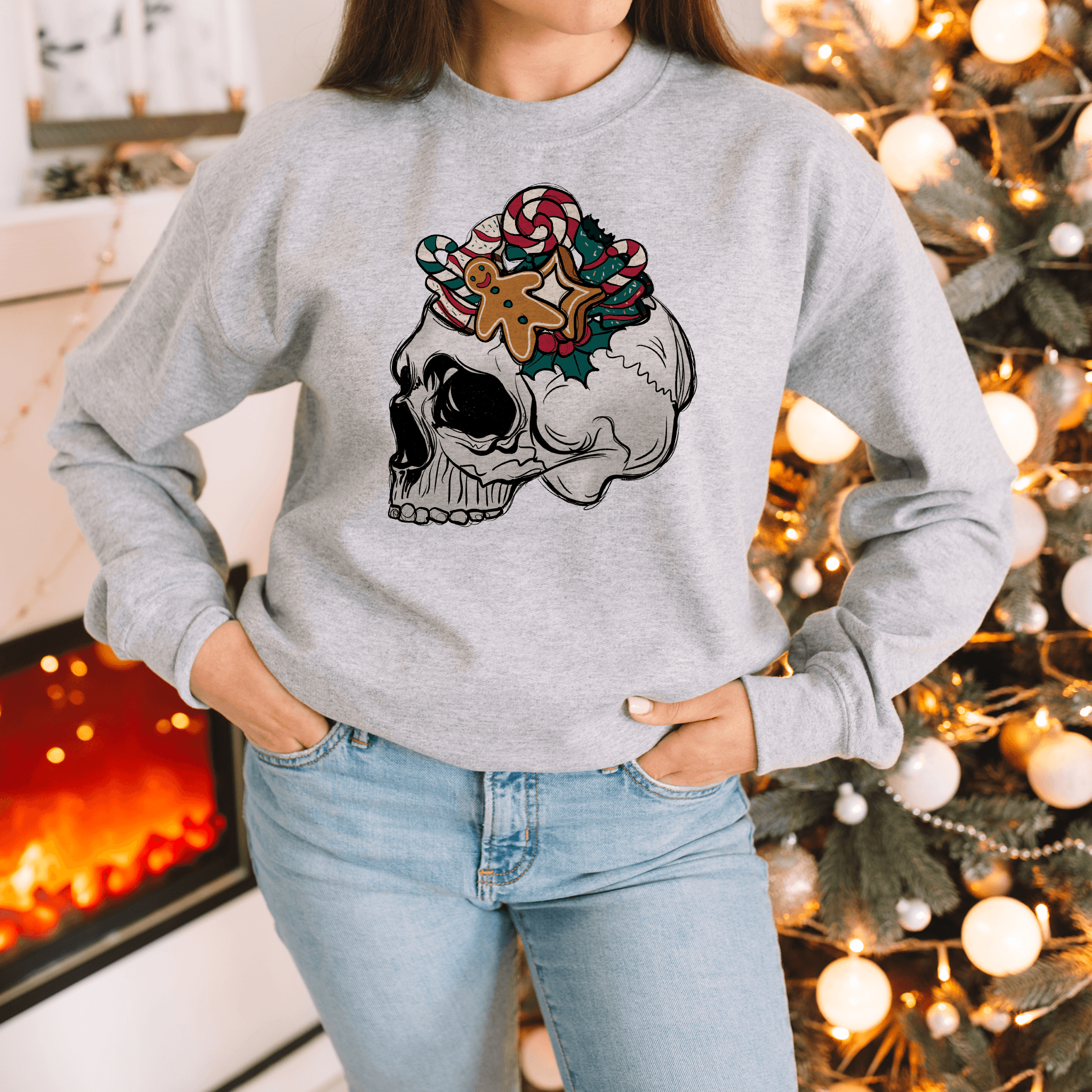 Merge tradition with a twist in our 'Christmas Skull Sweatshirt'. Featuring a unique skull adorned with festive decorations, this sweatshirt adds an edgy flair to your holiday wardrobe. Available in a rainbow of colors and various sizes on our website. Proudly designed and crafted by our small business, combining style, comfort, and a sprinkle of holiday magic