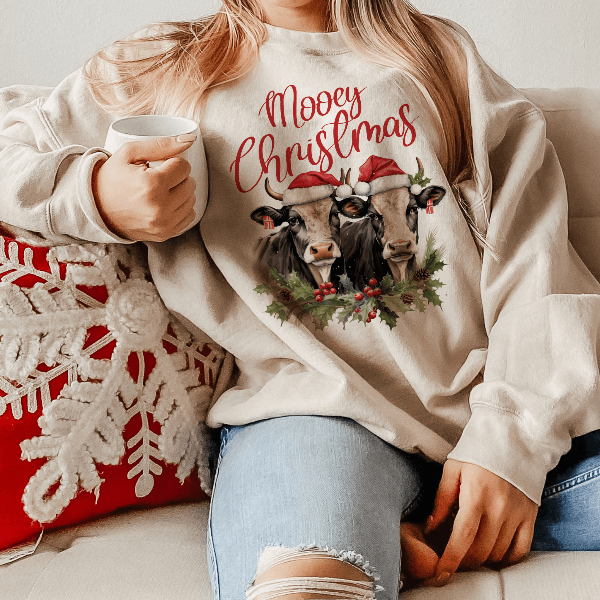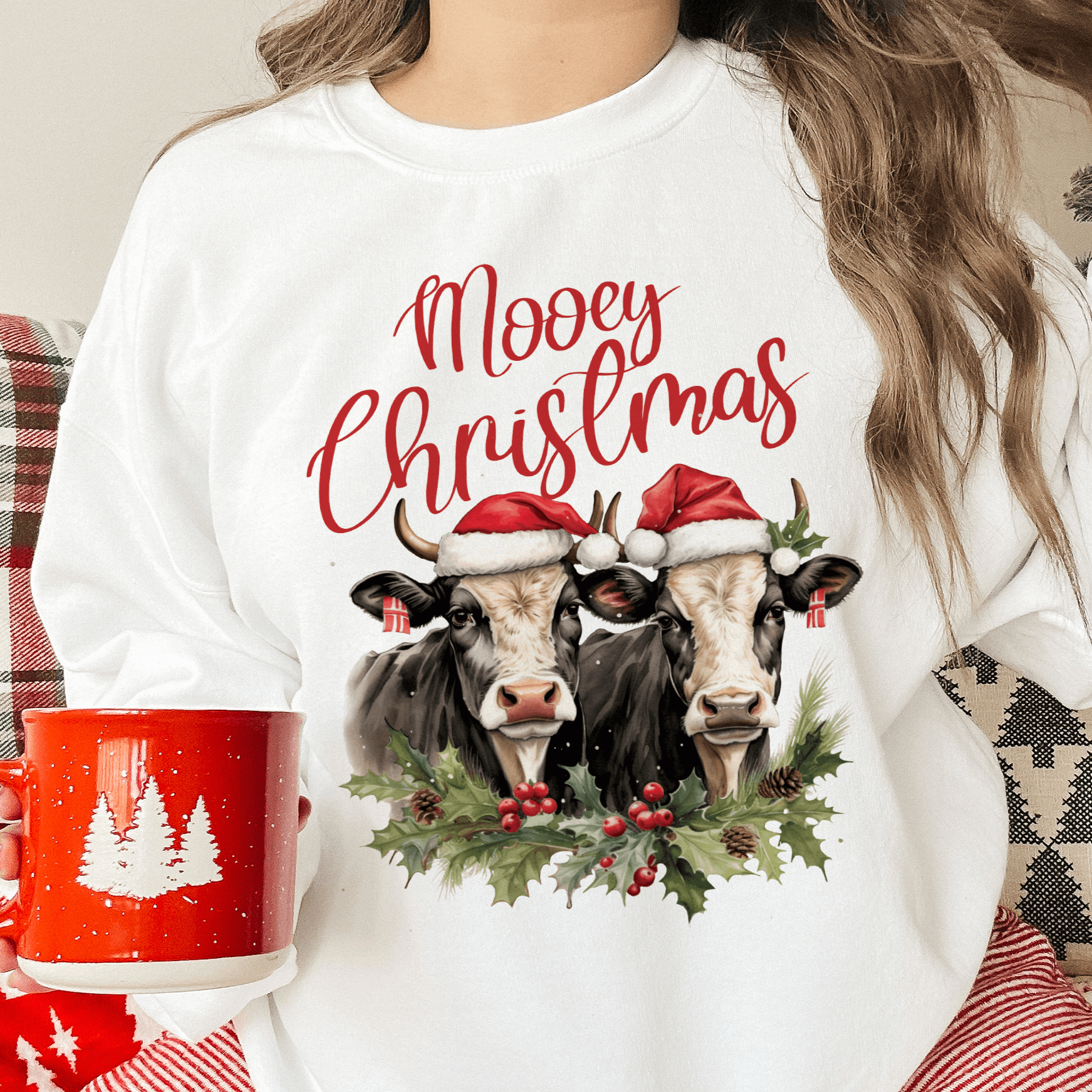 Embrace the holiday spirit with our 'Mooey Christmas Cow Sweatshirt'! This soft and cozy pullover showcases two festive cows adorned in seasonal attire, bringing a touch of farmhouse charm to your winter wardrobe. Available in a variety of colors and sizes on our website. Lovingly designed by our small business, it's the perfect unique piece for cow lovers and Christmas enthusiasts alike!