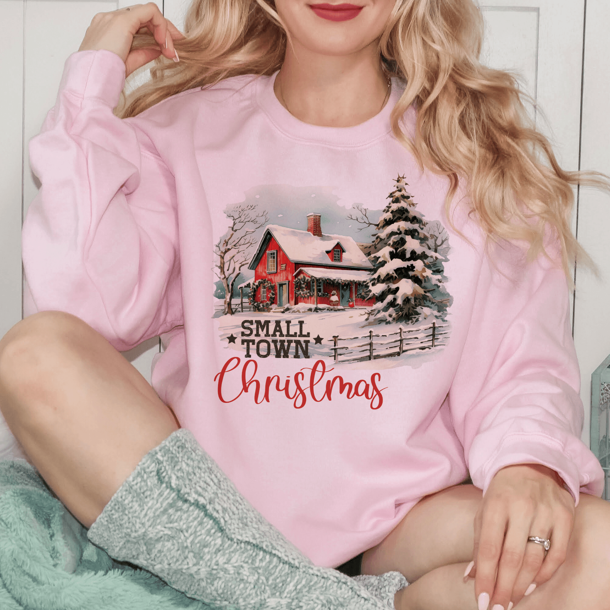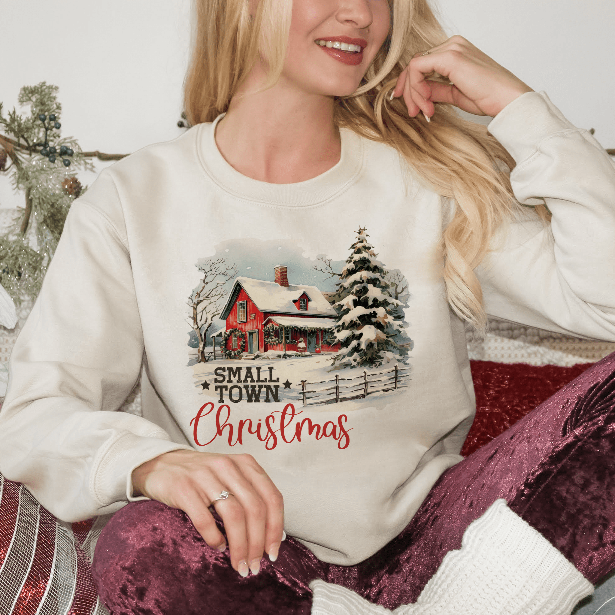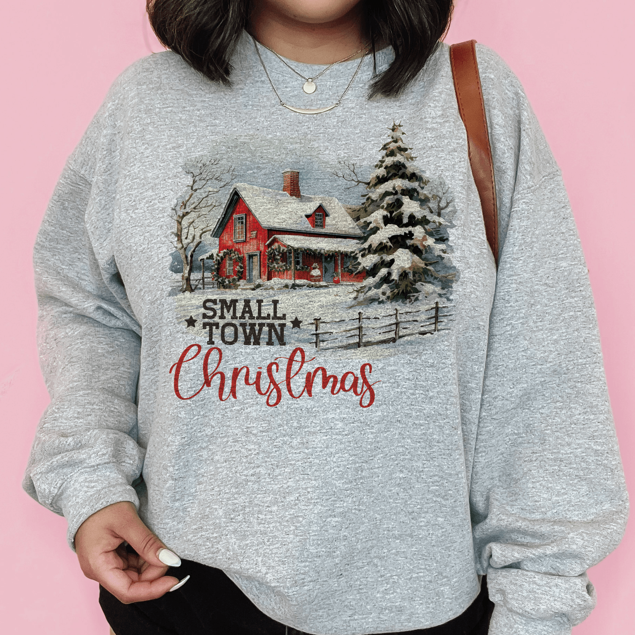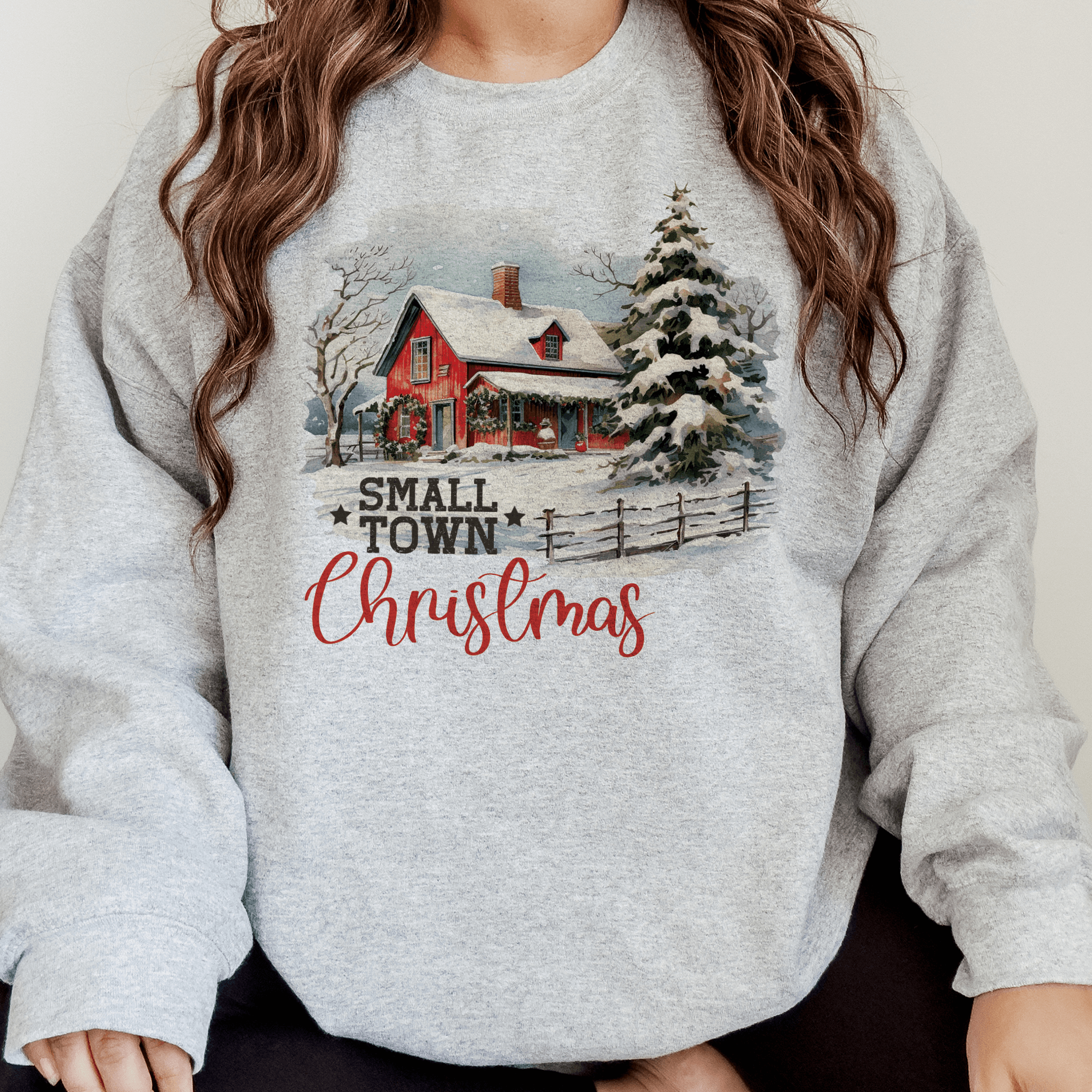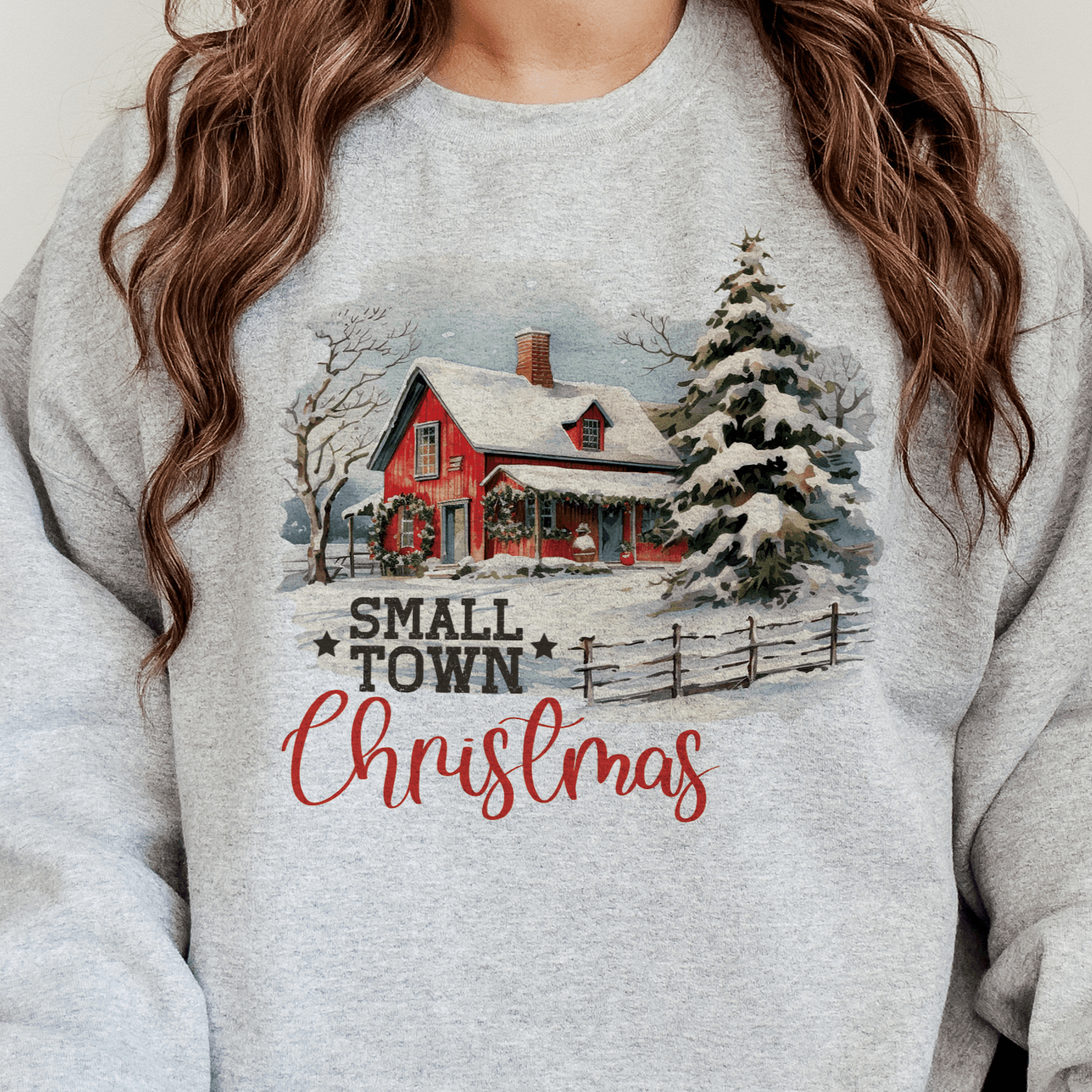 Embrace the charm of a 'Small Town Christmas' with our beautifully designed sweatshirt. Depicting a picturesque winter scene complete with a snow-covered house and pine tree, this top is the epitome of holiday warmth. Available in a range of colors and sizes on our website, each piece is crafted with love and care by our dedicated small business. Cozy up in style this season and let the spirit of Christmas shine through