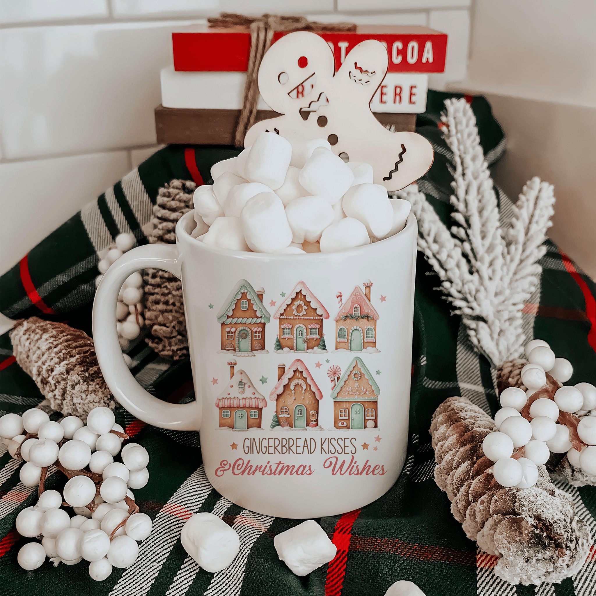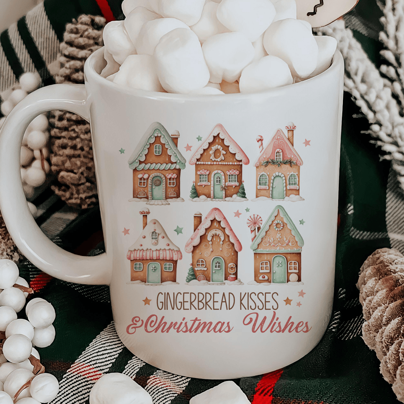 Immerse in the holiday spirit with our 'Gingerbread Village Christmas Mug'. Crafted with detailed gingerbread houses and the heartwarming phrase 'Gingerbread Kisses & Christmas Wishes', this 12 oz ceramic mug is perfect for your winter beverages. Exclusively designed by our passionate small business to elevate your festive moments.