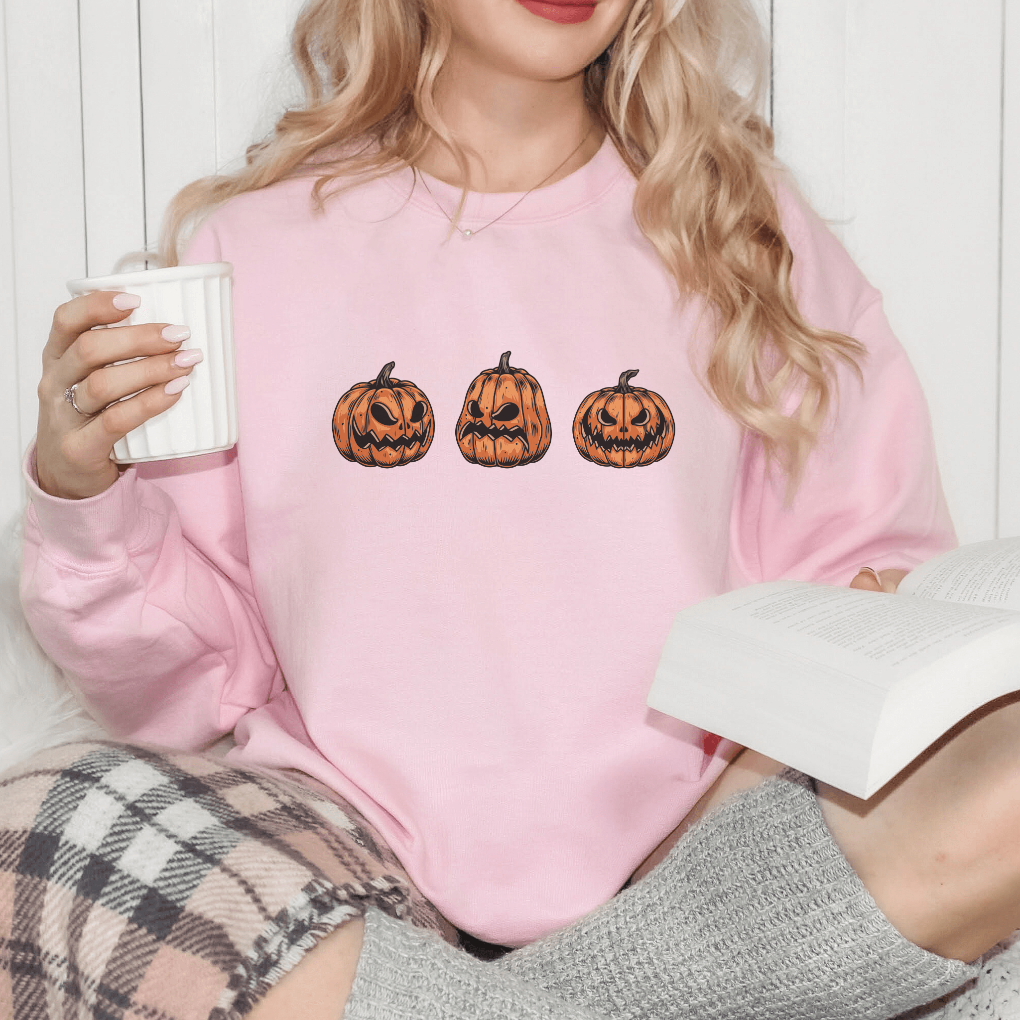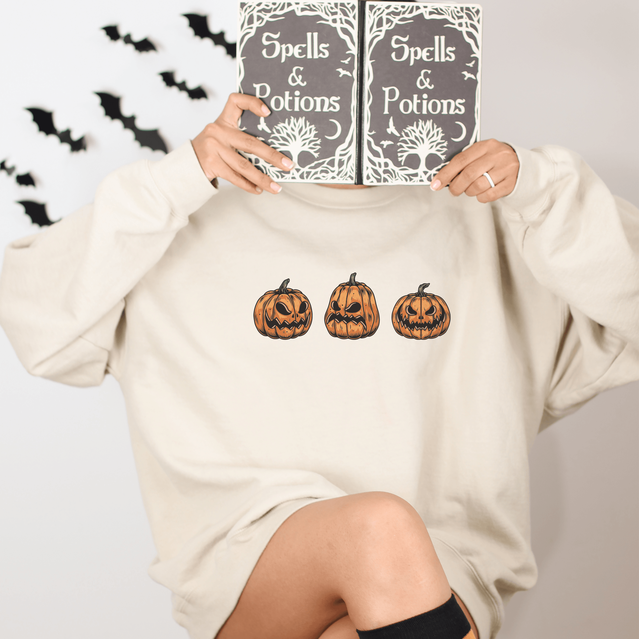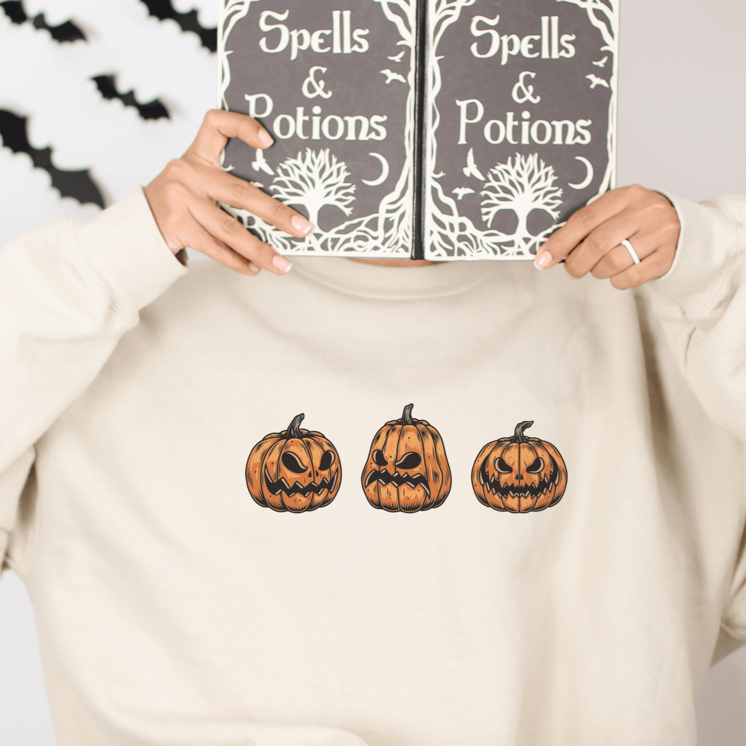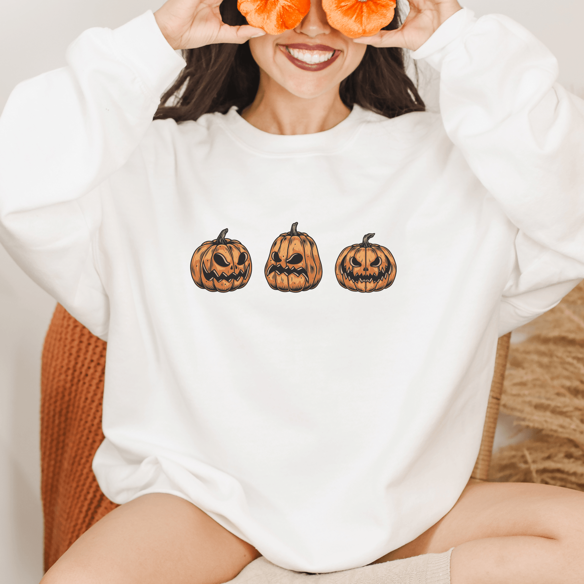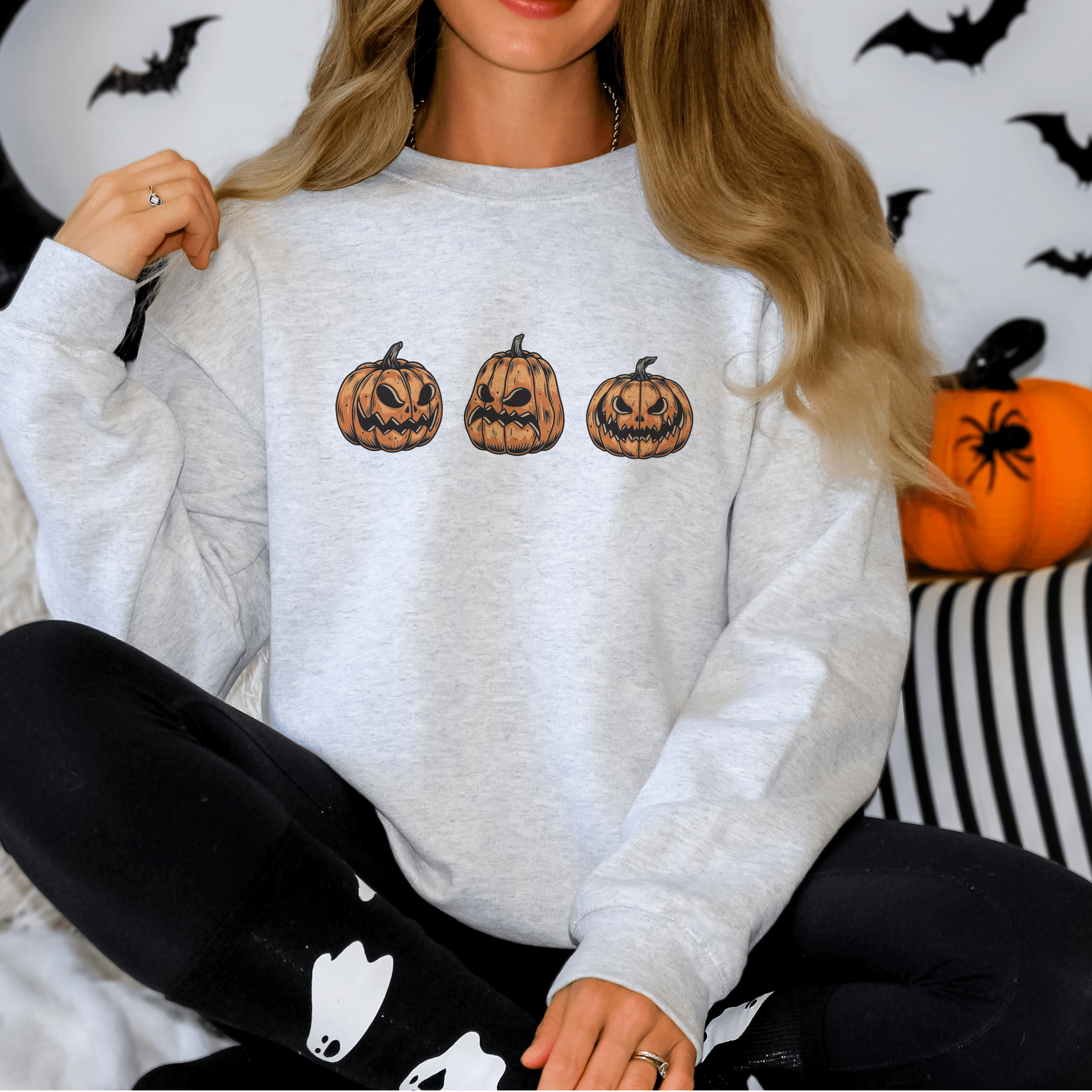 Get into the Halloween groove with our 'Halloween Jack O' Lantern' sweatshirt. It's decked out with three cheeky jack o' lanterns, each flashing a grin or angry face that's bound to get noticed. Whether you're off to a party or just love the autumn vibes, this sweatshirt's got you covered. And the best part? Every purchase supports our small business. Dive into our website to pick your favorite color and find the perfect fit!