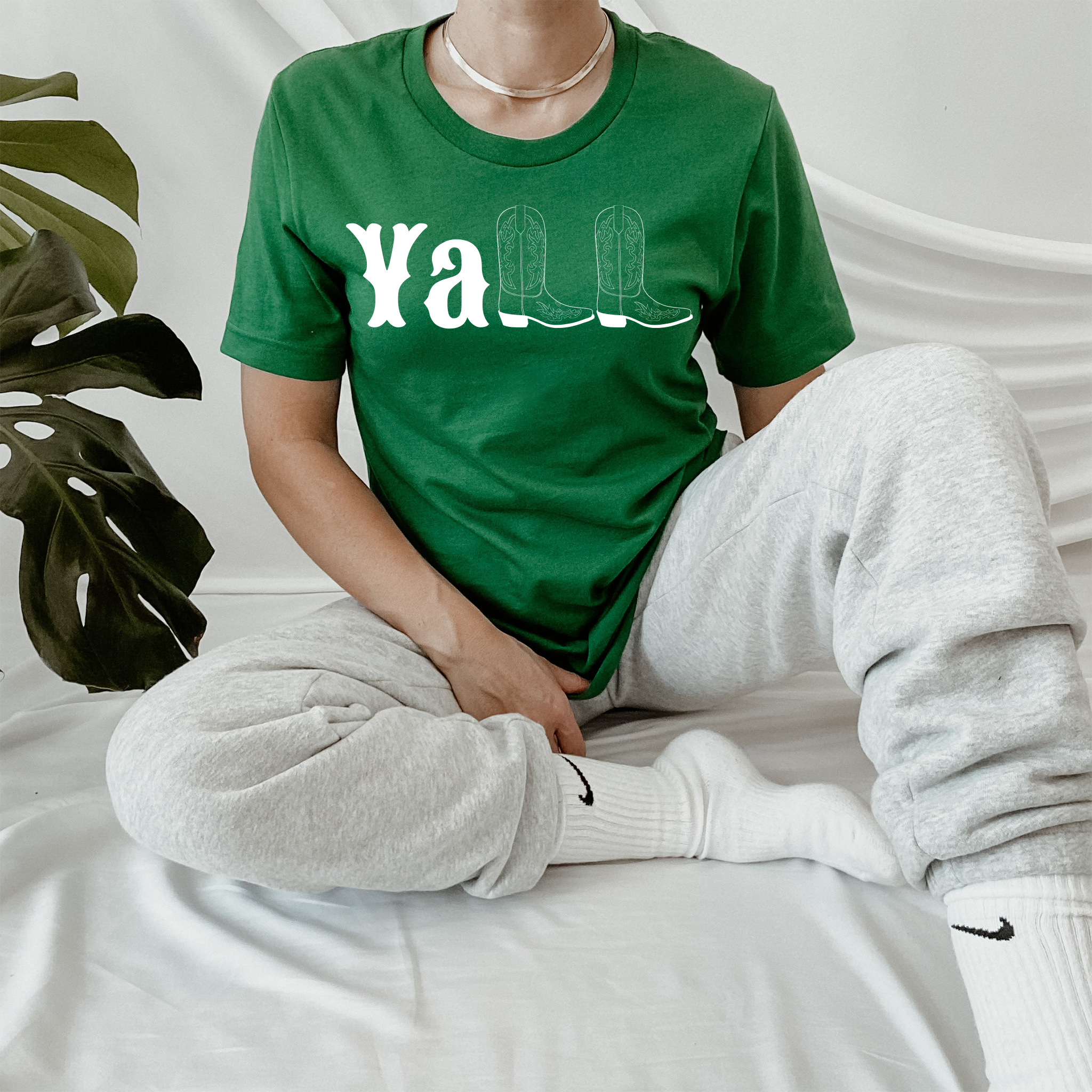 The green "Yall" St. Patrick's Day t-shirt and western boots combo is the perfect way to show off your Irish pride in style. The t-shirt features a bold "Yall" print in either black or white with western boots.They are available in a range of sizes and are designed for both comfort and durability.
